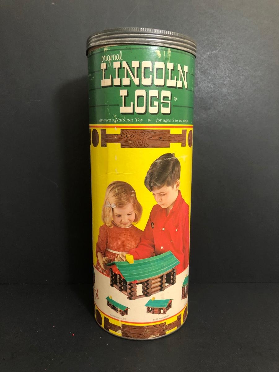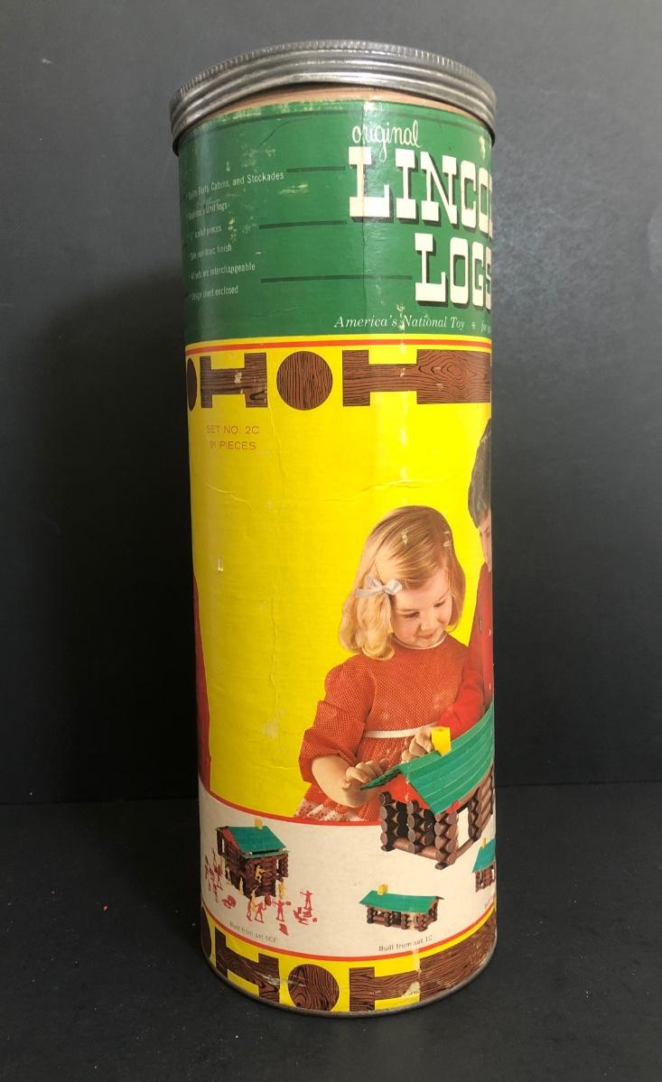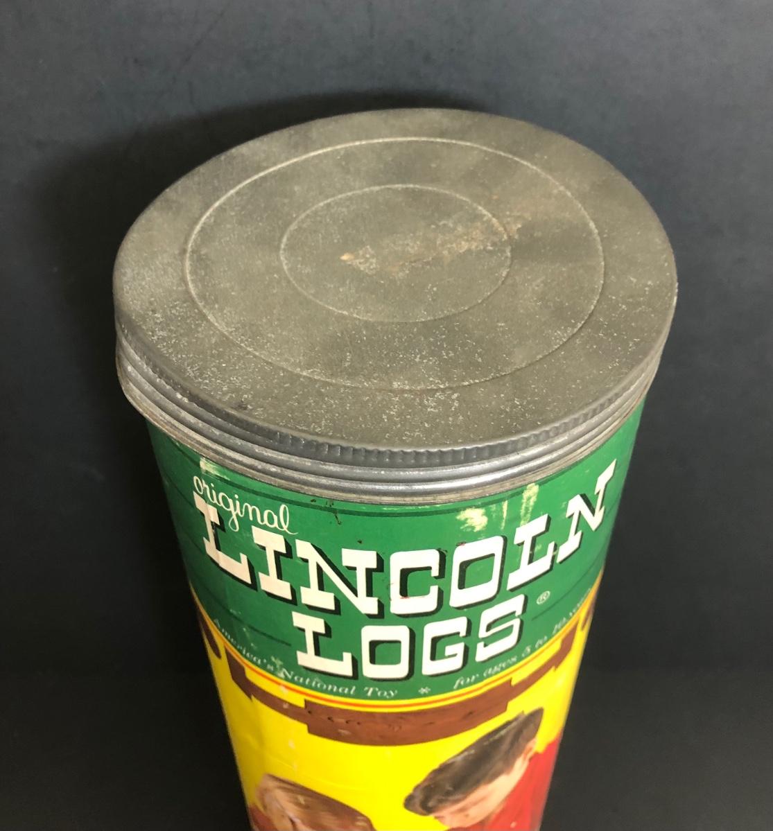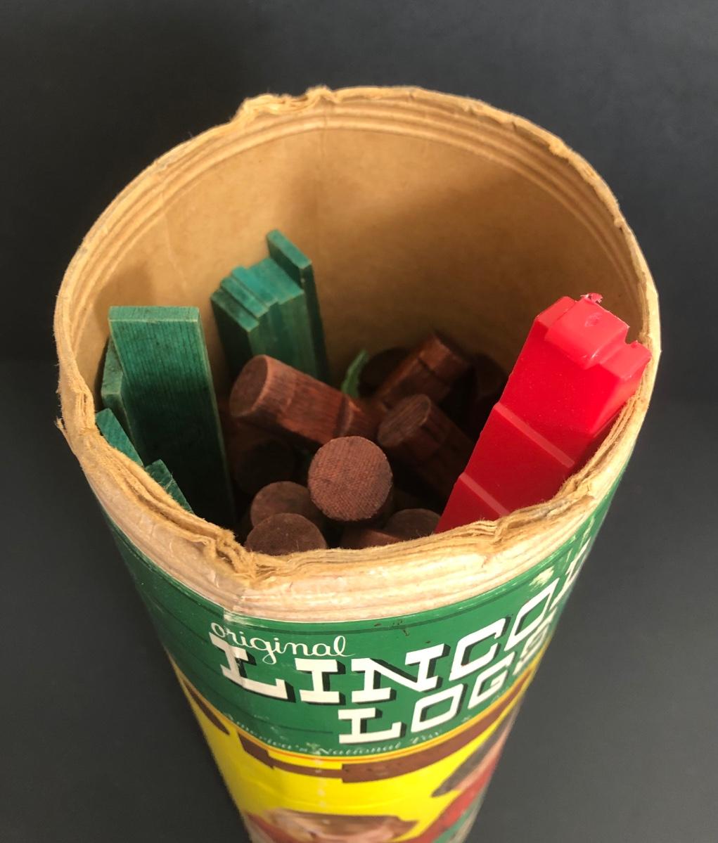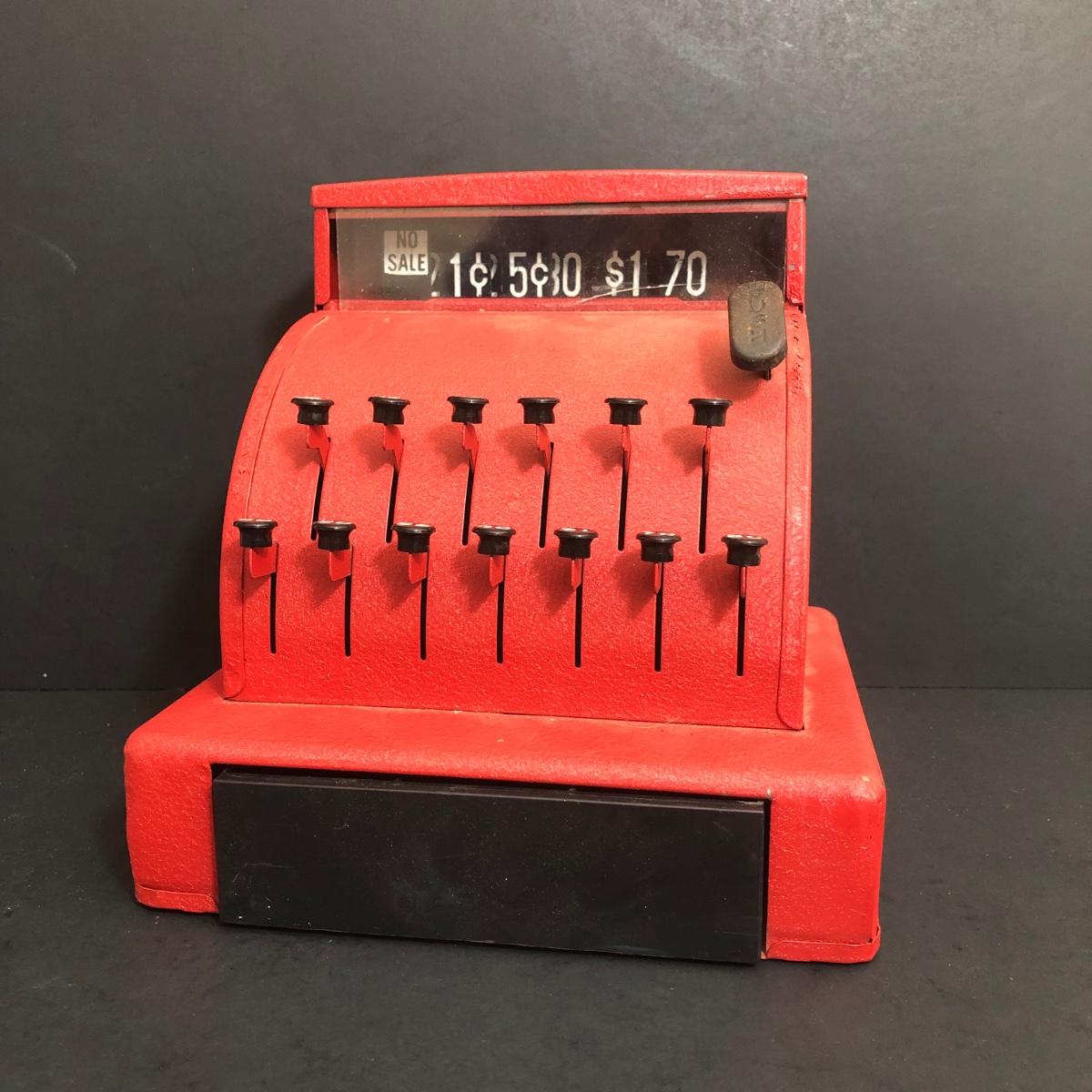 LOT 12A: Vintage Red Metal Cash Register, Vintage Lincoln Logs Tube w/ Wooden Pieces & Variety of Small Plastic Toys