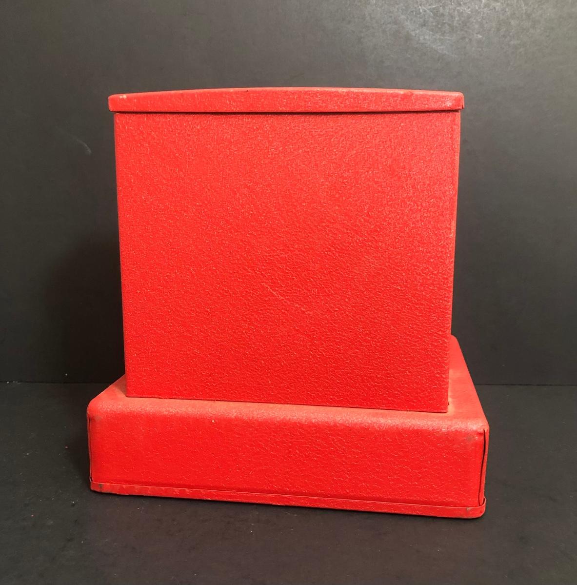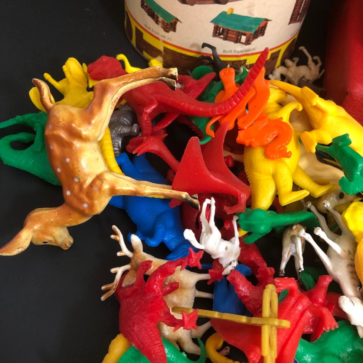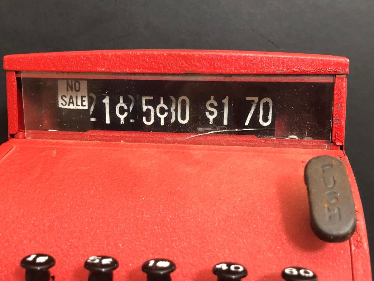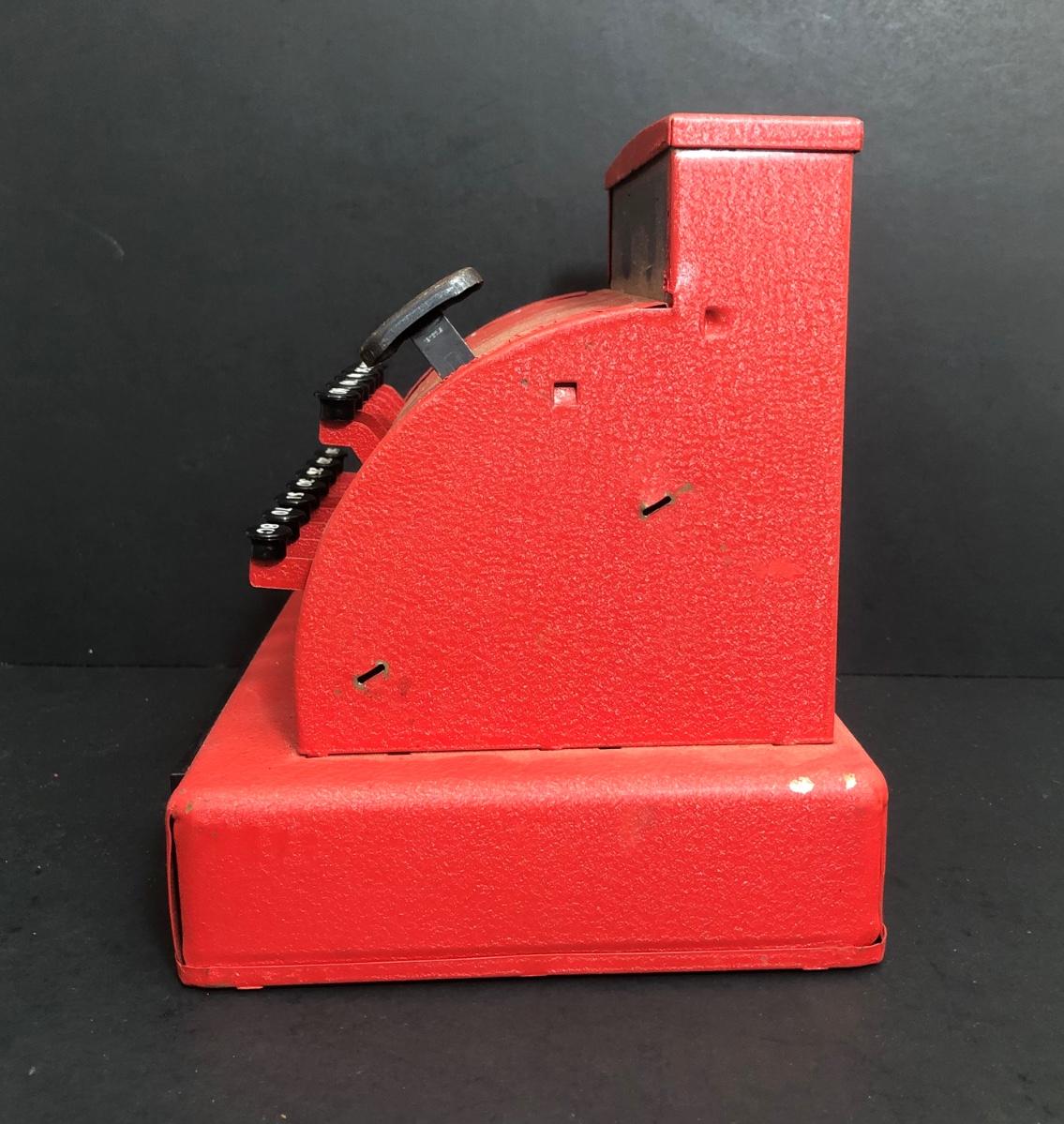LOT 12A: Vintage Red Metal Cash Register, Vintage Lincoln Logs Tube w/ Wooden Pieces & Variety of Small Plastic Toys