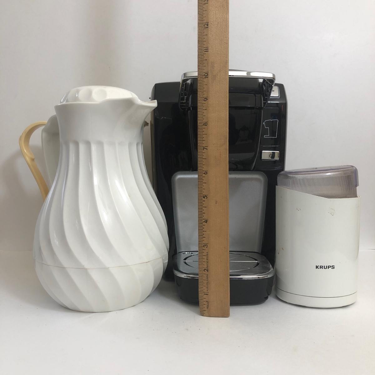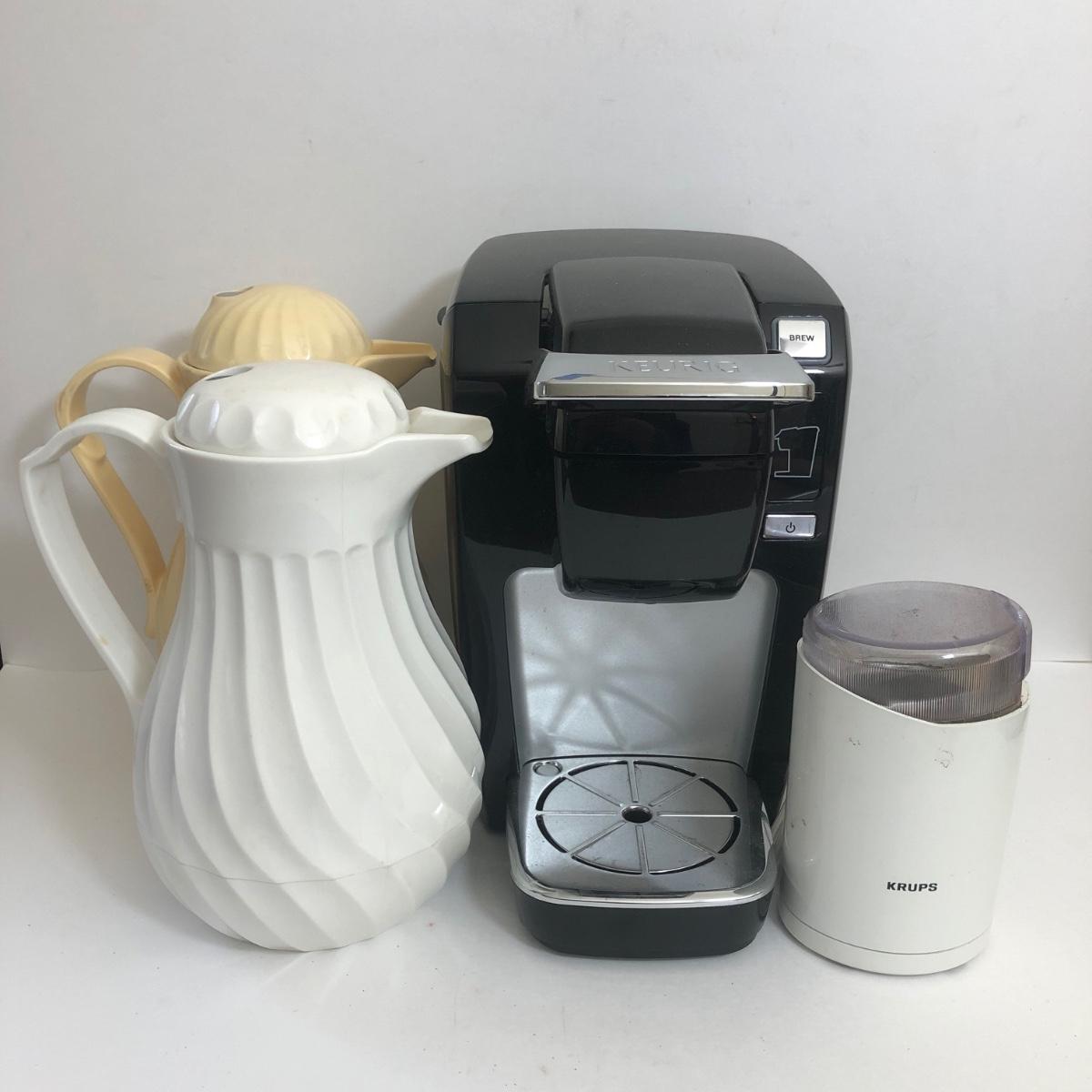 LOT 24A: Keurig K10 Coffee Maker, Krups Household Coffee Mill Type 208B, 1986 Thermos Carafe & Connoisserve 8cup Carafe