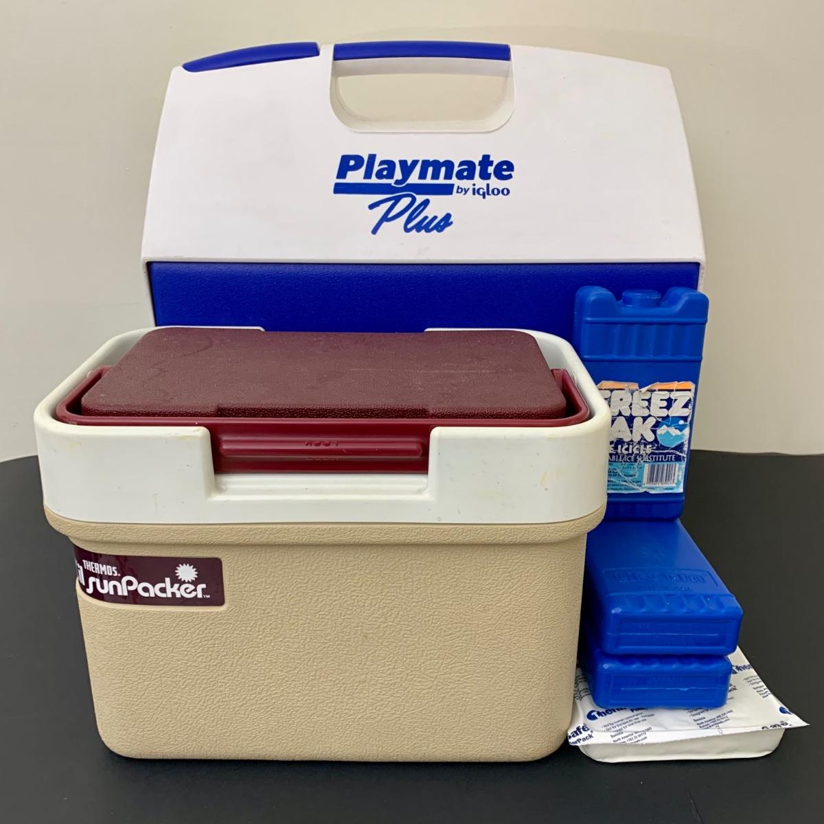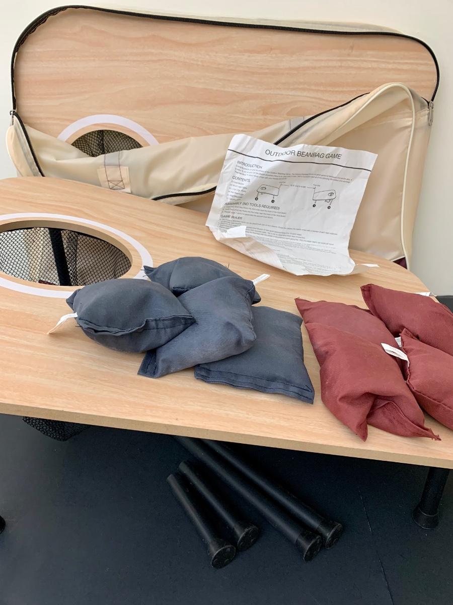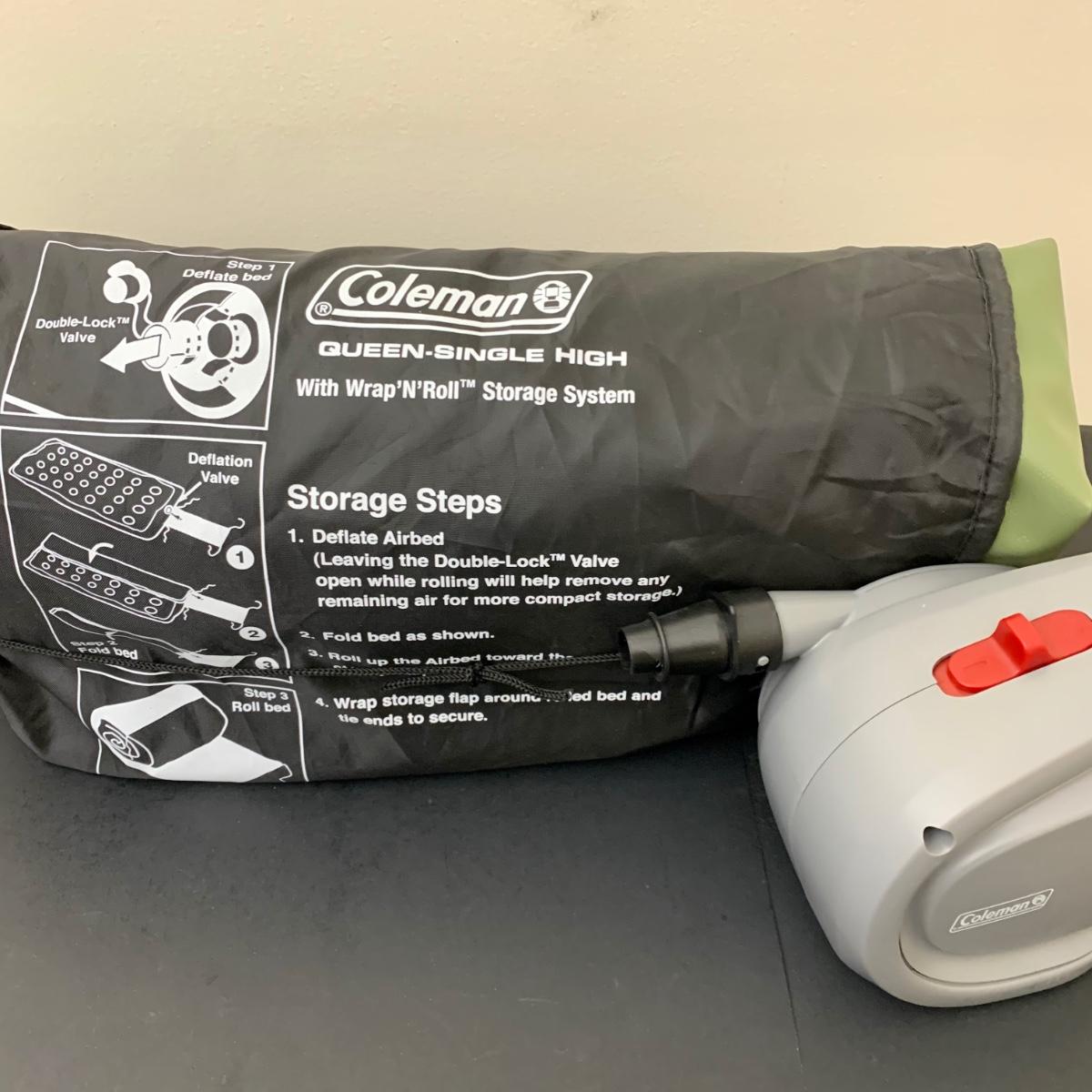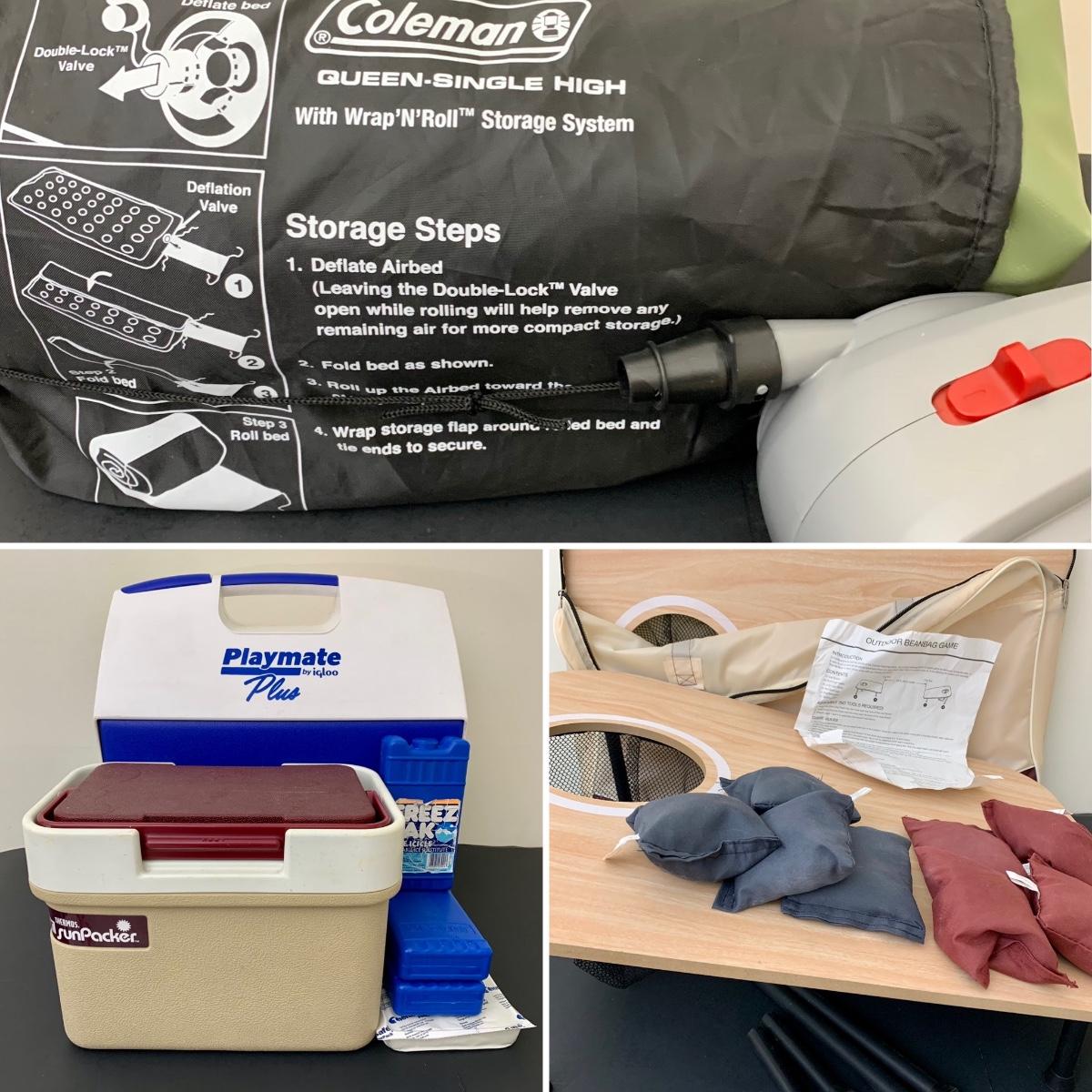 LOT 46 A: Coleman Queen Air Mattress W/ Pump, Igloo & Thermos Coolers W/ Ice Packs, & Cornhole Set W/ Travel Bag