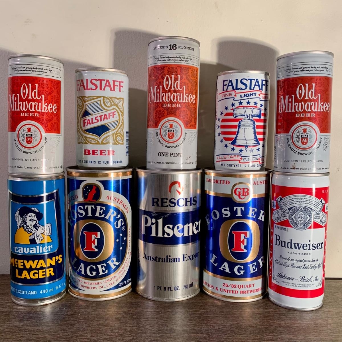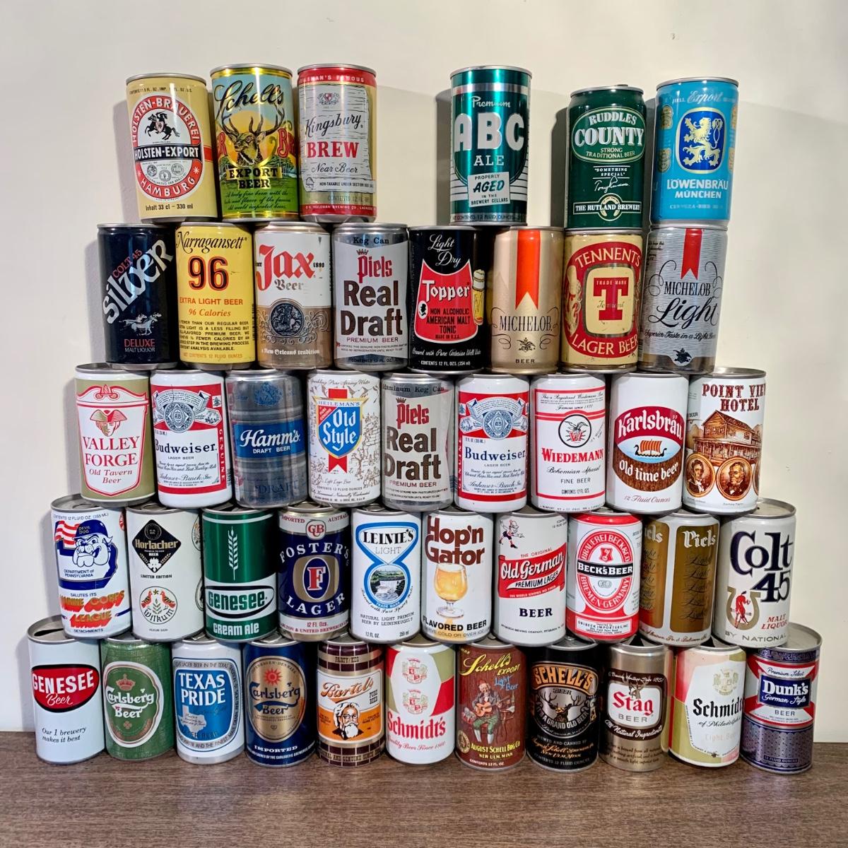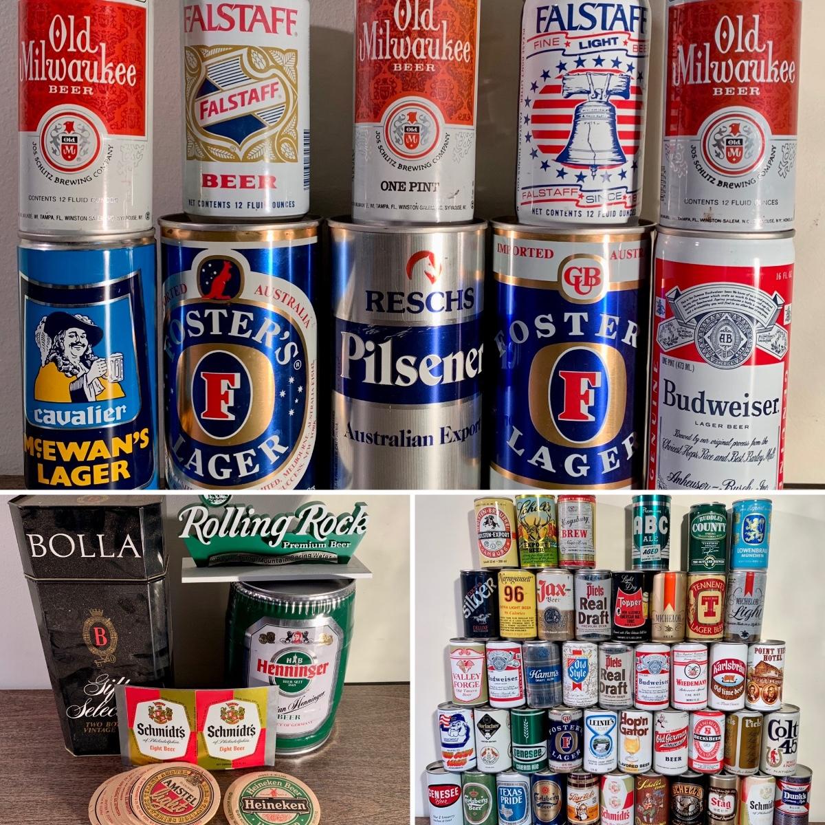LOT 52 A: Vintage Beer Can Collection: Old Milwaukee, Falstaff, Old Style, Schell's, Schmidt's, Small Rolling Rock Sign & More