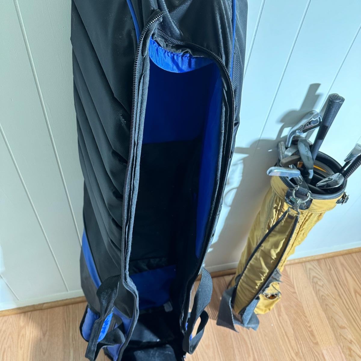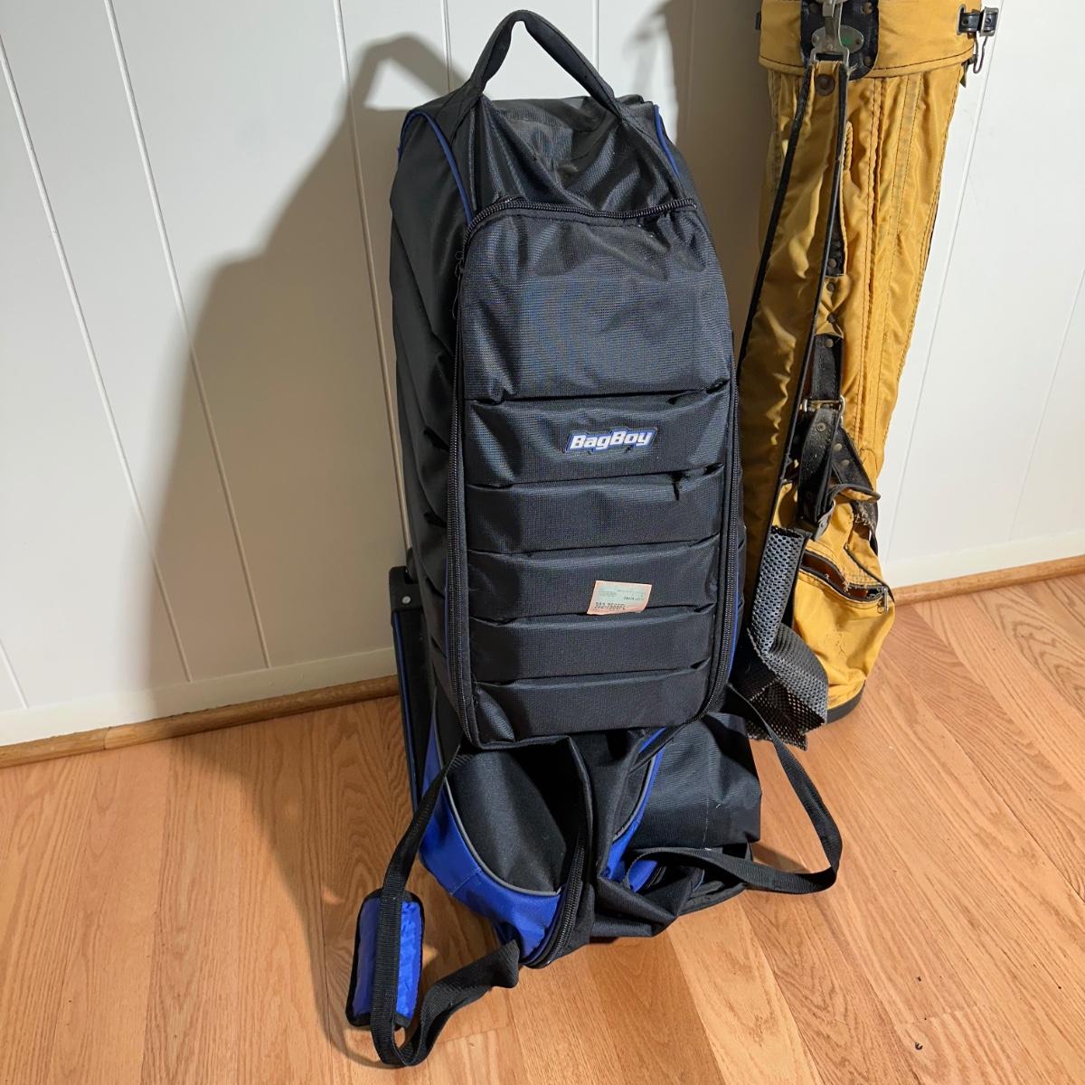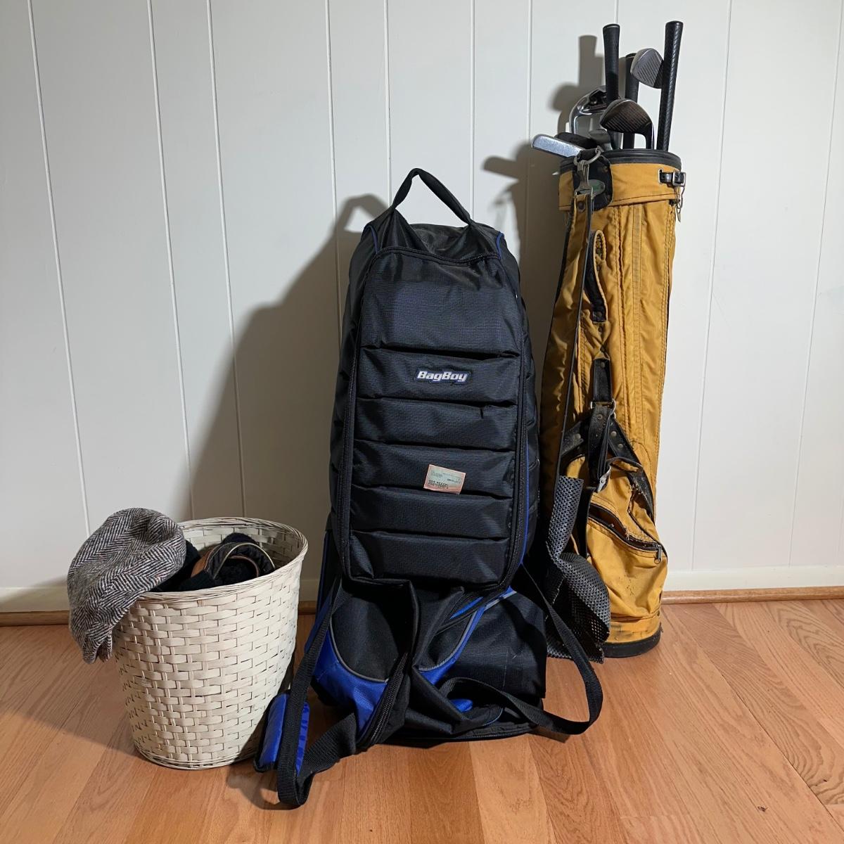 LOT 93F: Golf Collection - Vintage Austad Golf Bag, BagBoy Travel Bag, Socks & Assorted Clubs