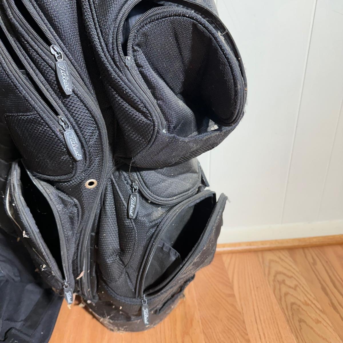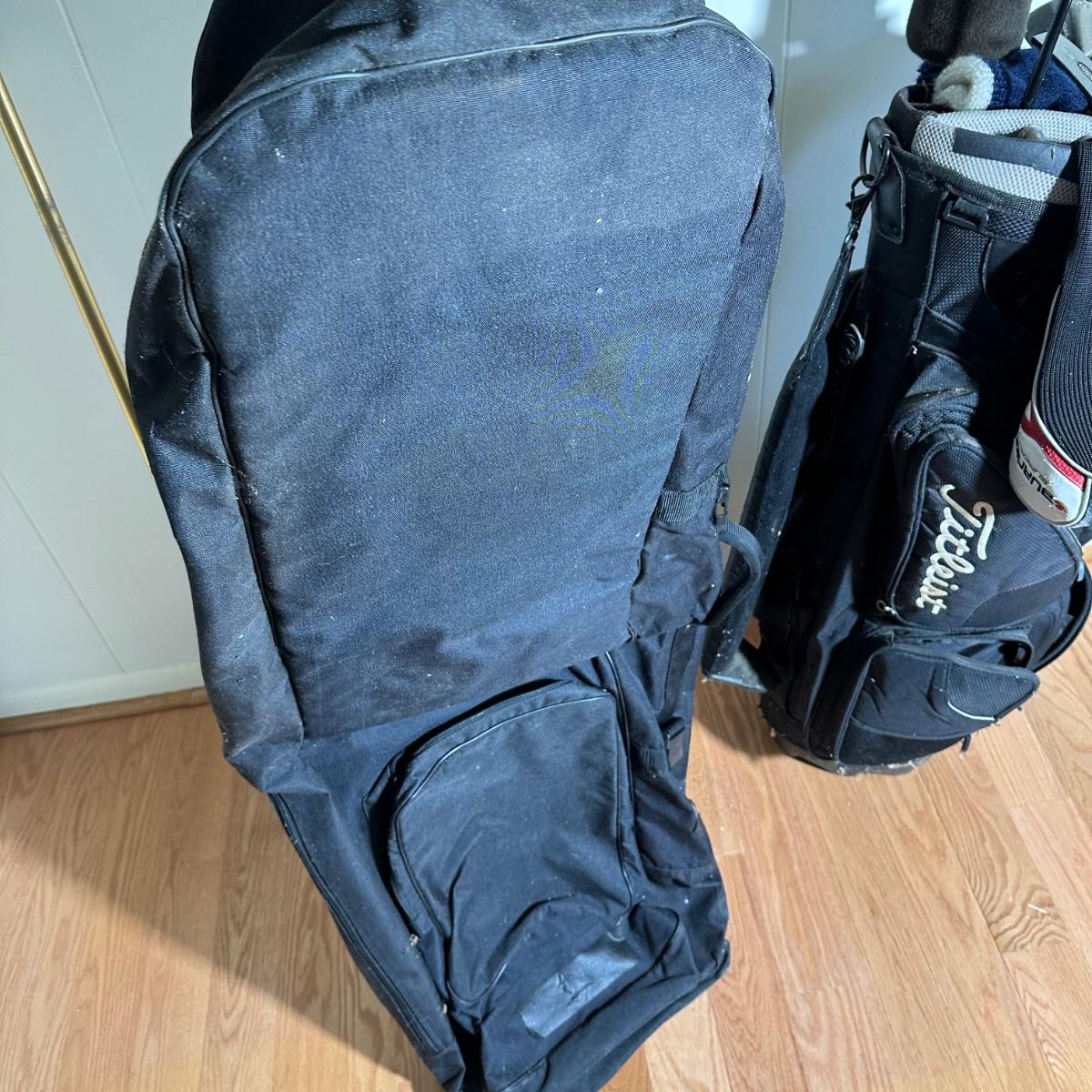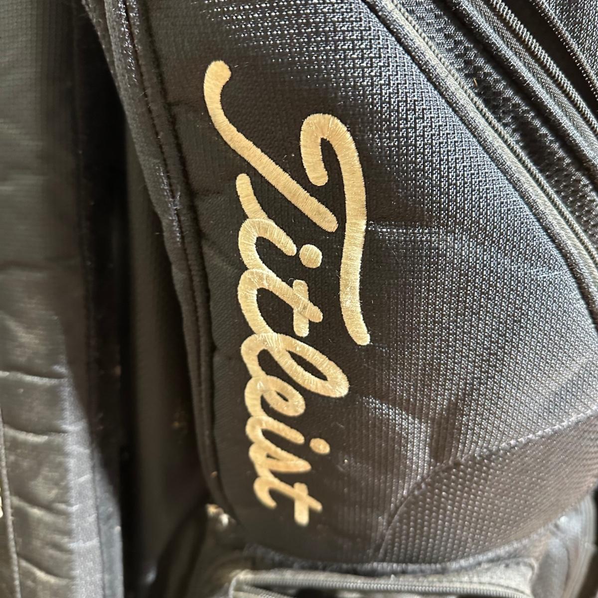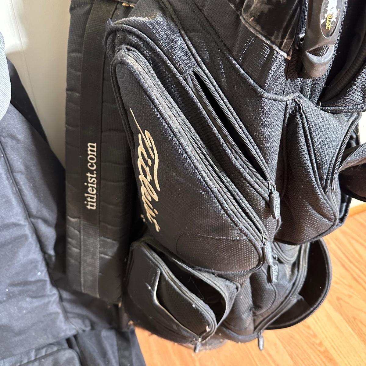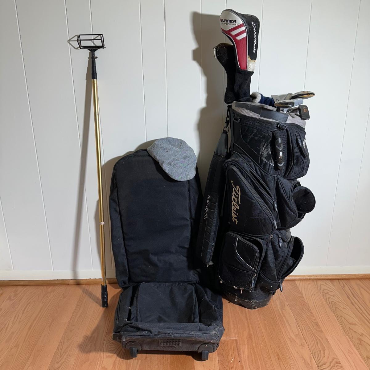 LOT 95F: Titleist Golf Bag, Assorted Clubs, Travel Bag & More