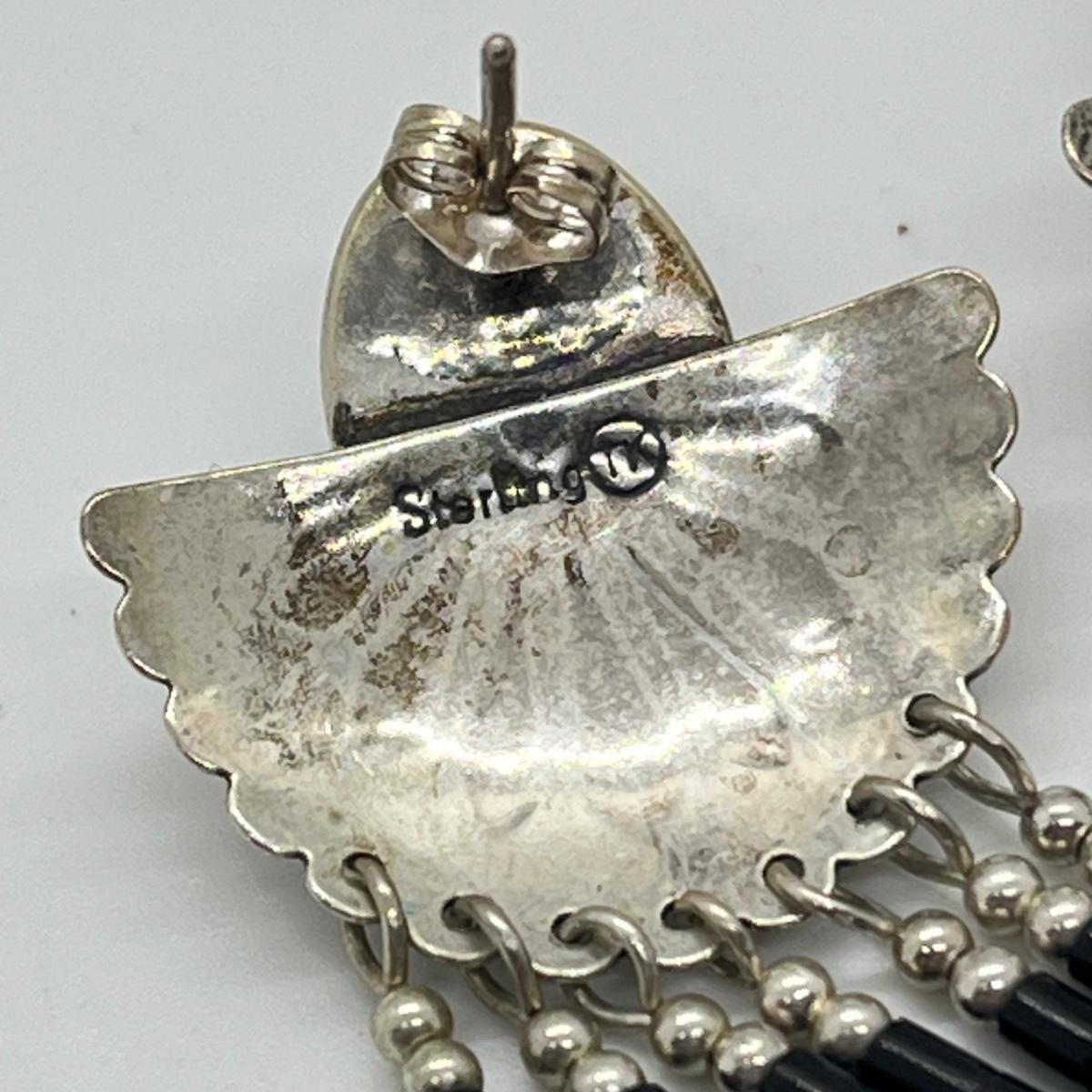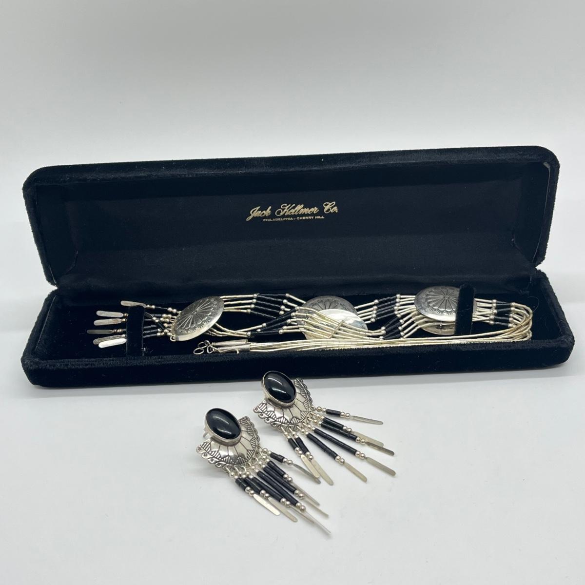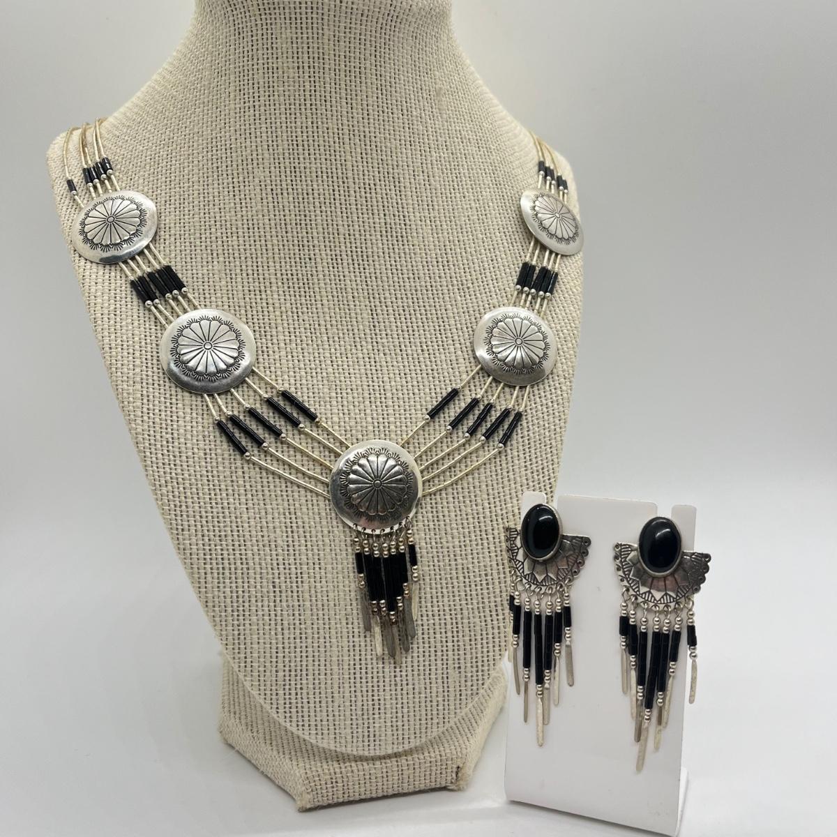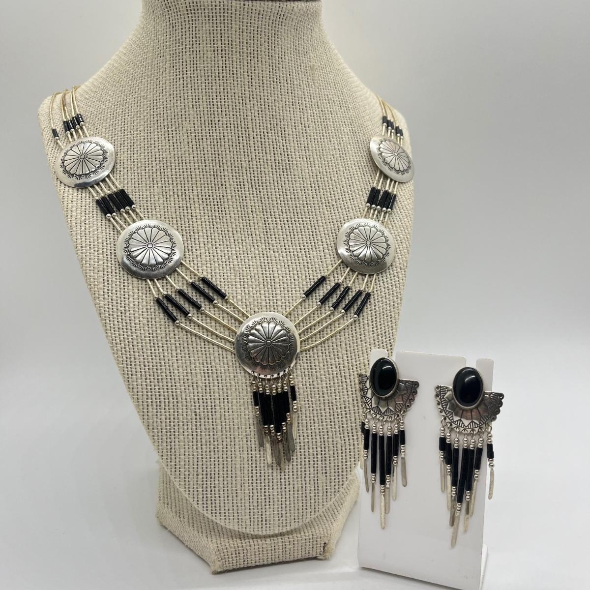 LOT 191J: Native American Sterling Silver and Onyx Jewelry Set - 23” Necklace and Matching Earrings