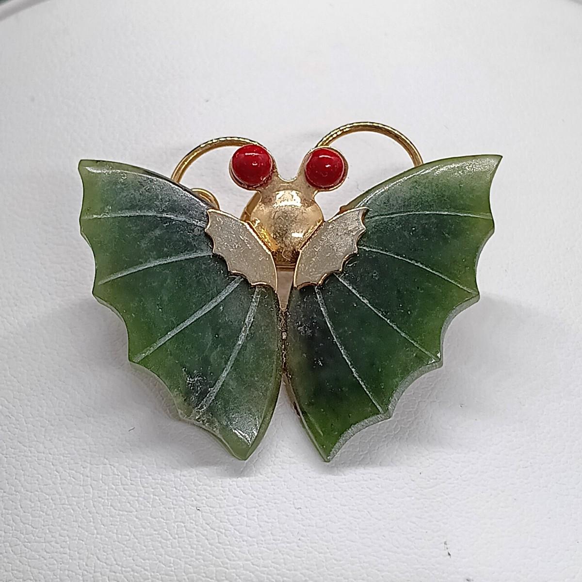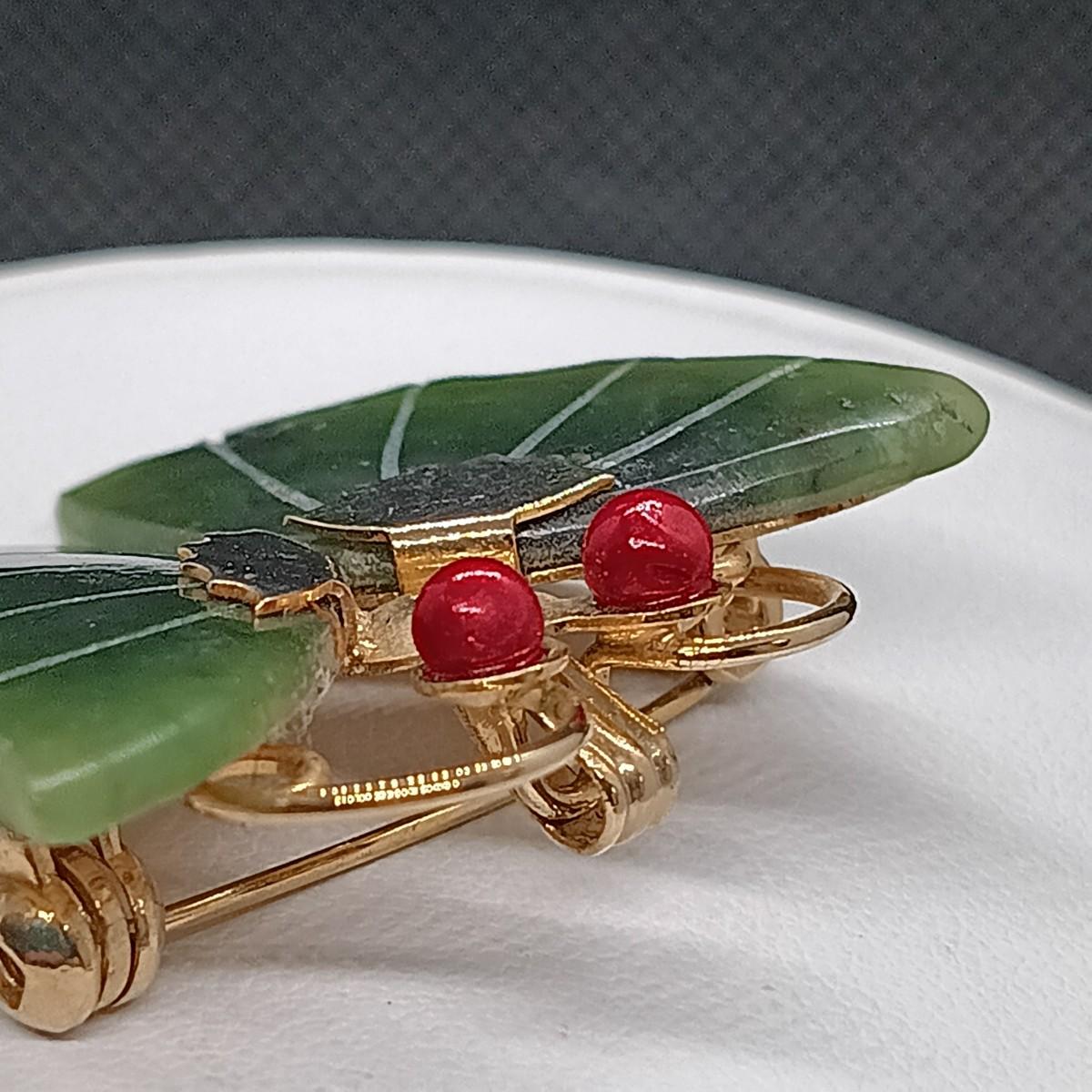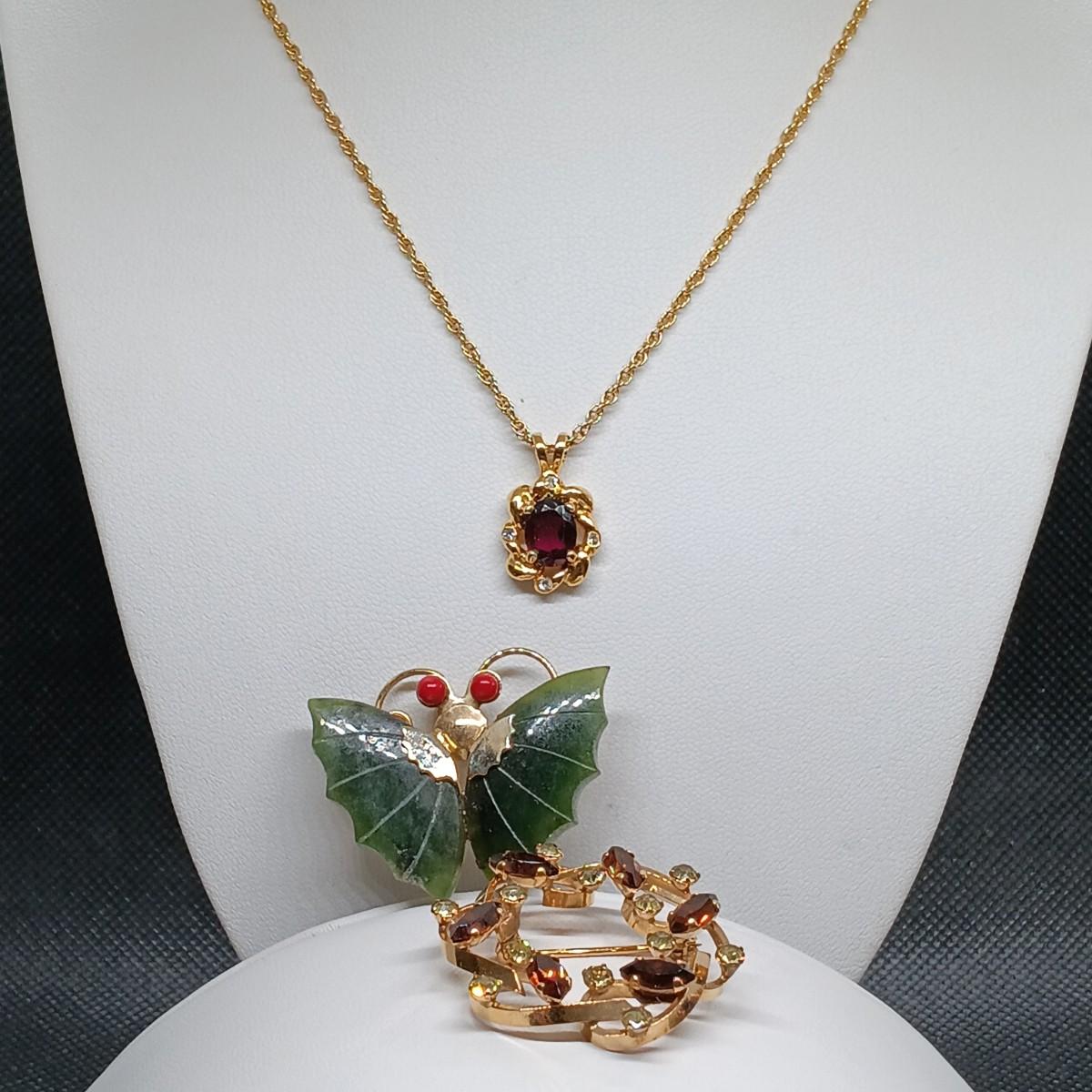 LOT 7: Vintage Coral & Jade Butterfly Brooch: Van Dell Gold-filled Rhinestone Garland Brooch: Gold Tone Faux Garnet Necklace
