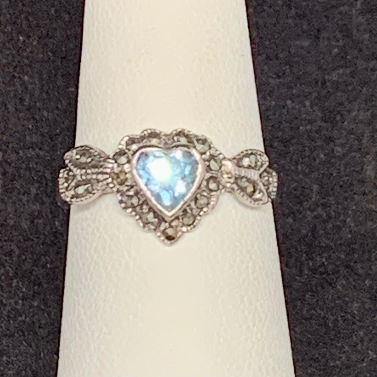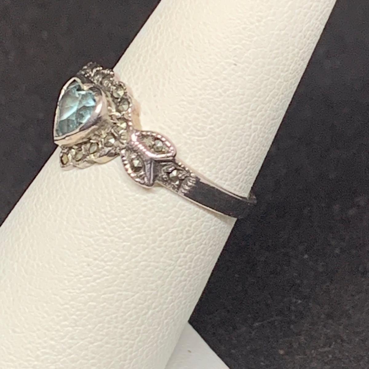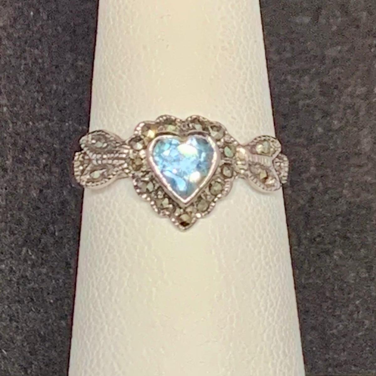 LOT:38: Heart Shaped Marcasite and Blue Topaz Sterling Silver Ring Size 7