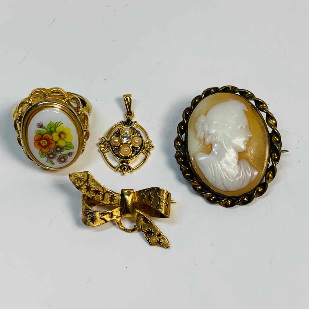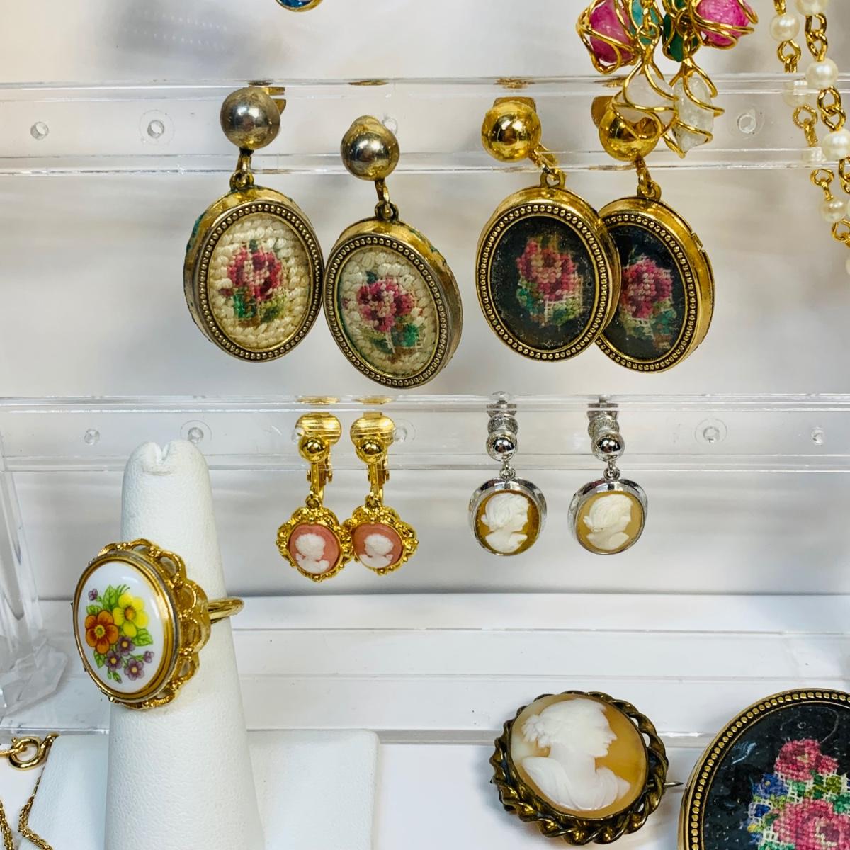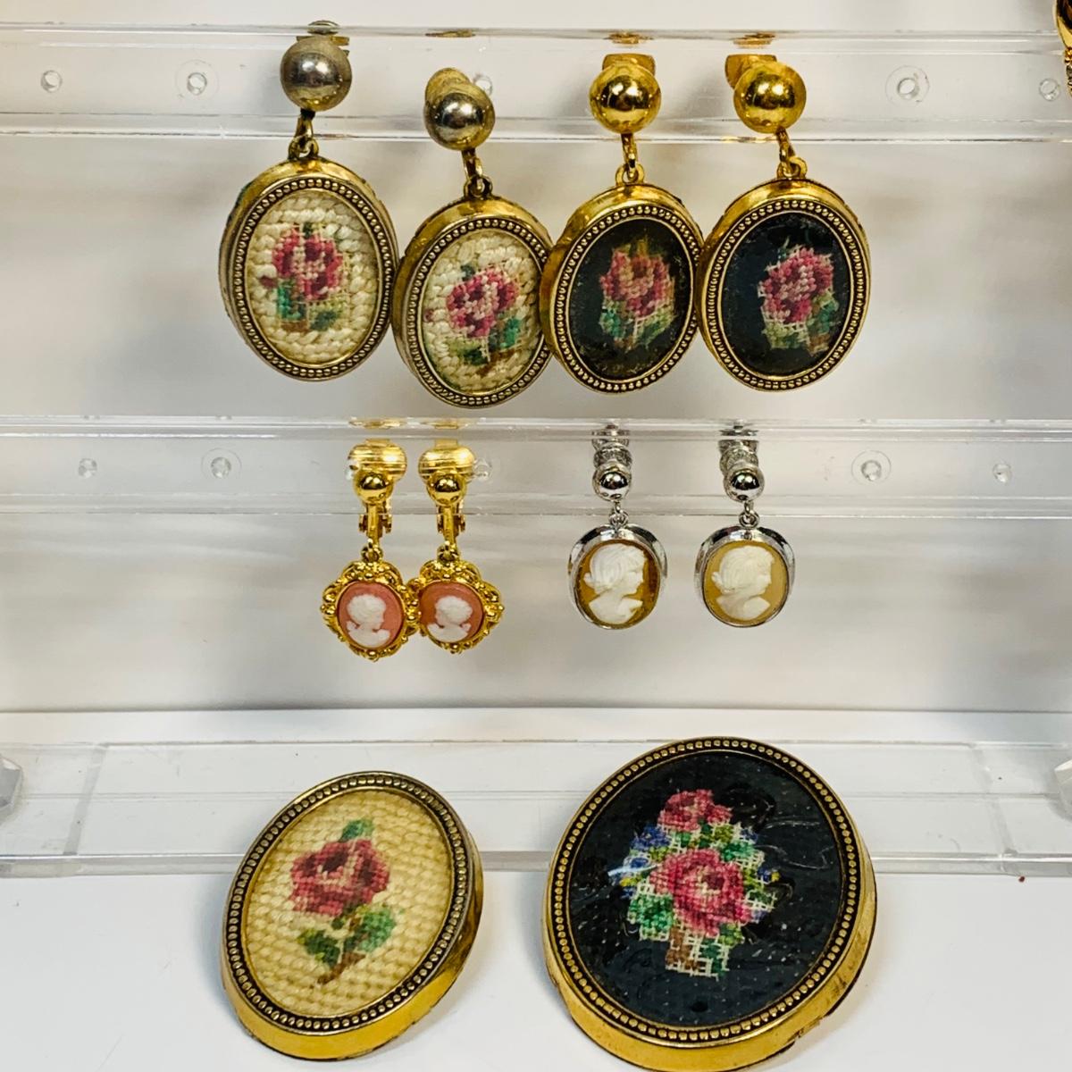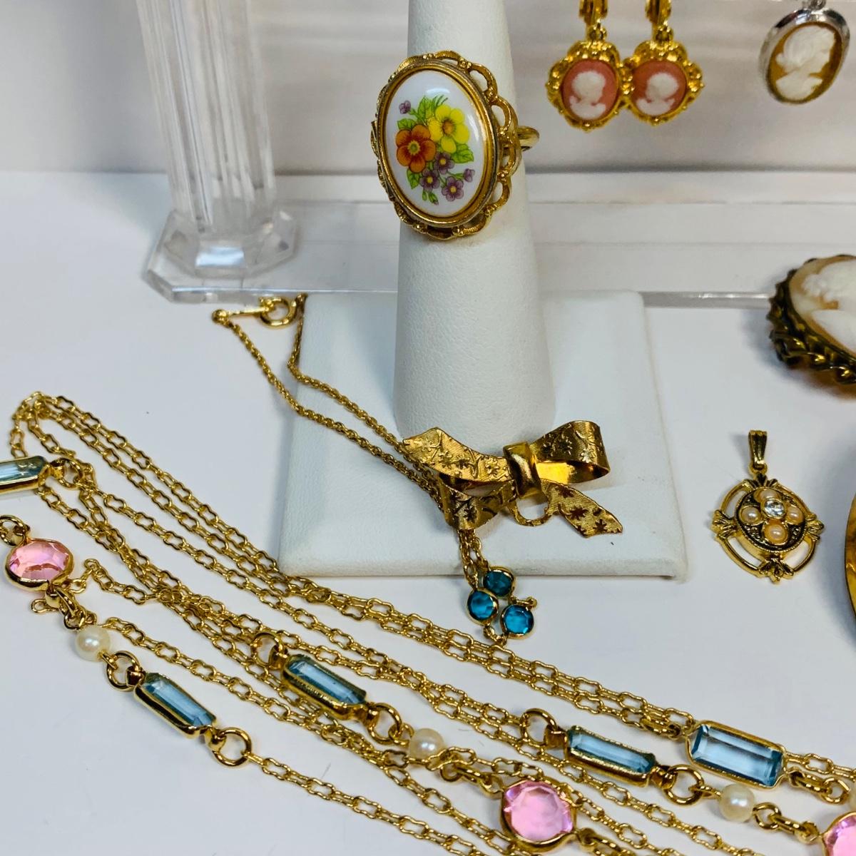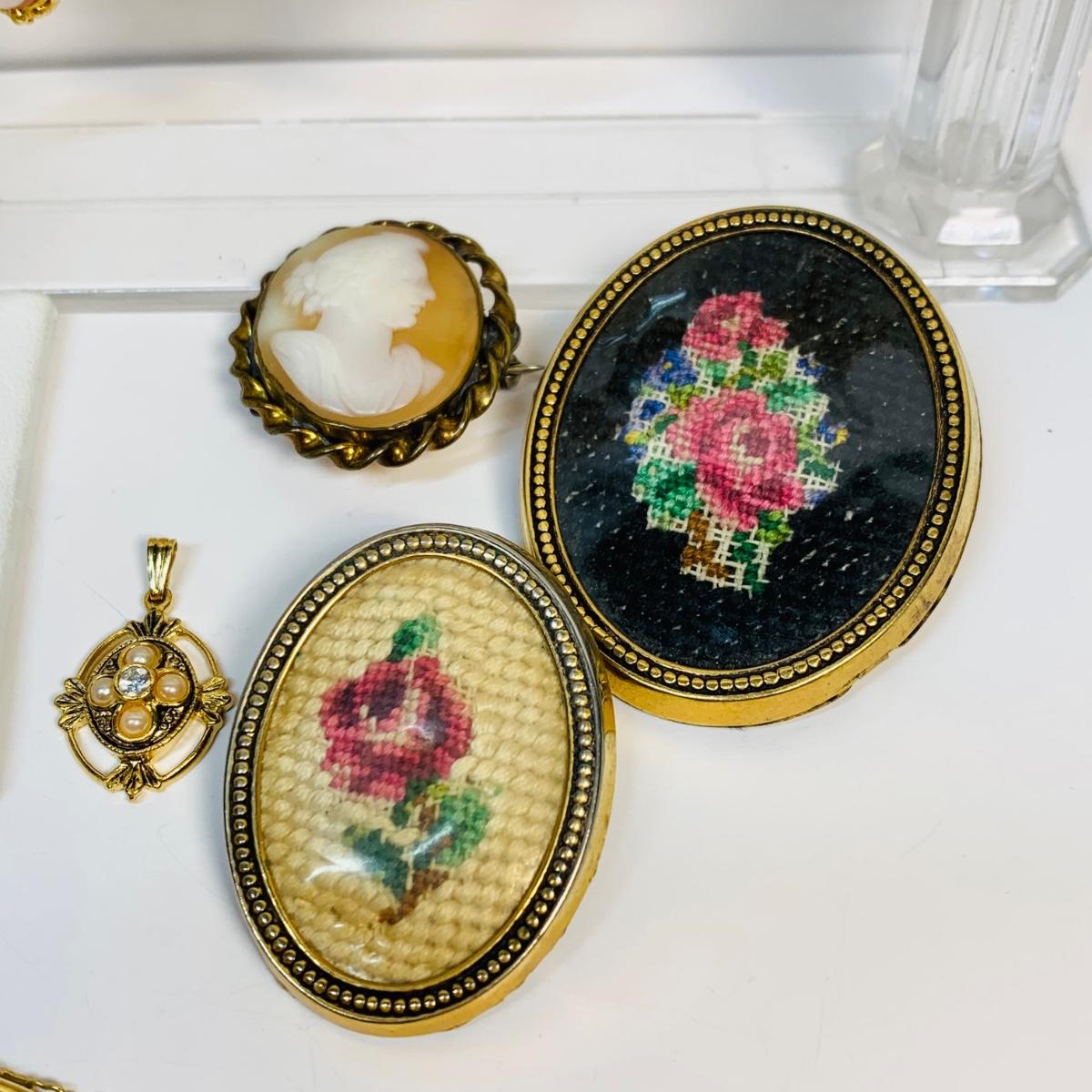 LOT 75: Gold Tone Collection: Needle Point Brooches & Clip-On Dangle Earrings, Bracelets: Napier, Avon & More