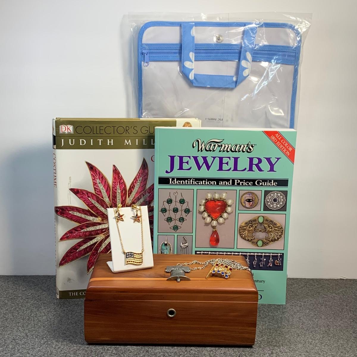 LOT 80: Miniature Lane Cedar Chest, Red/White/Blue Fashion Jewelry, Warman's Jewelry Book, Judith Miller Costume Jewelry Book & More
