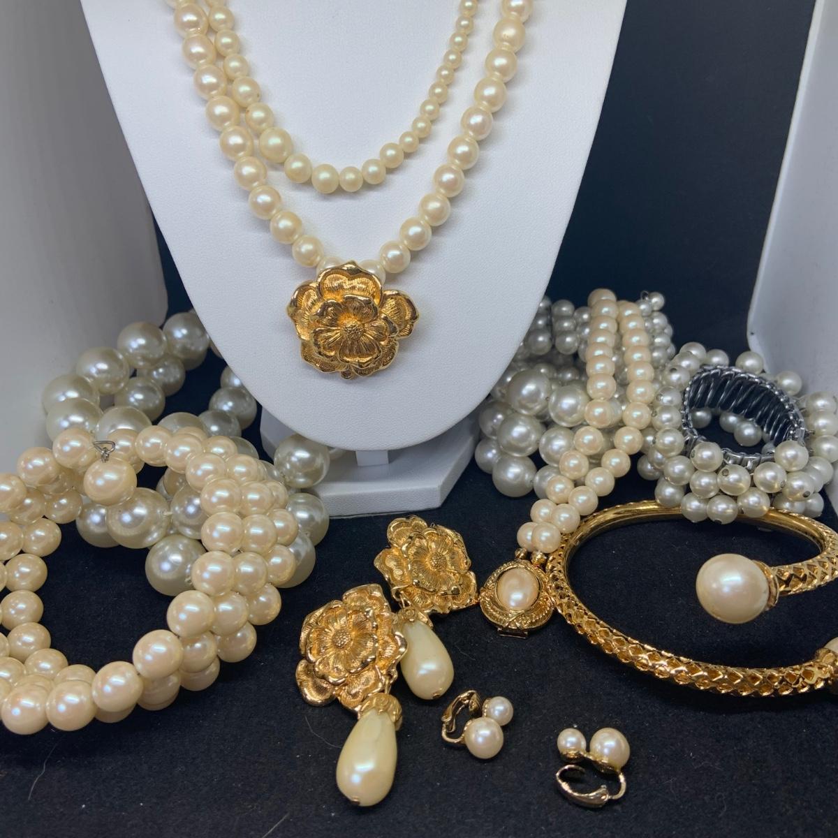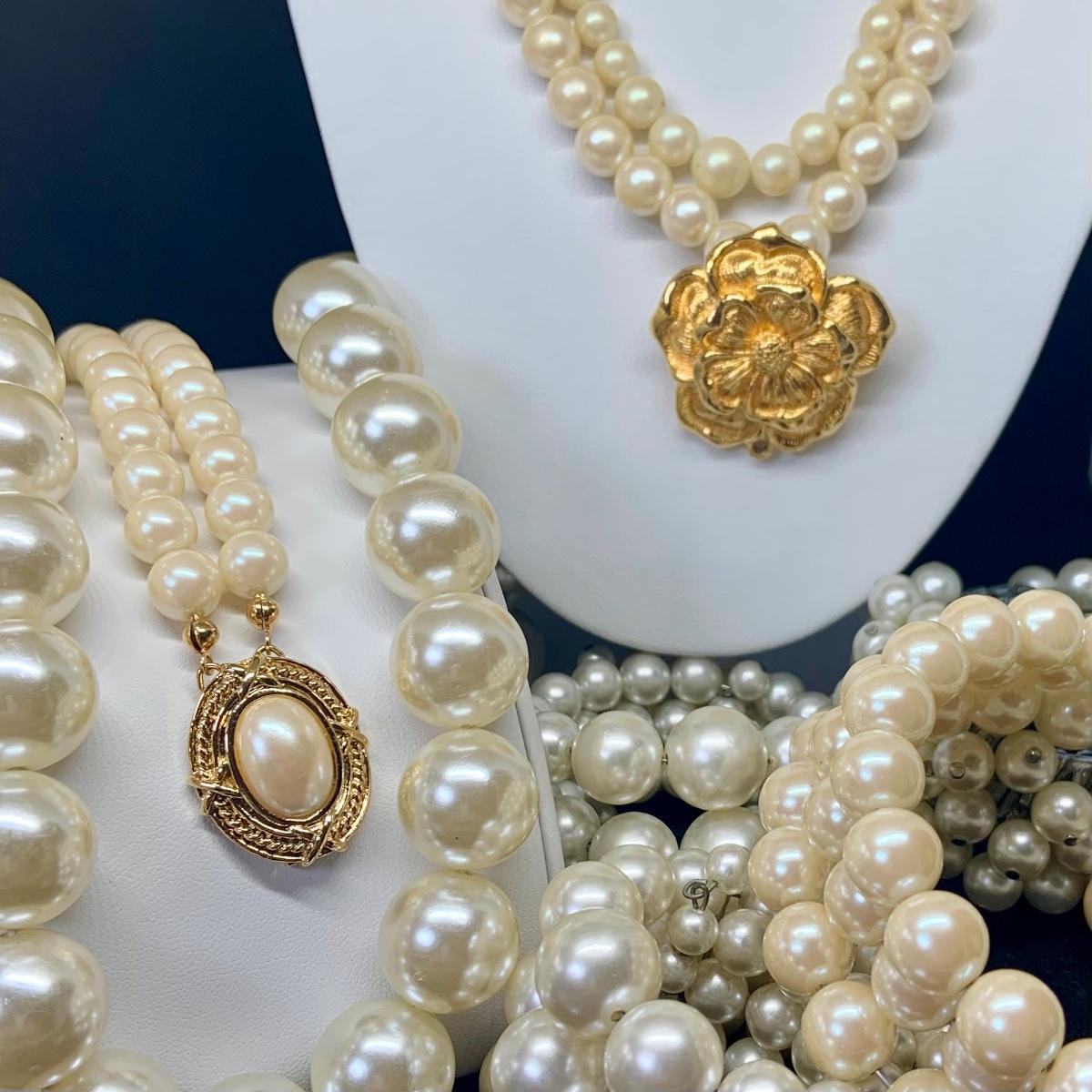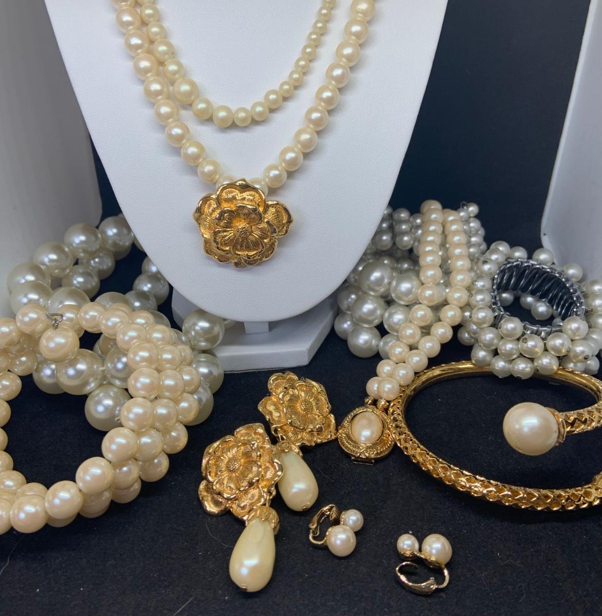 LOT:112: Large Selection of Faux Pearl Jewelry - Braclet, Necklaces, and Clip-on Earrings.