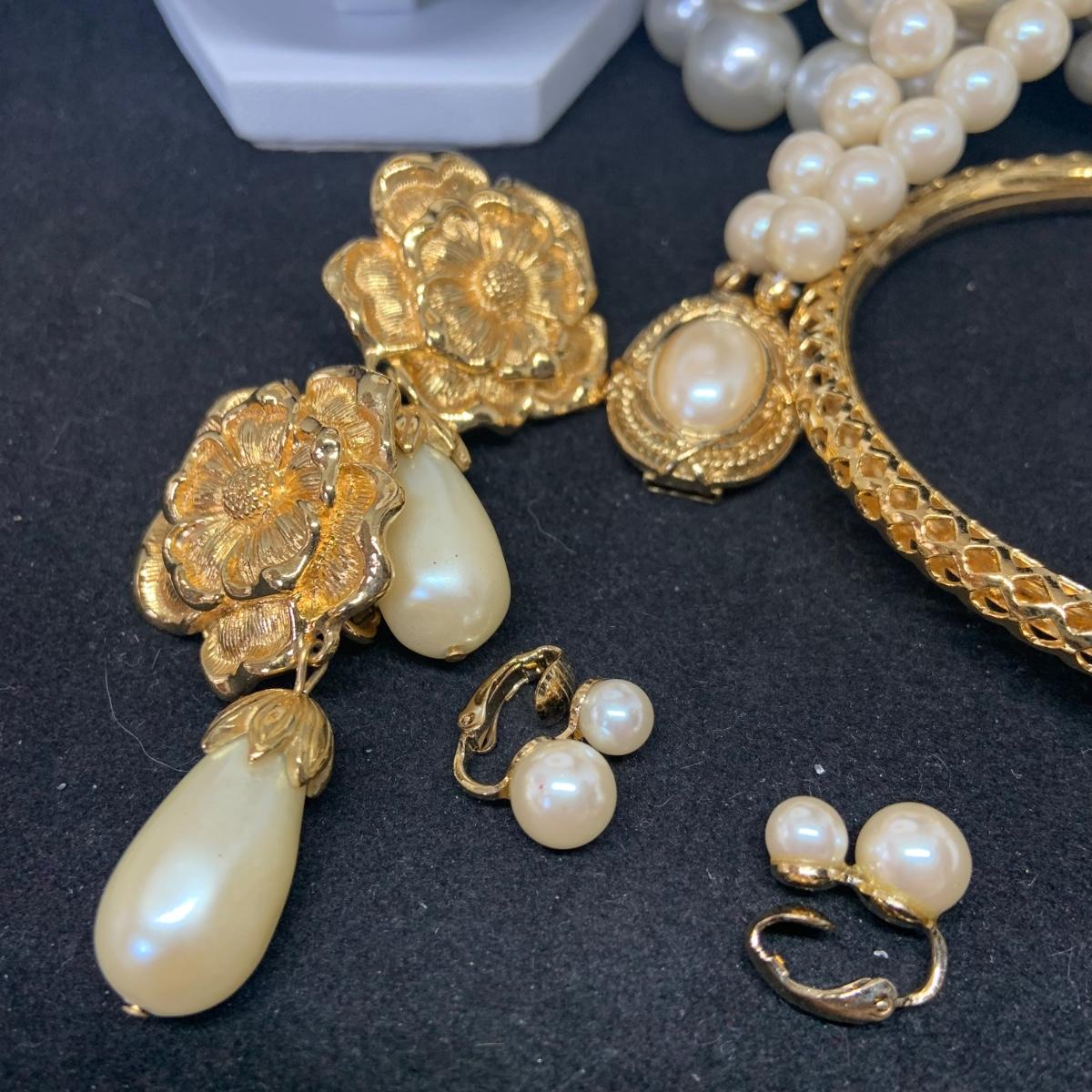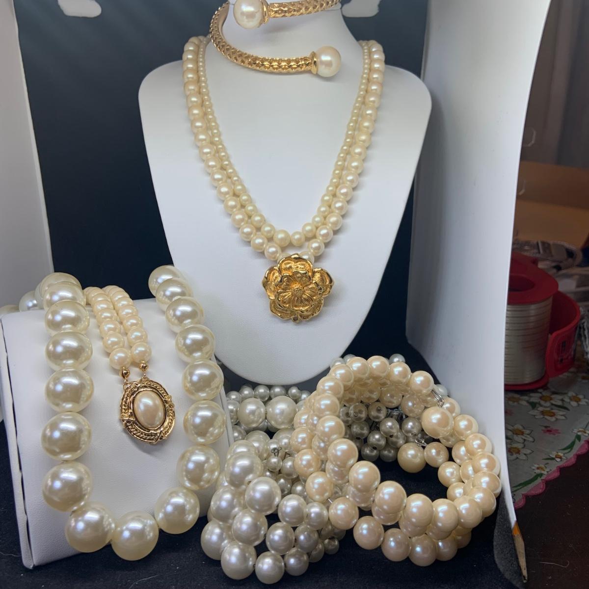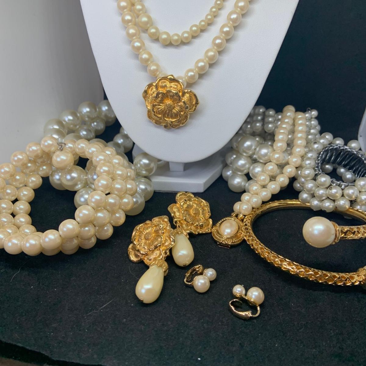 LOT:112: Large Selection of Faux Pearl Jewelry - Braclet, Necklaces, and Clip-on Earrings.