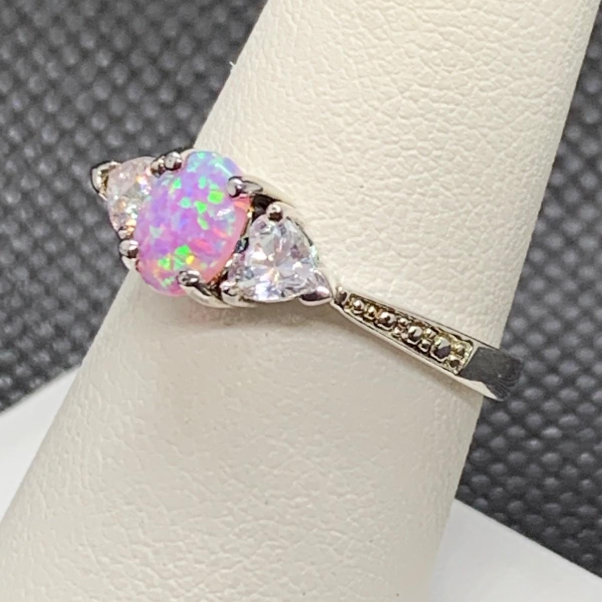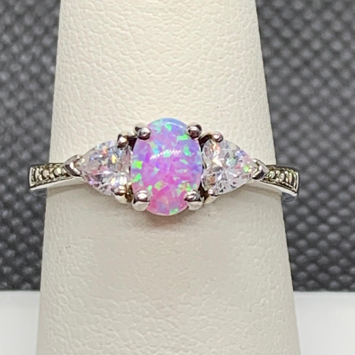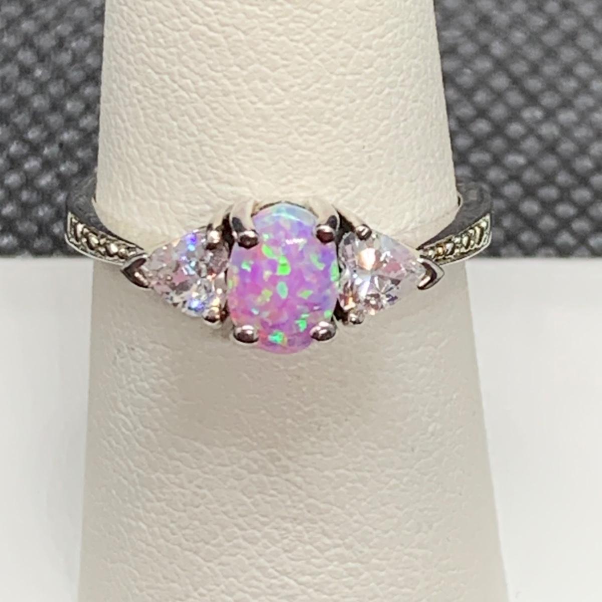 LOT 161: Sterling Silver (925) Lab Created Pink Opal & CZ Ring, Sz 8