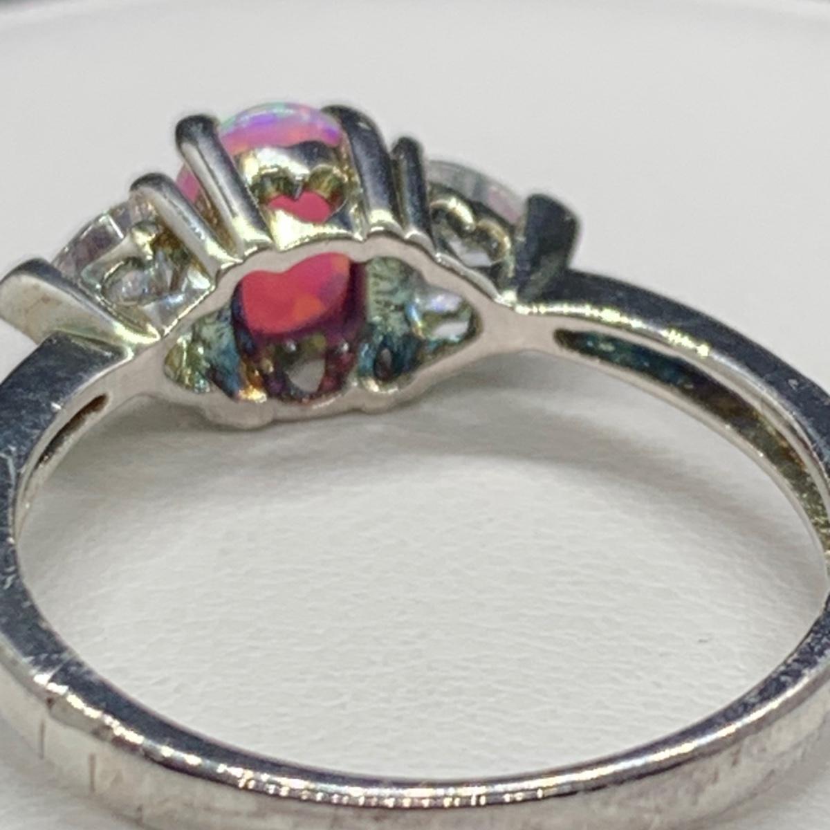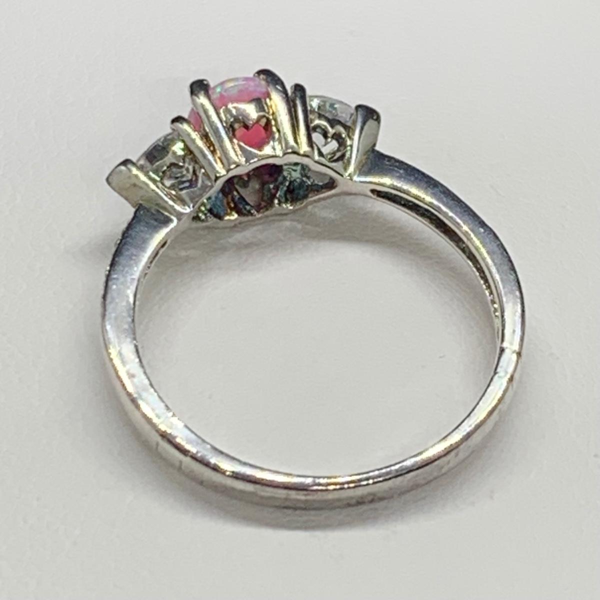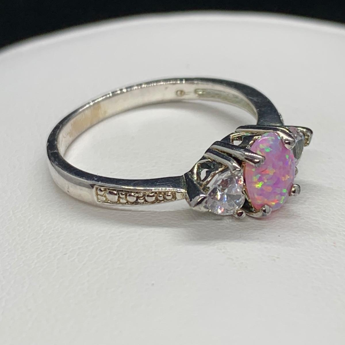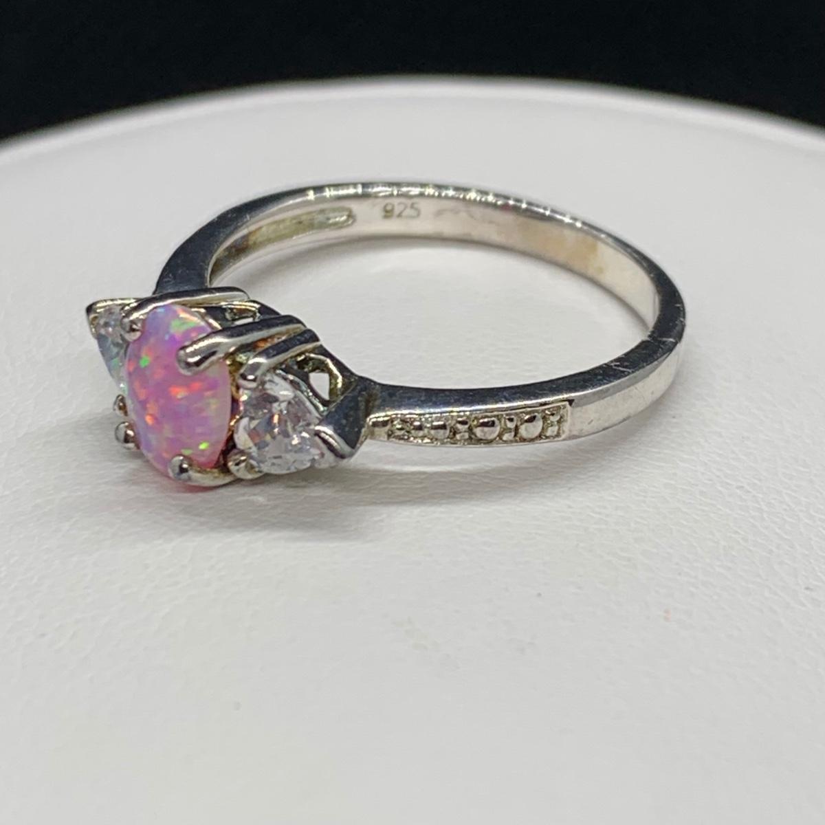 LOT 161: Sterling Silver (925) Lab Created Pink Opal & CZ Ring, Sz 8