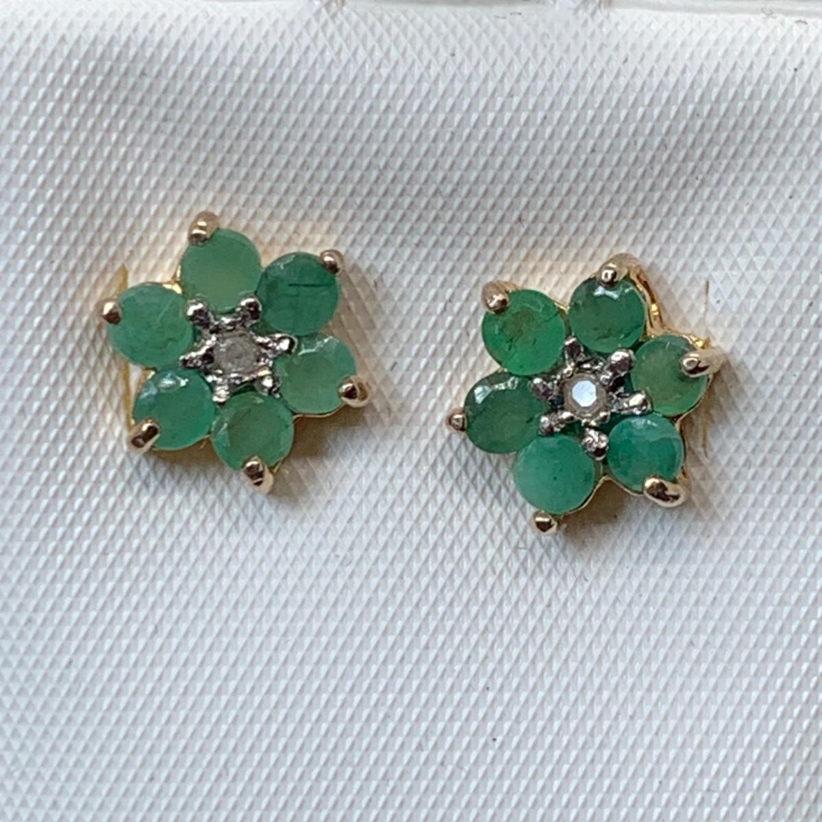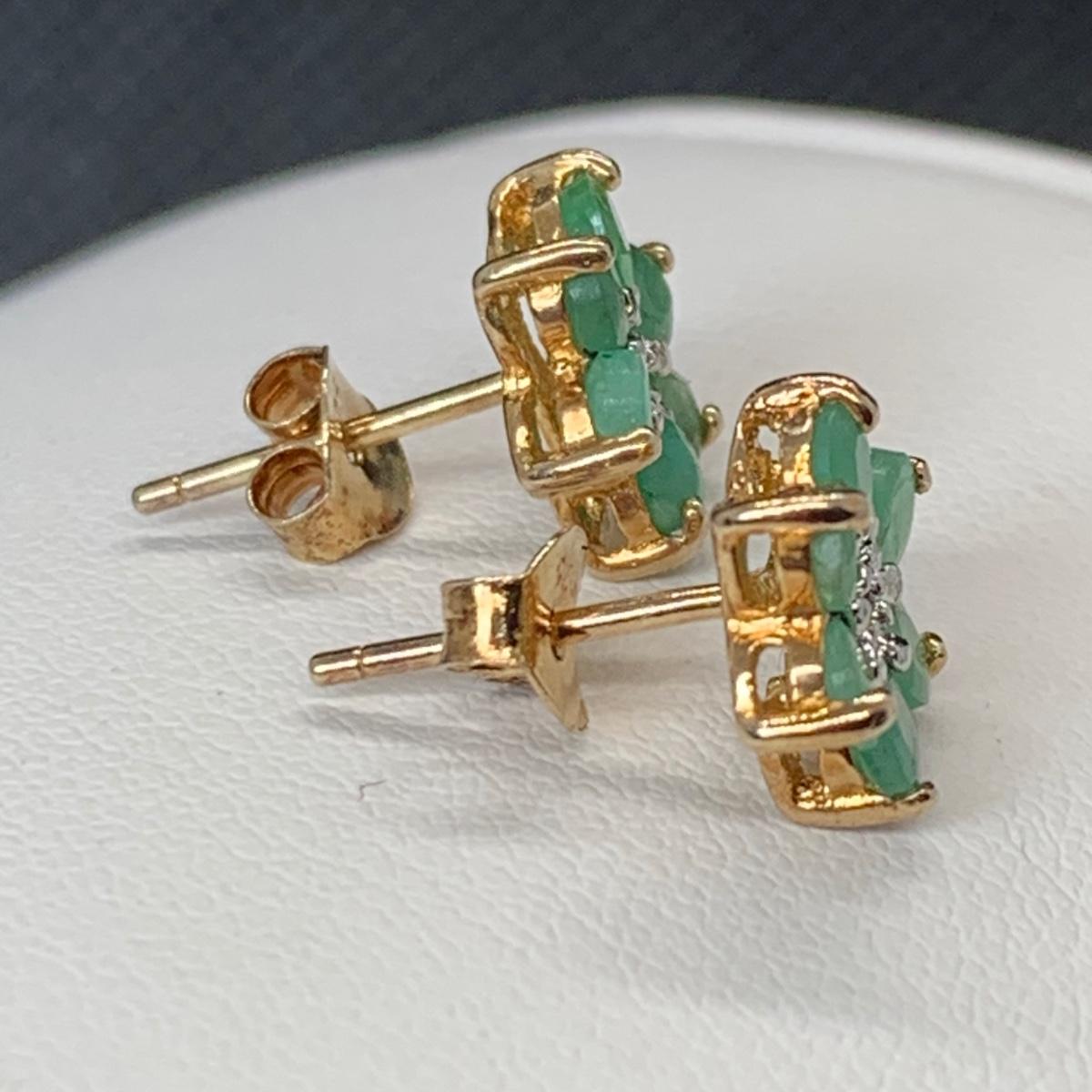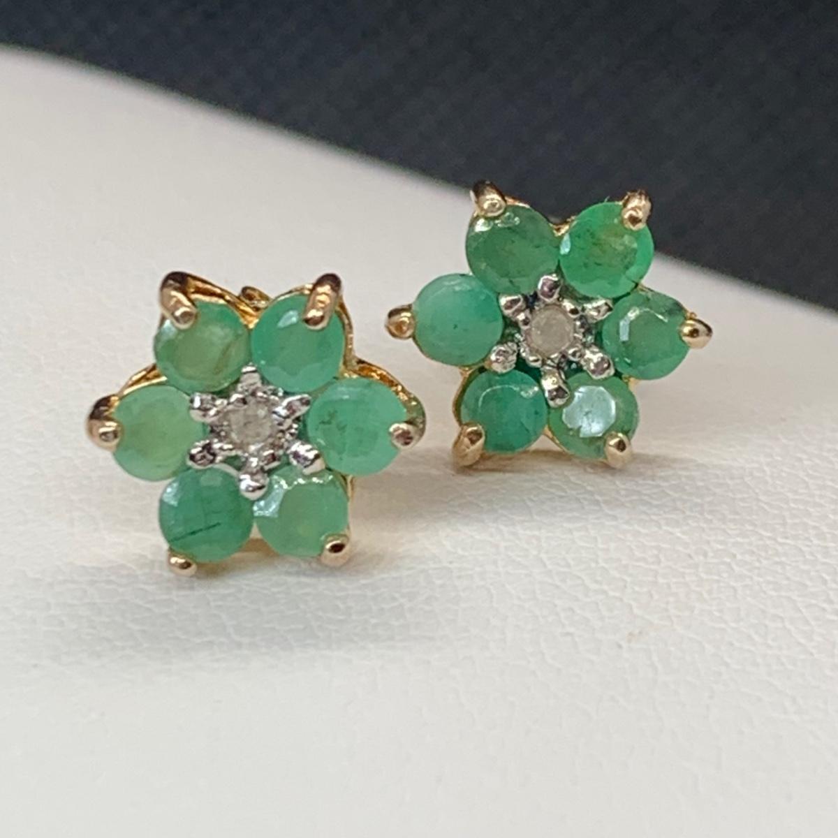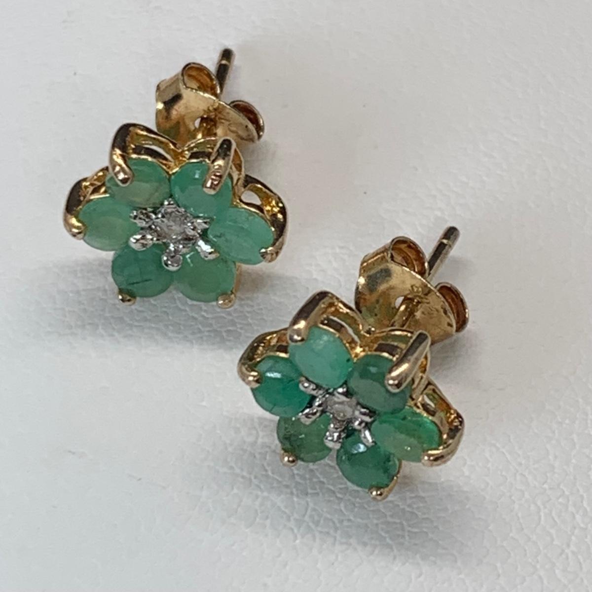 LOT 181; Gold Vermeil (925) Lab Created Emeralds w/Diamonds Center Flower Pierced Earrings