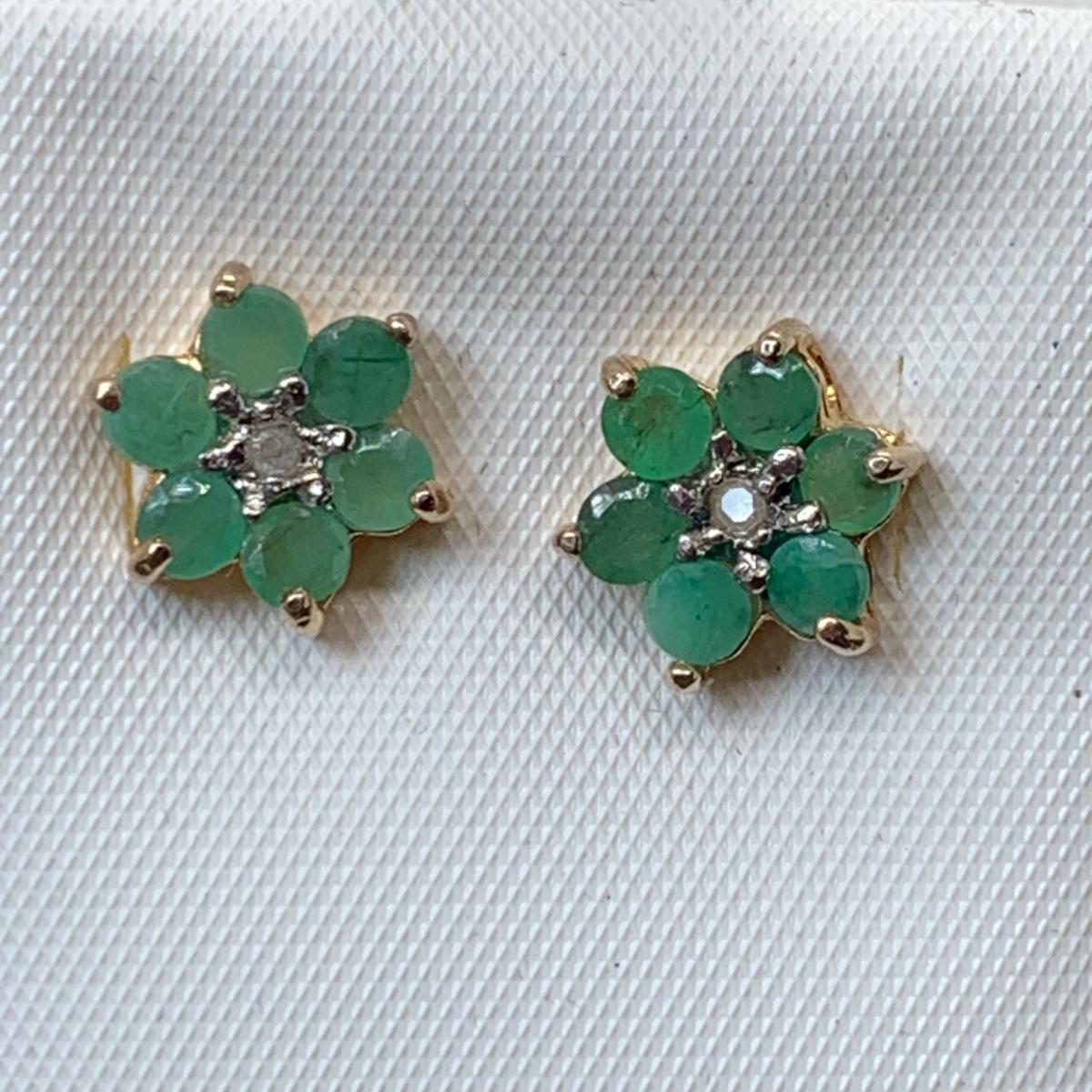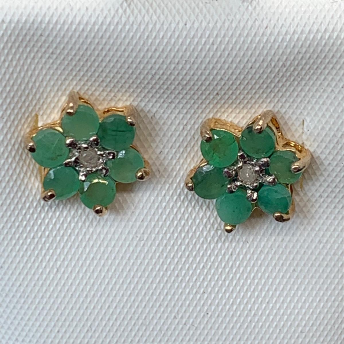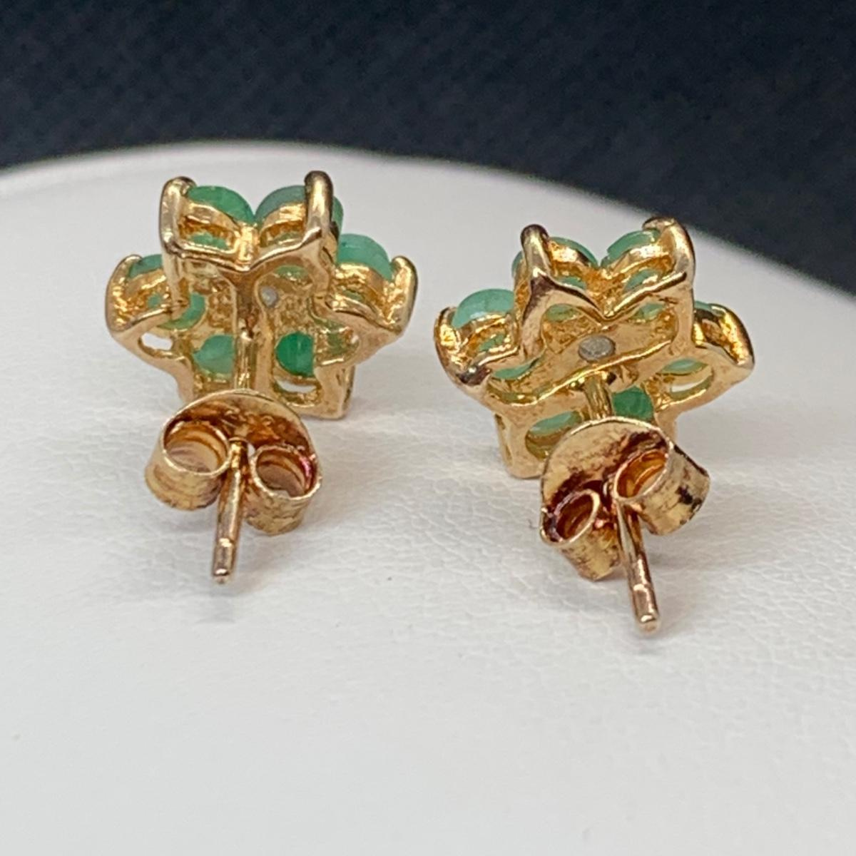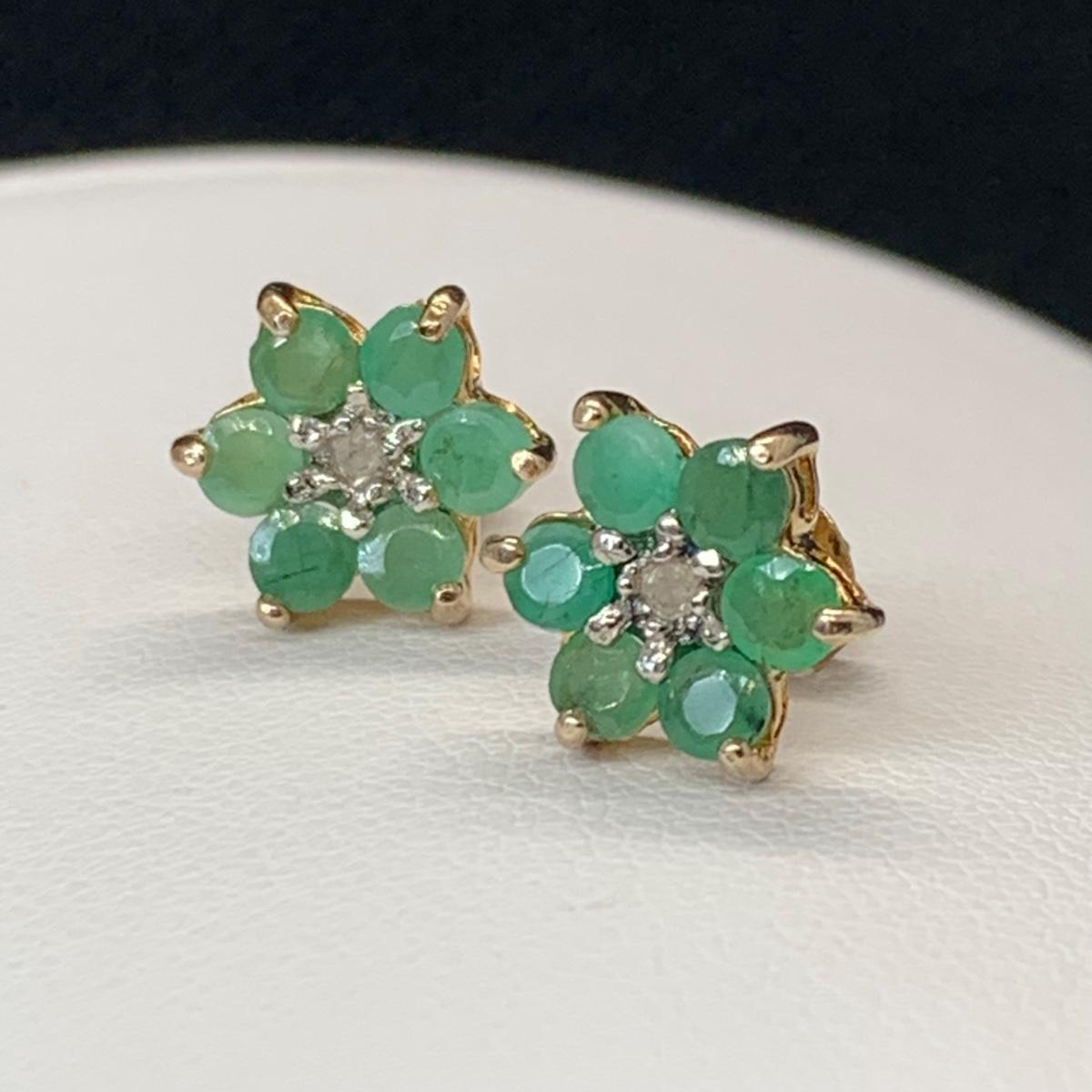 LOT 181; Gold Vermeil (925) Lab Created Emeralds w/Diamonds Center Flower Pierced Earrings