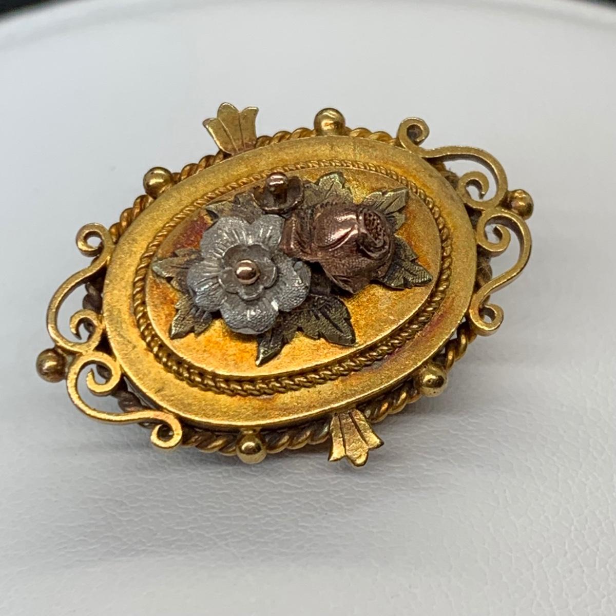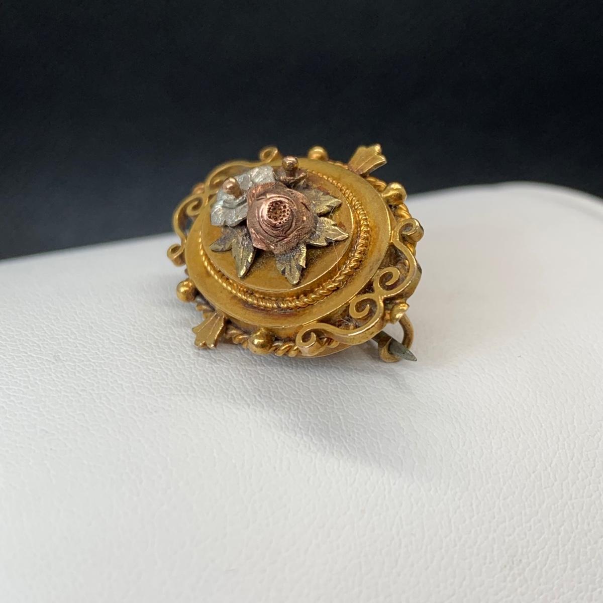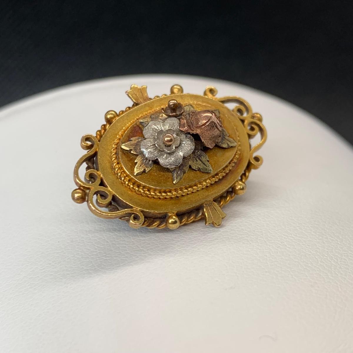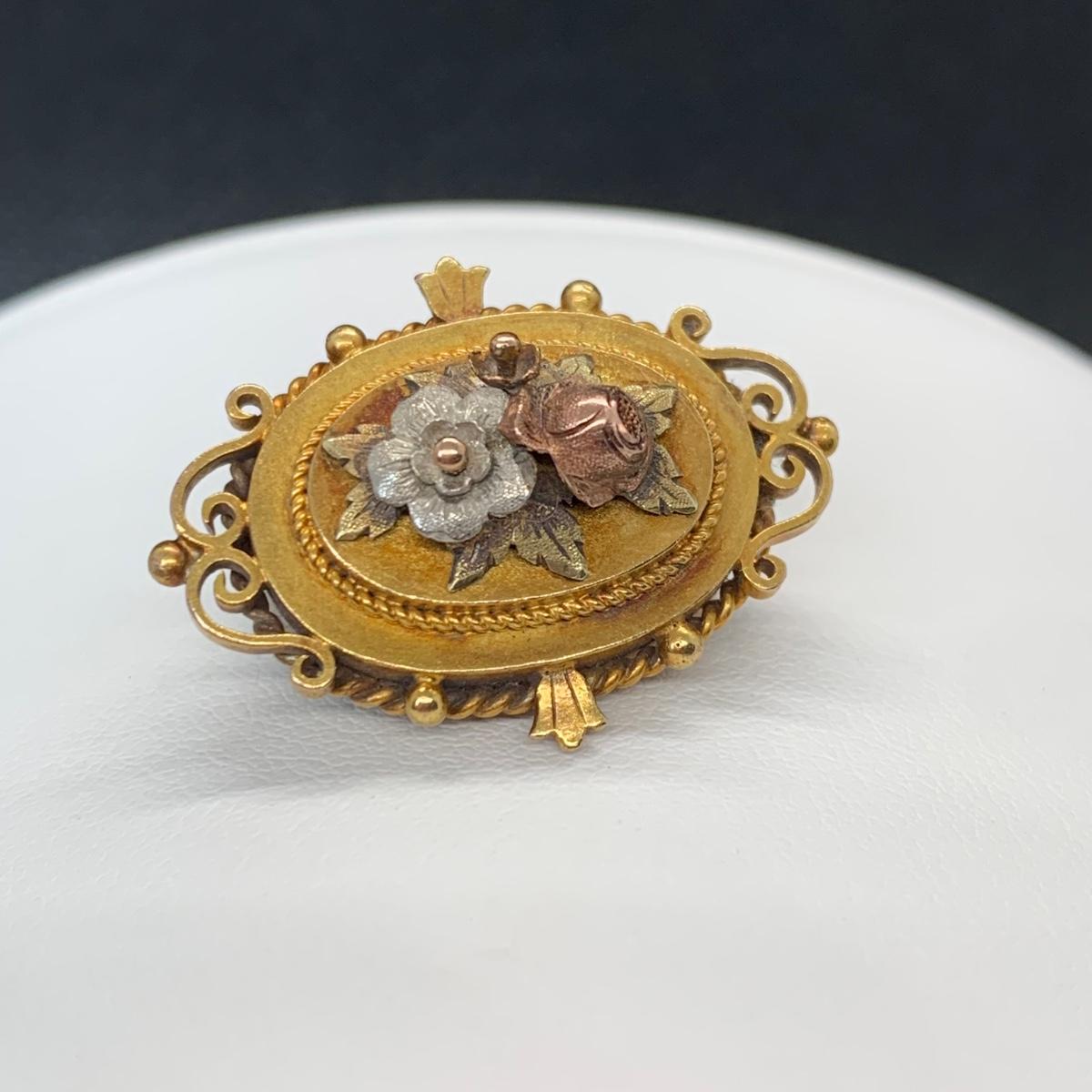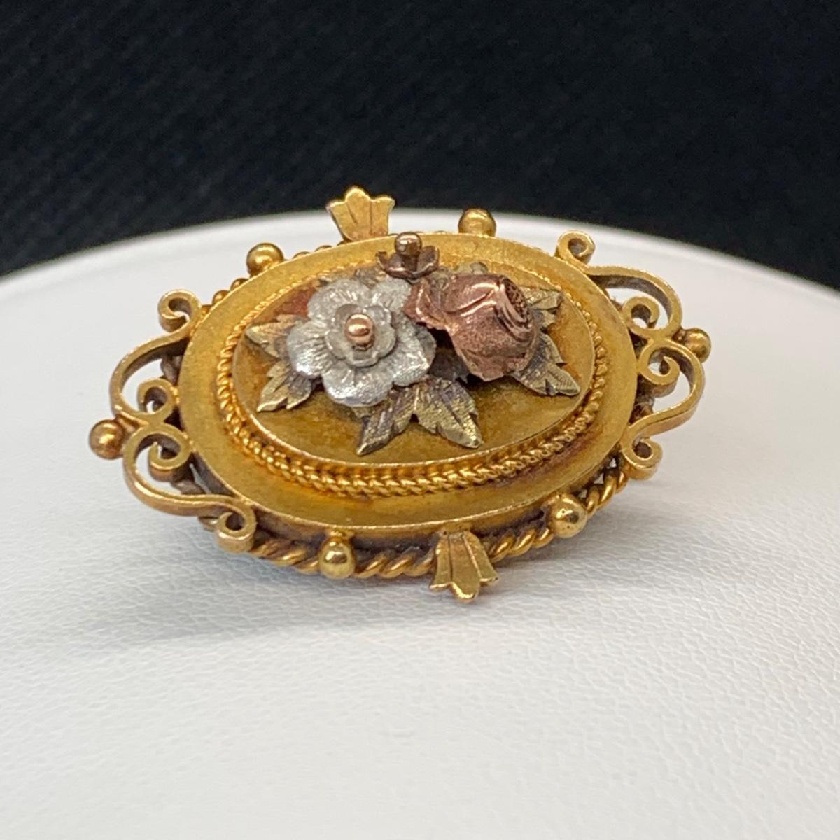 LOT 184: Antique 14K Tri Color Victorian Locket Brooch: Platinum, Rose Gold & Yellow Gold