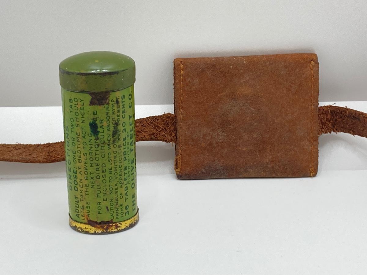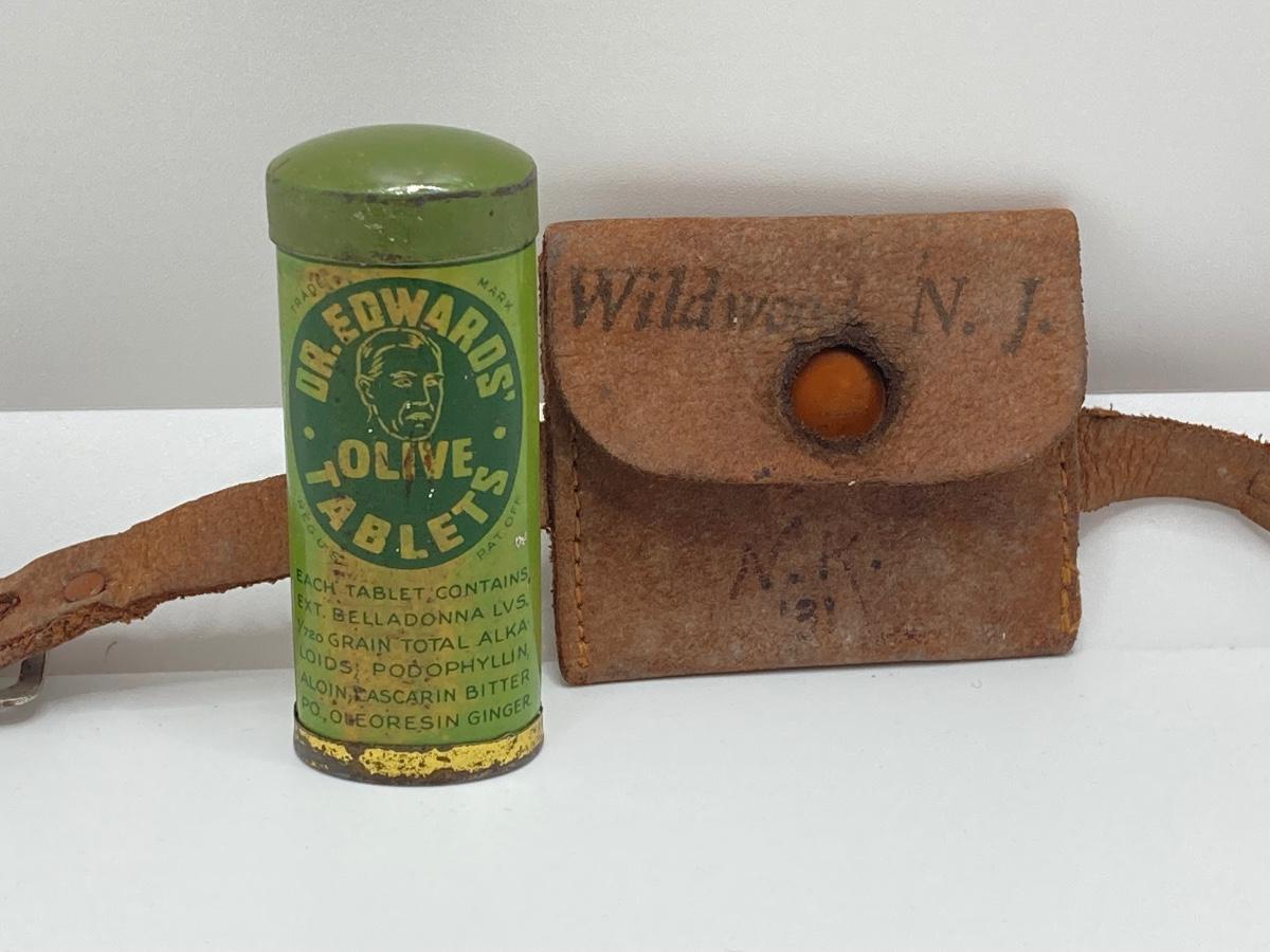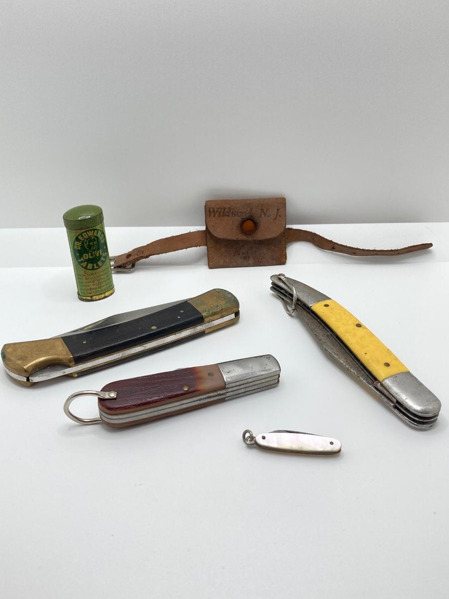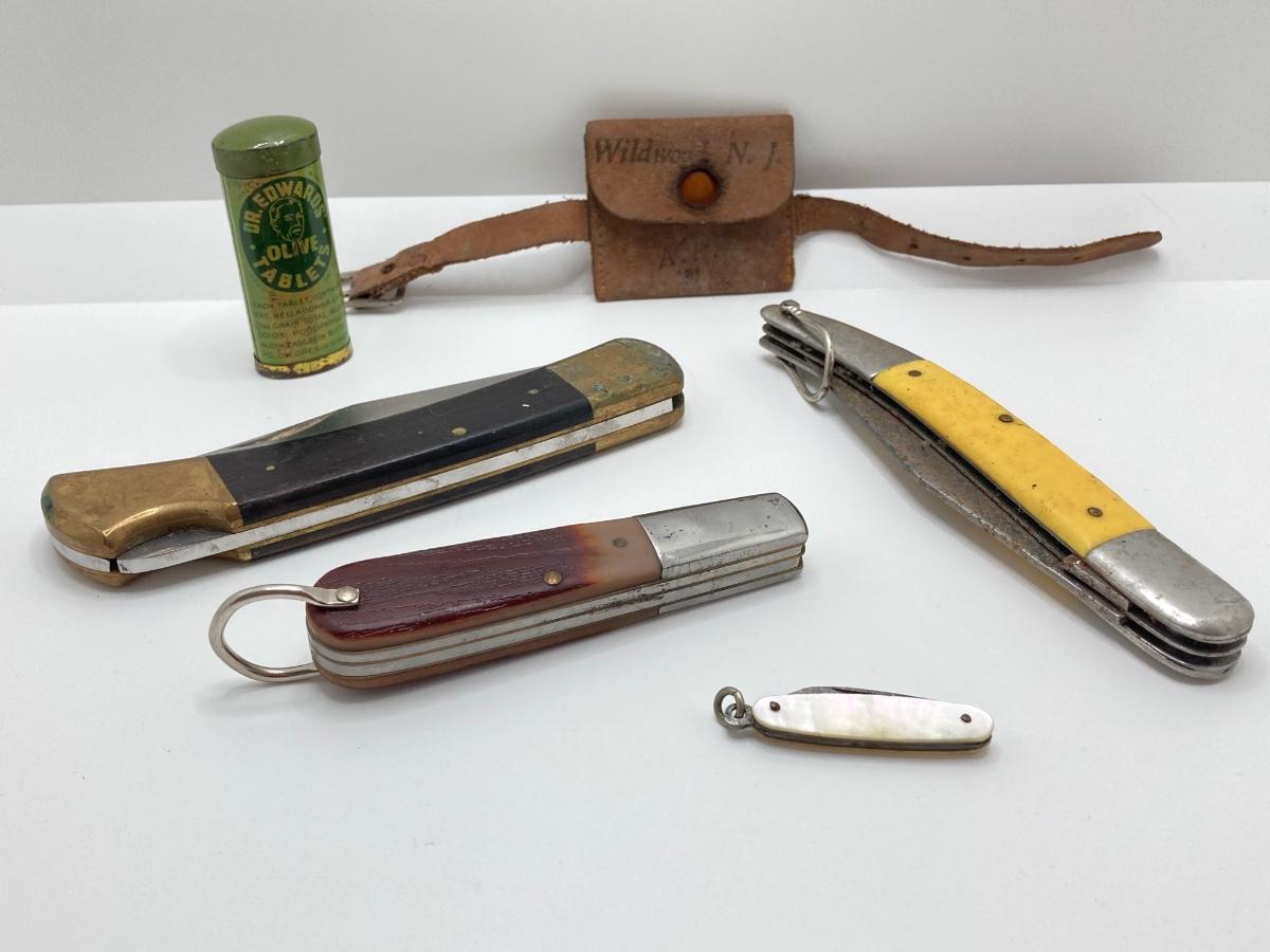 LOT 198: Vintage Collection - Pocket Knives, Dr. Edwards Olive Tablets Tin and Leather Wildwood NJ Pouch