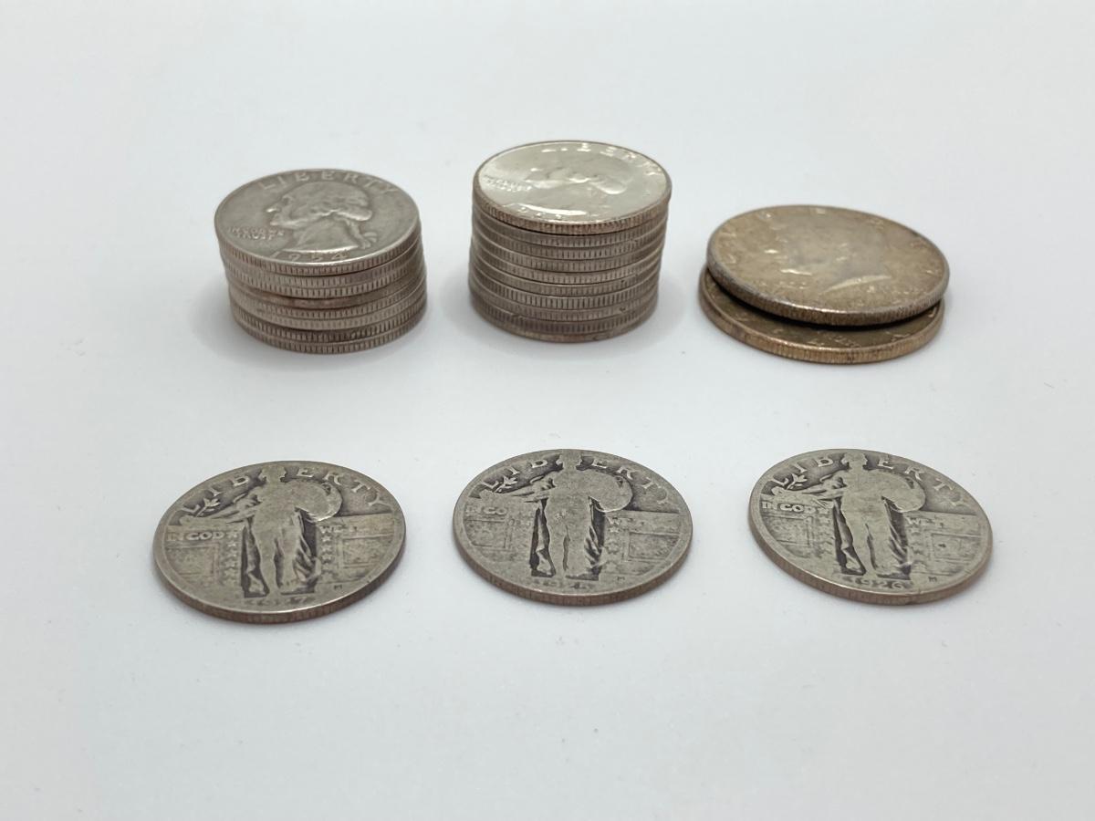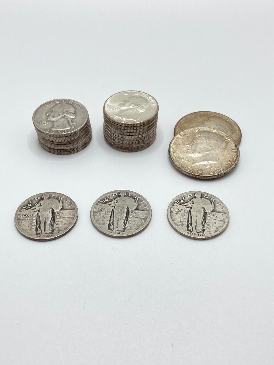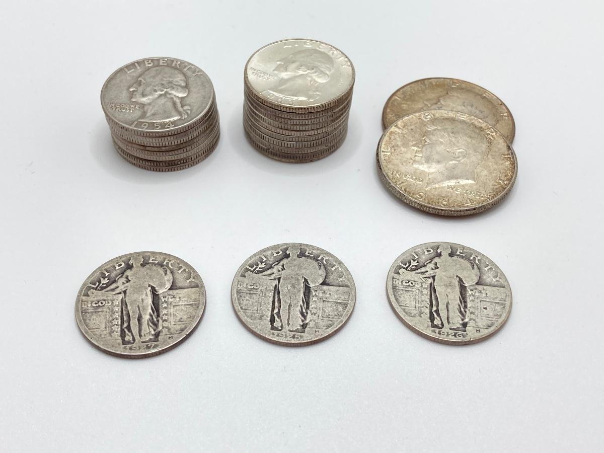 LOT 215: Silver Coin Collection - Two 1964 Kennedy Half Dollars, Three Walking Liberty Quarters and Eighteen Quarters