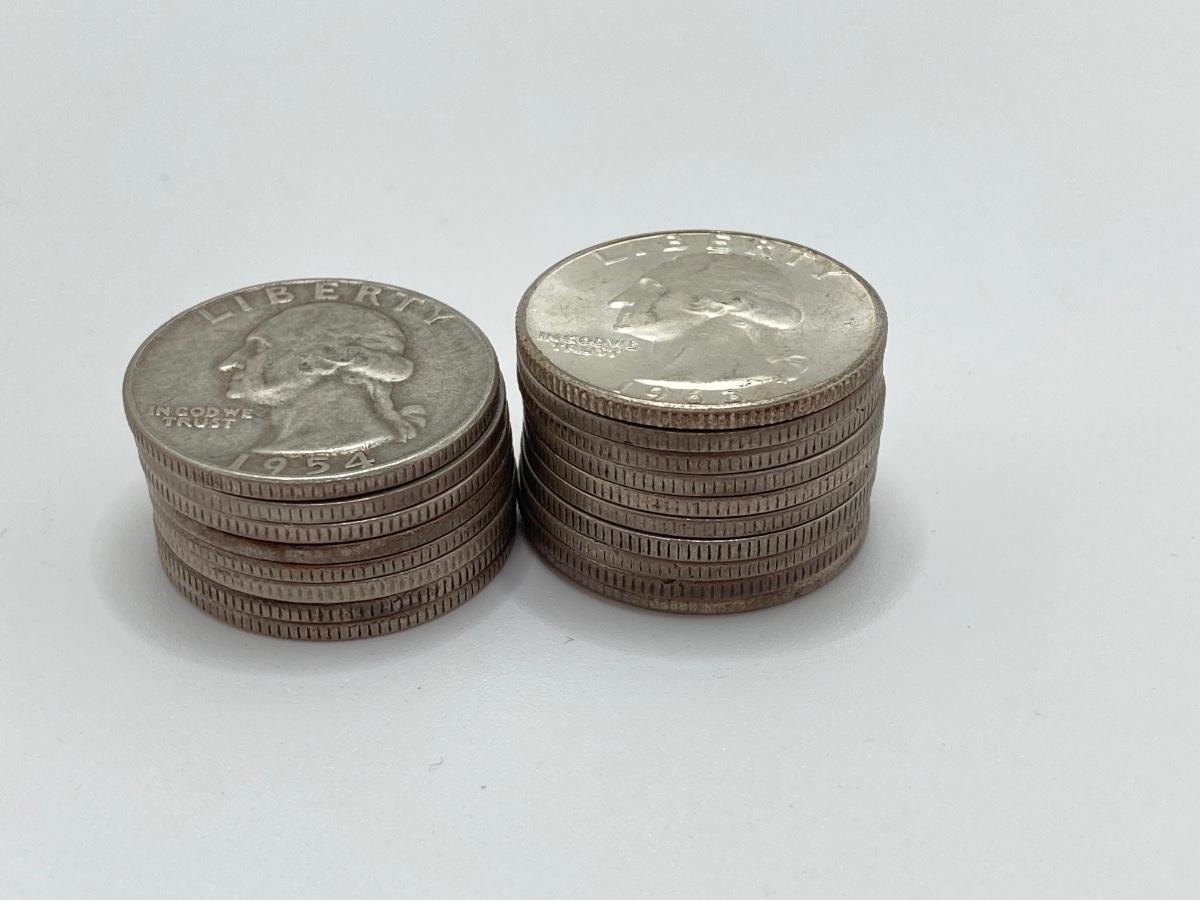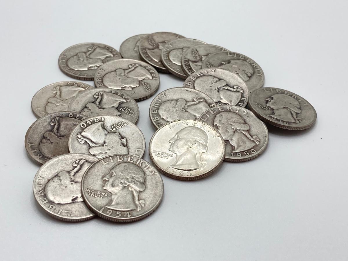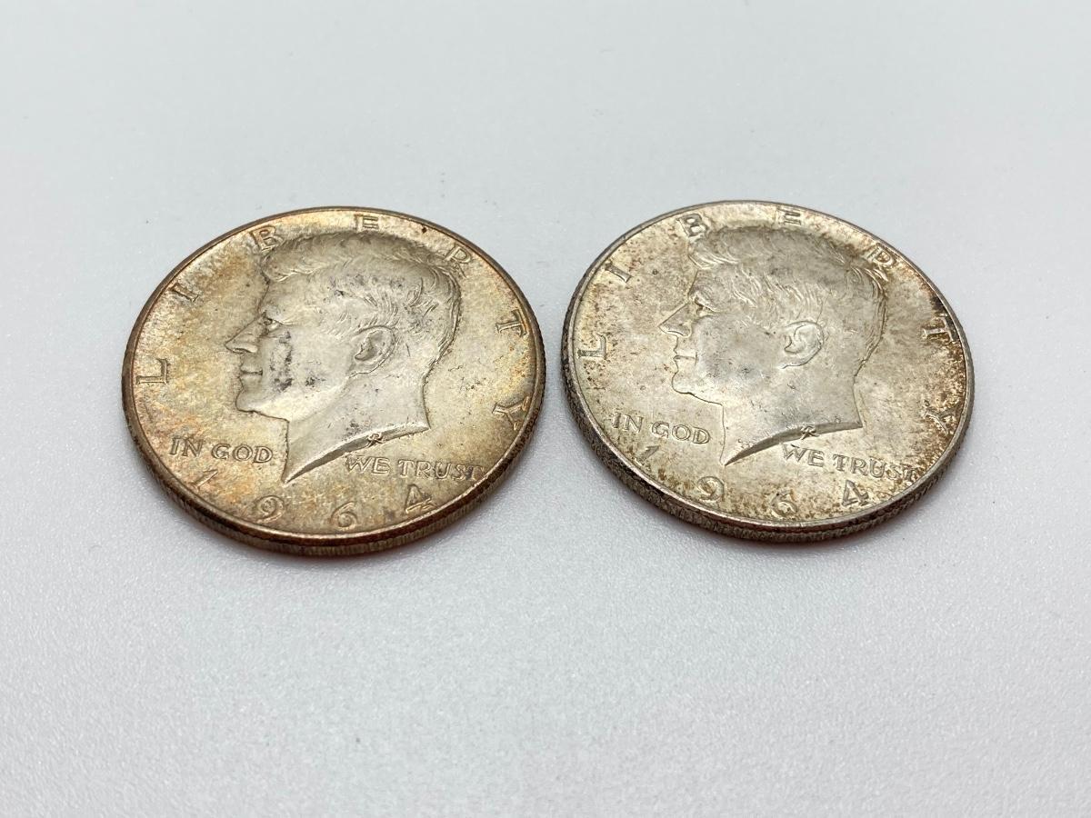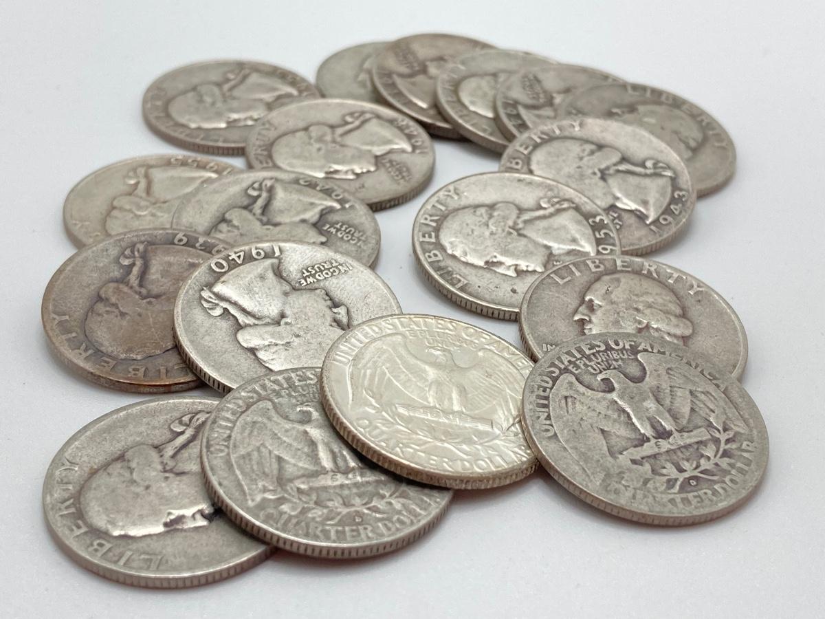 LOT 215: Silver Coin Collection - Two 1964 Kennedy Half Dollars, Three Walking Liberty Quarters and Eighteen Quarters