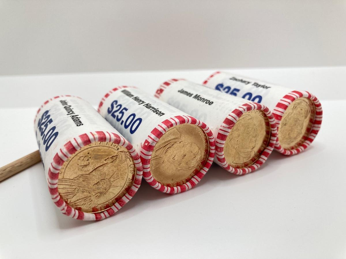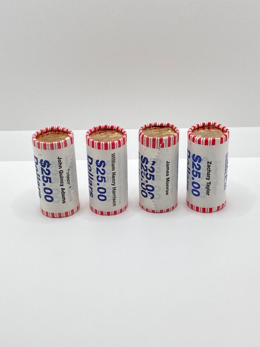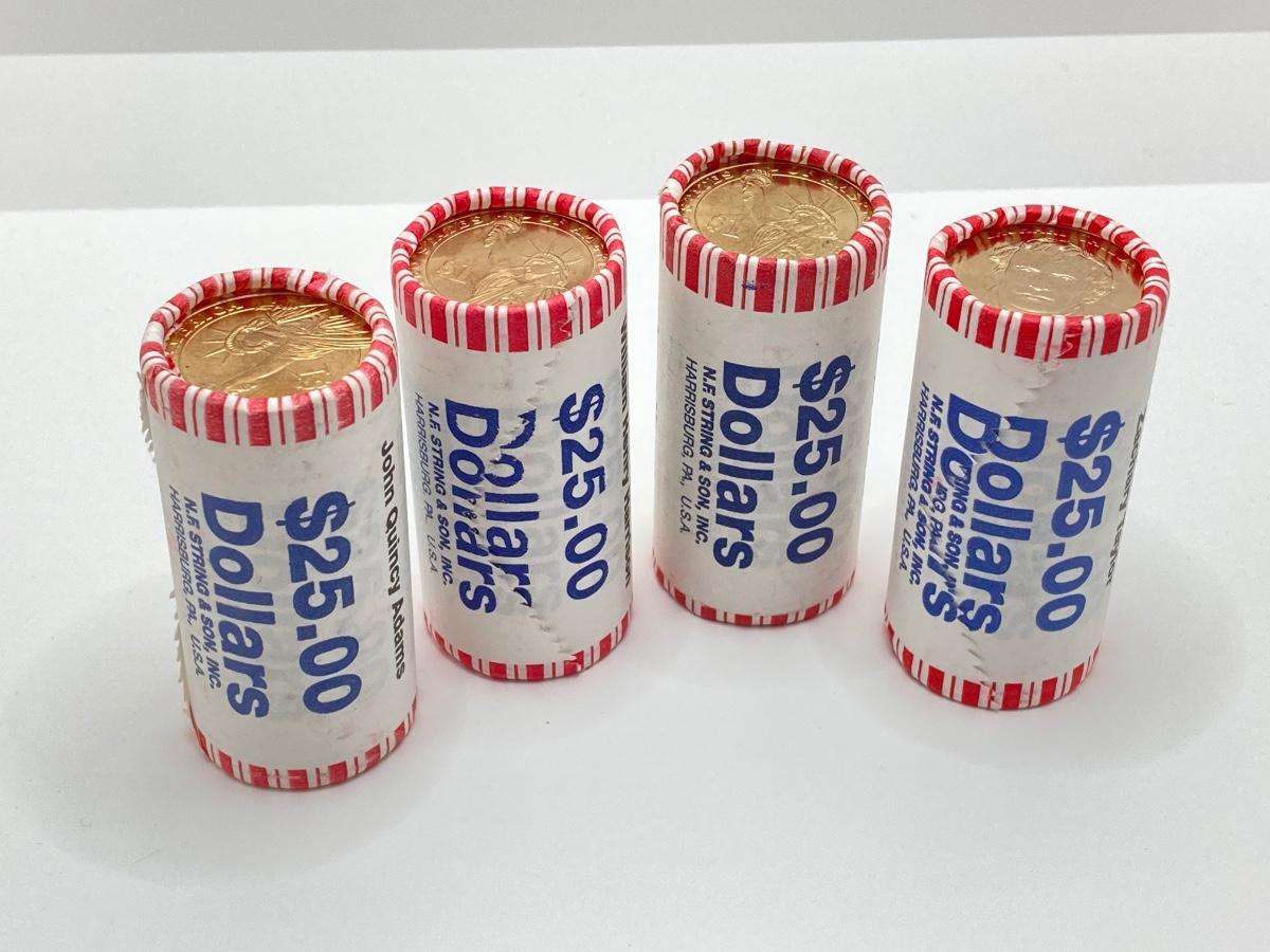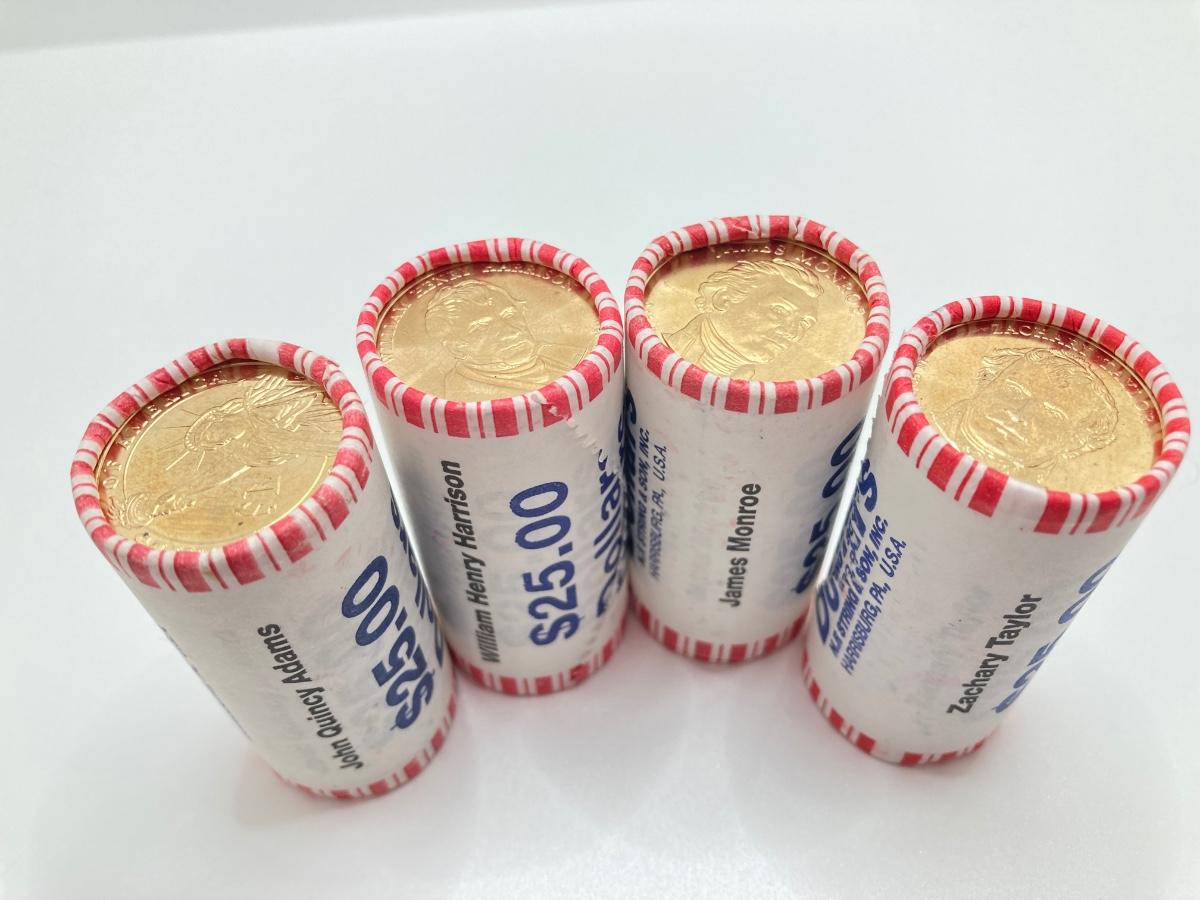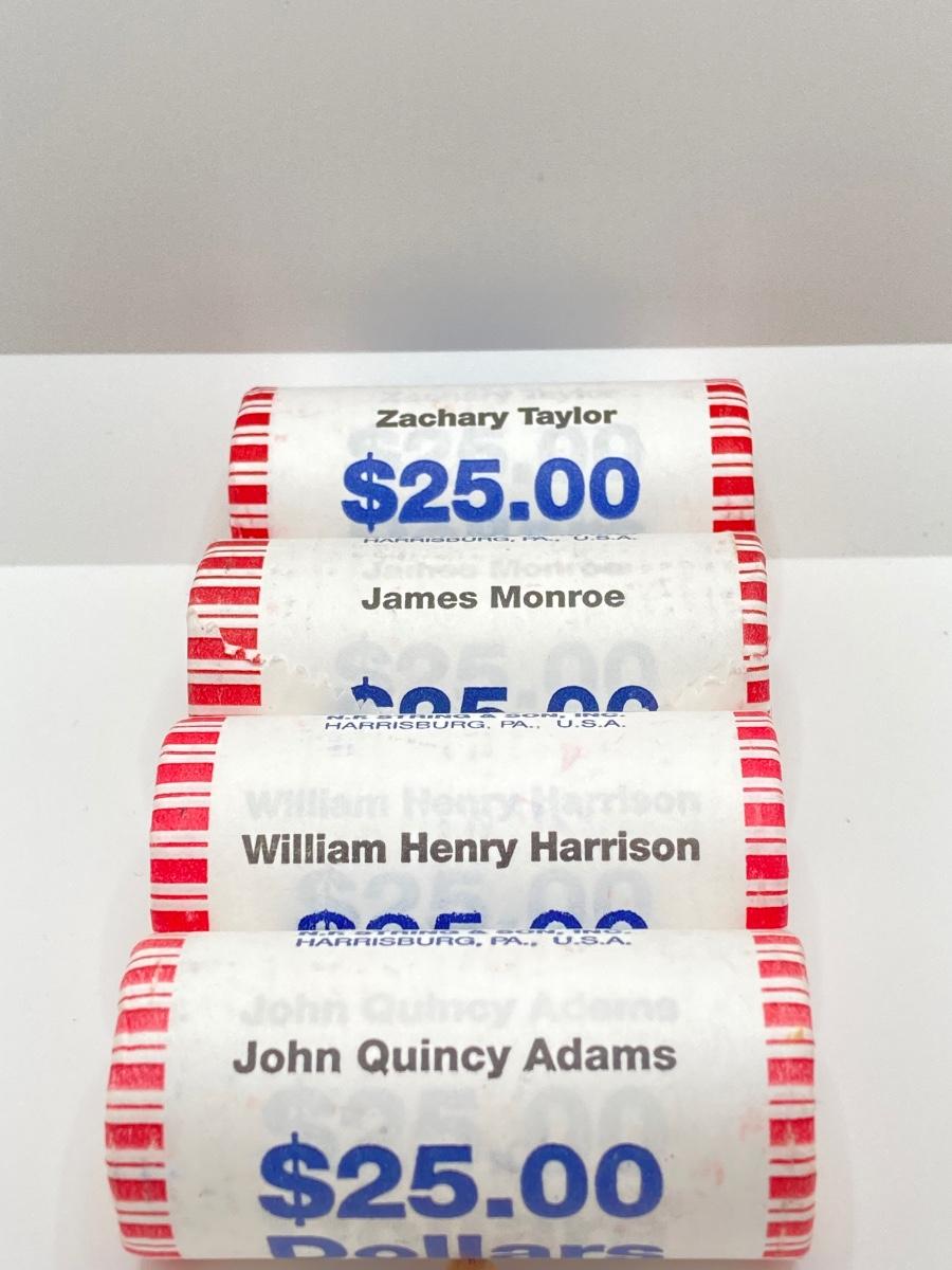 LOT 236: Four Unopened Rolls of Presidential $1 Coins - (25 Coins Per Roll) John Quincy Adams, William Henry Harrison, James Monroe and Zachar Taylor