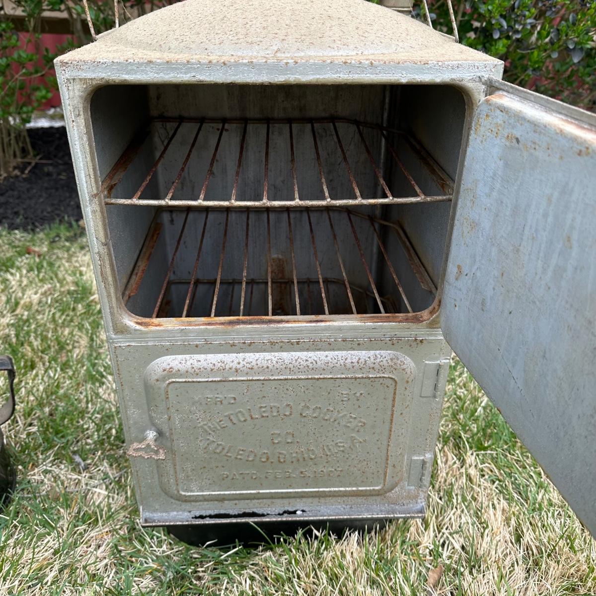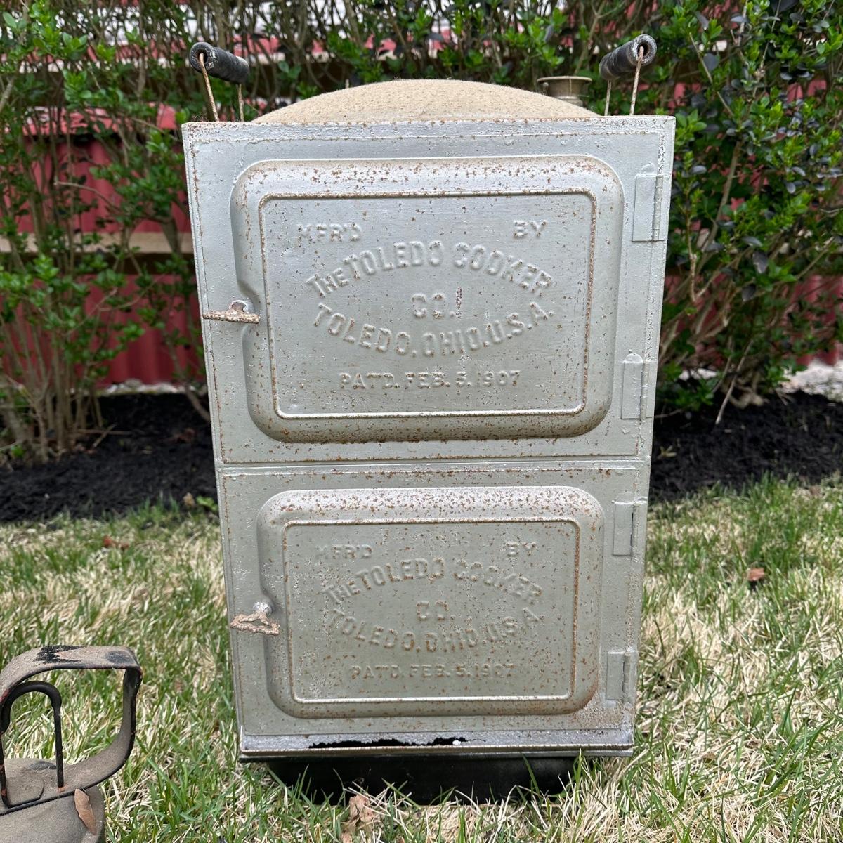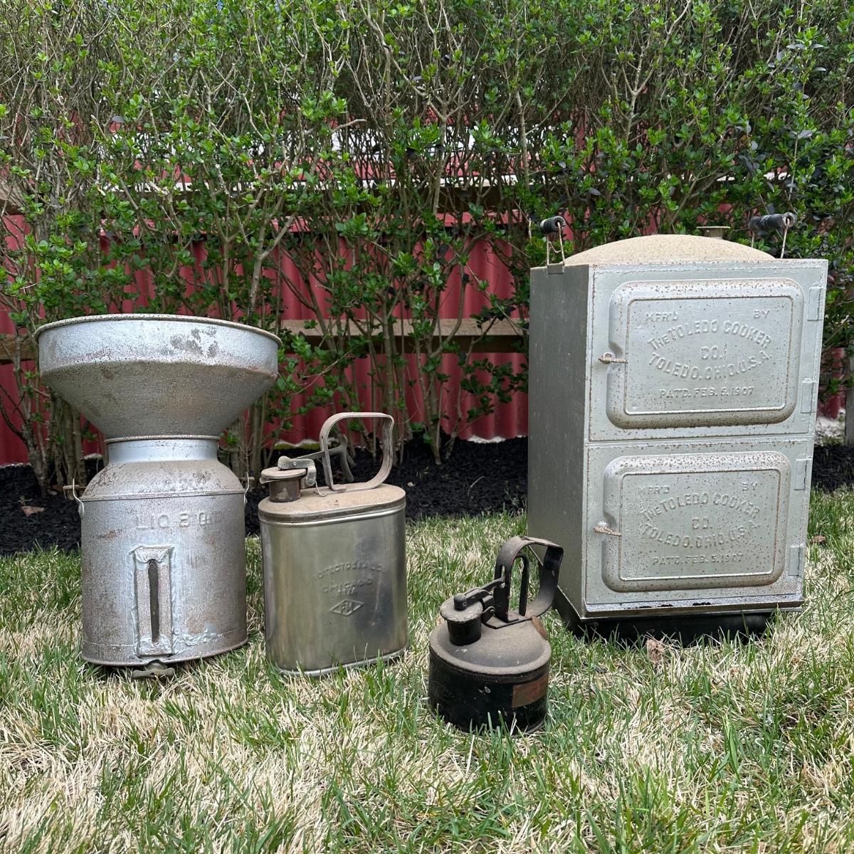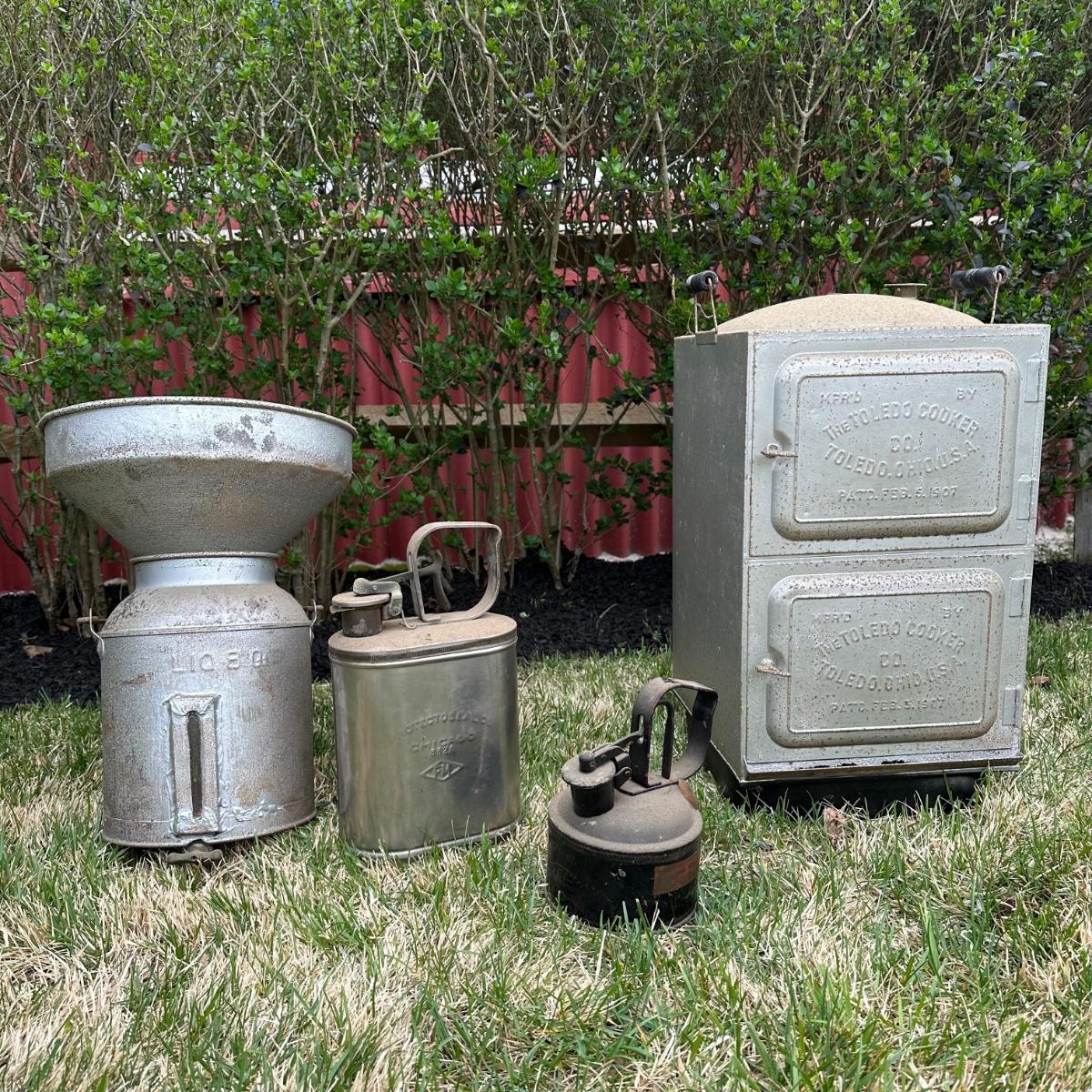 LOT 74P: Vintage The Toledo Cooker Steamer Oven, Milk Can Dispenser & Gas Cans