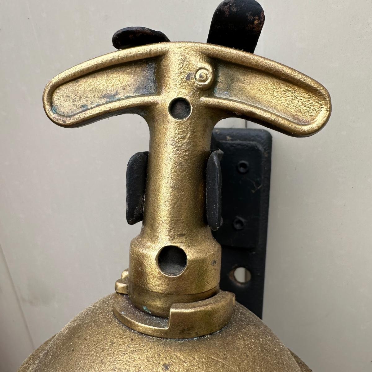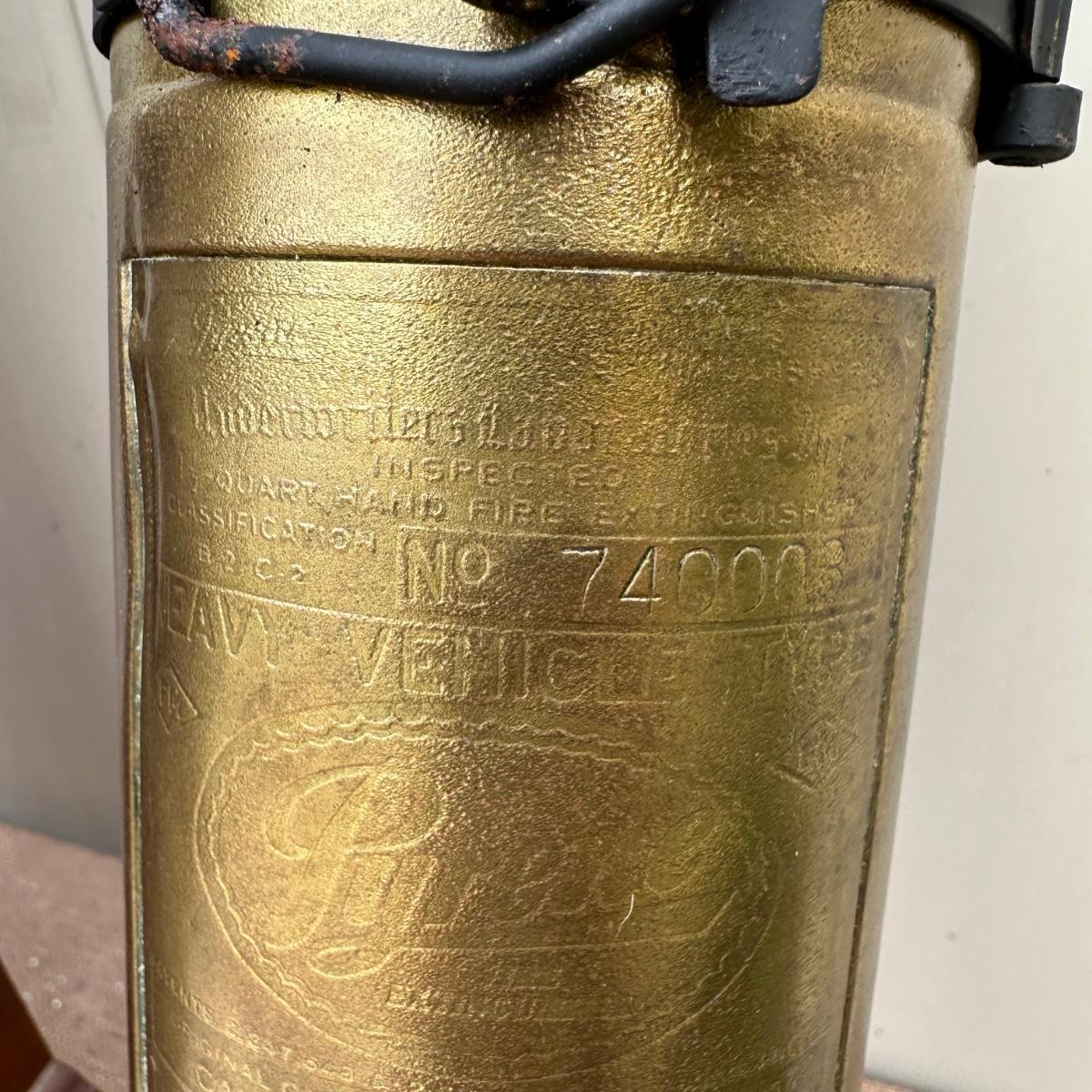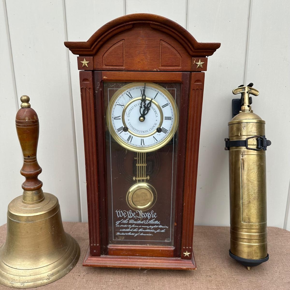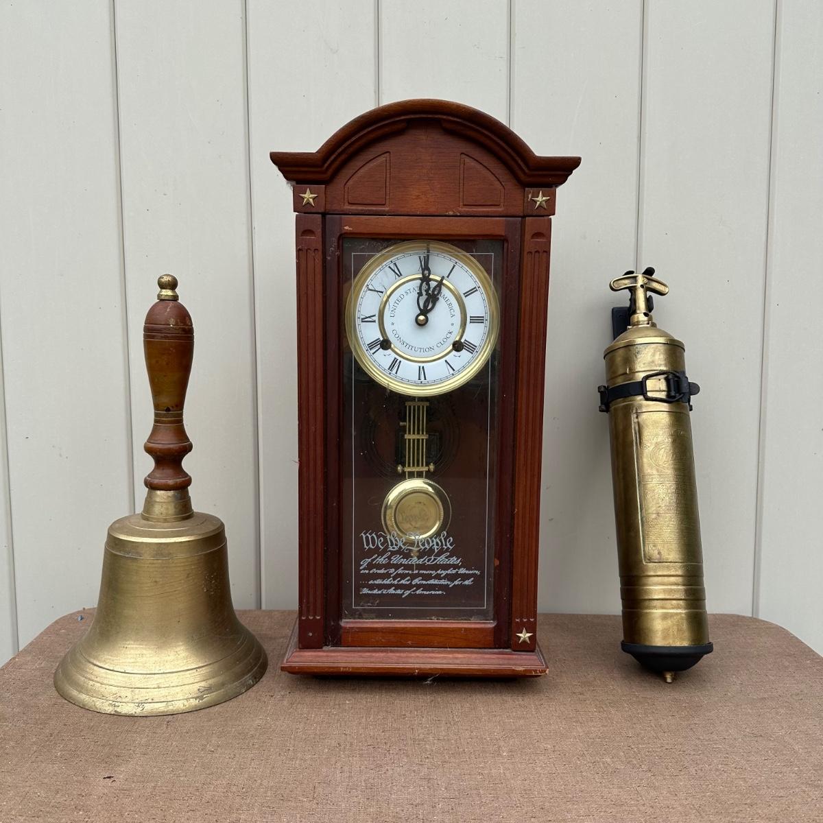 LOT 77P: Vintage Pyrene Heavy Vehicle Fire Extinguisher w/ Hanging Mount, Constitution Clock & Bell
