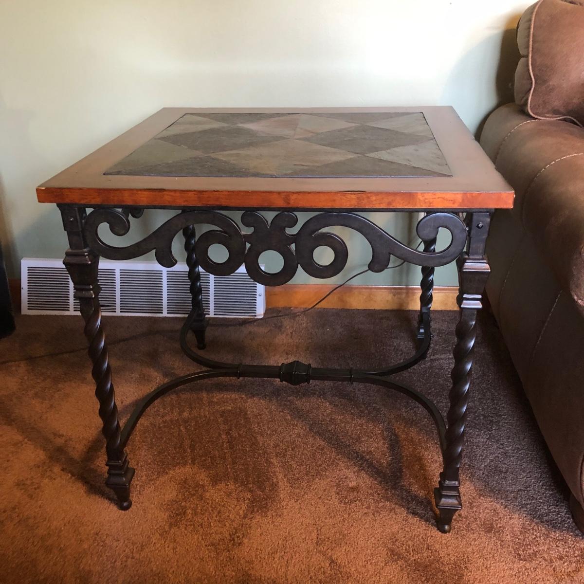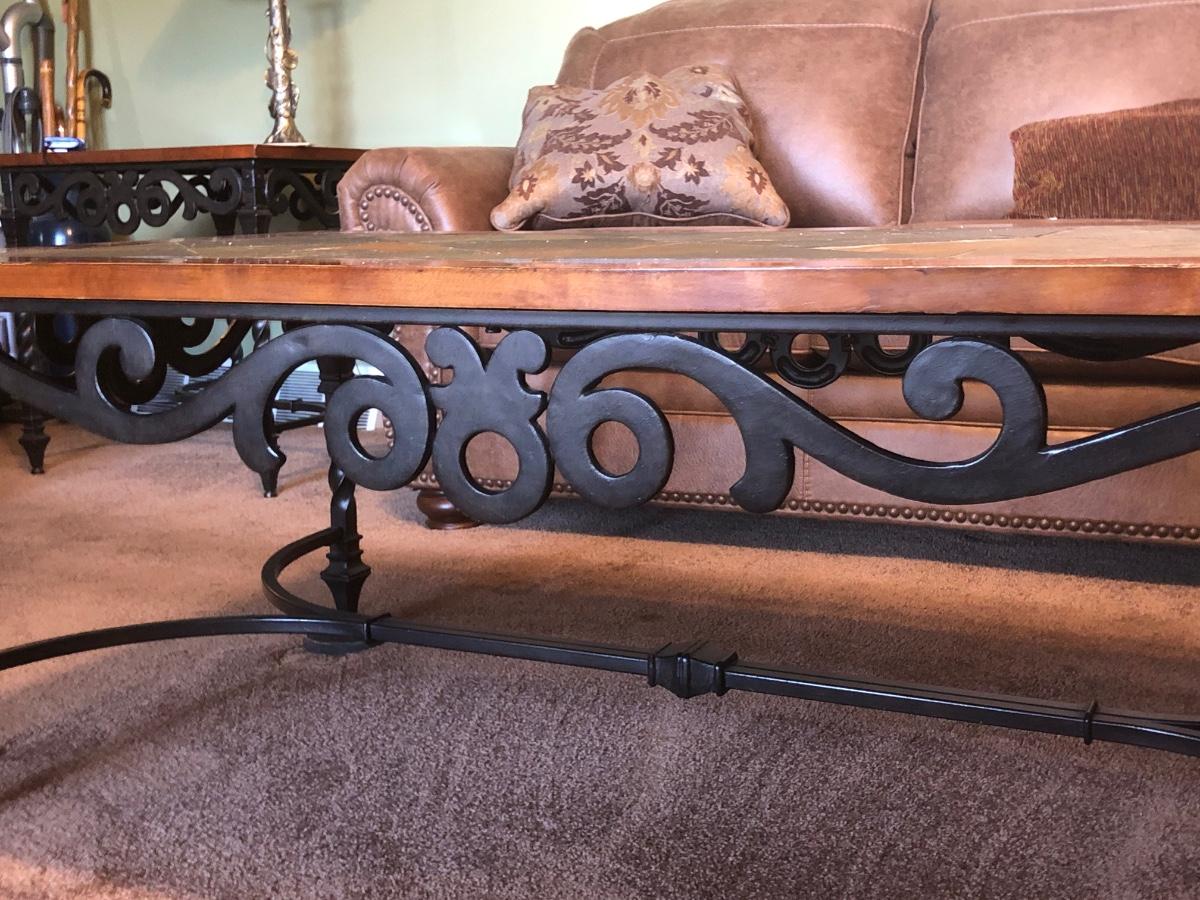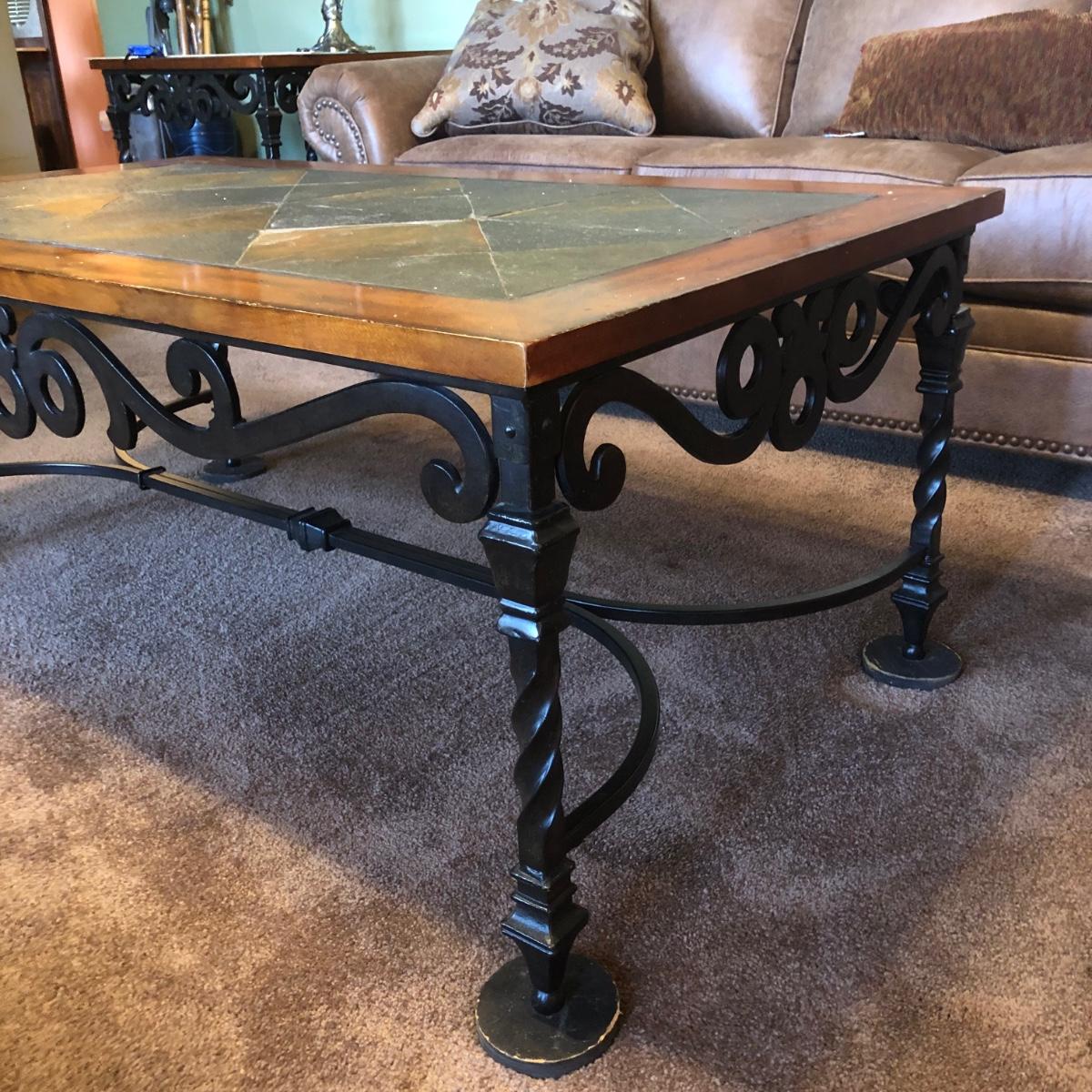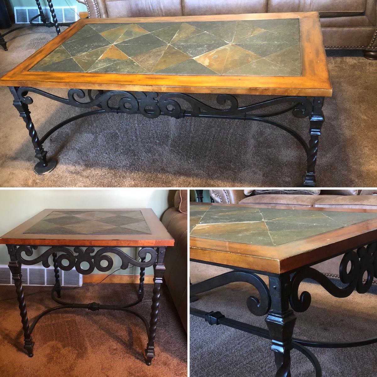 LOT 87L: Rectangular Iron Base Wood Slate Inlay Coffee Table & End Table