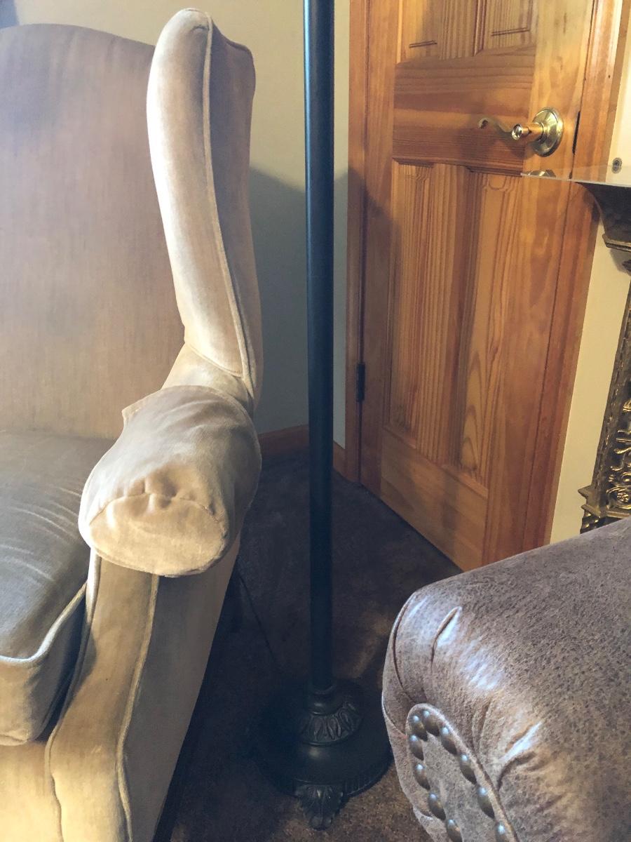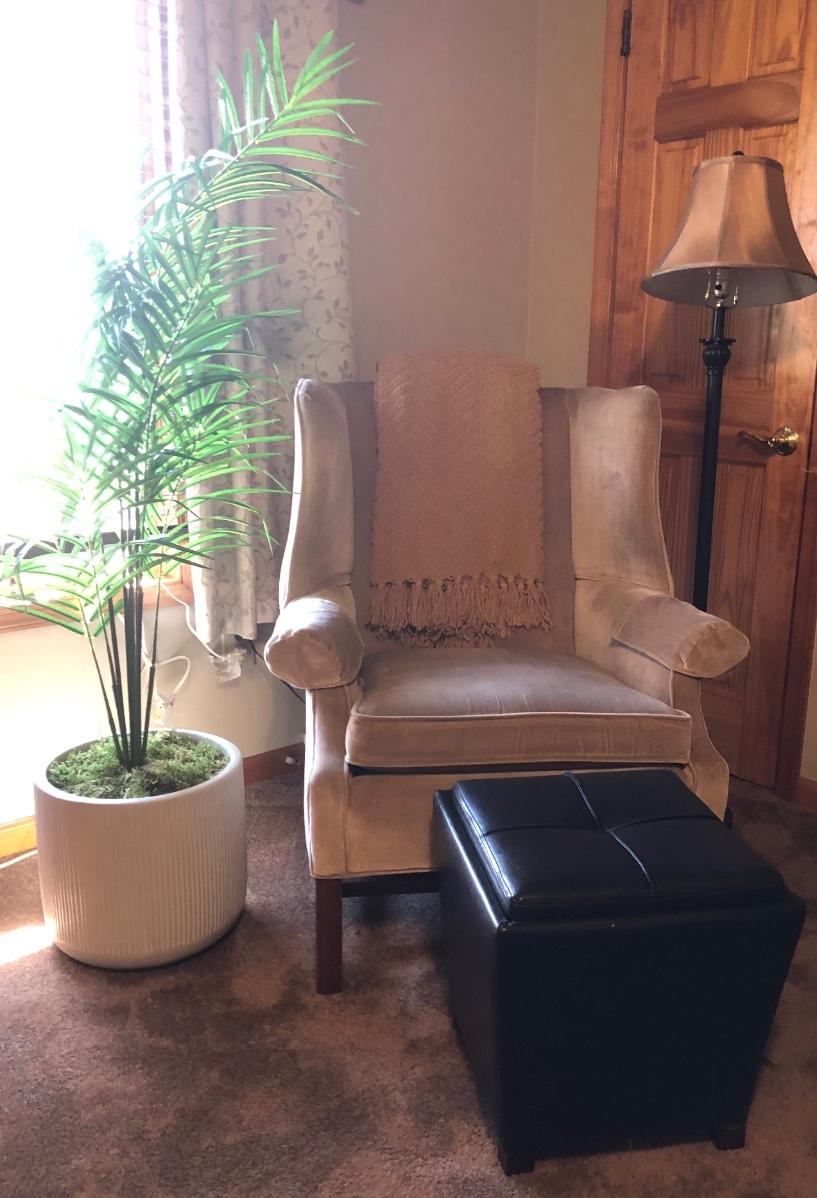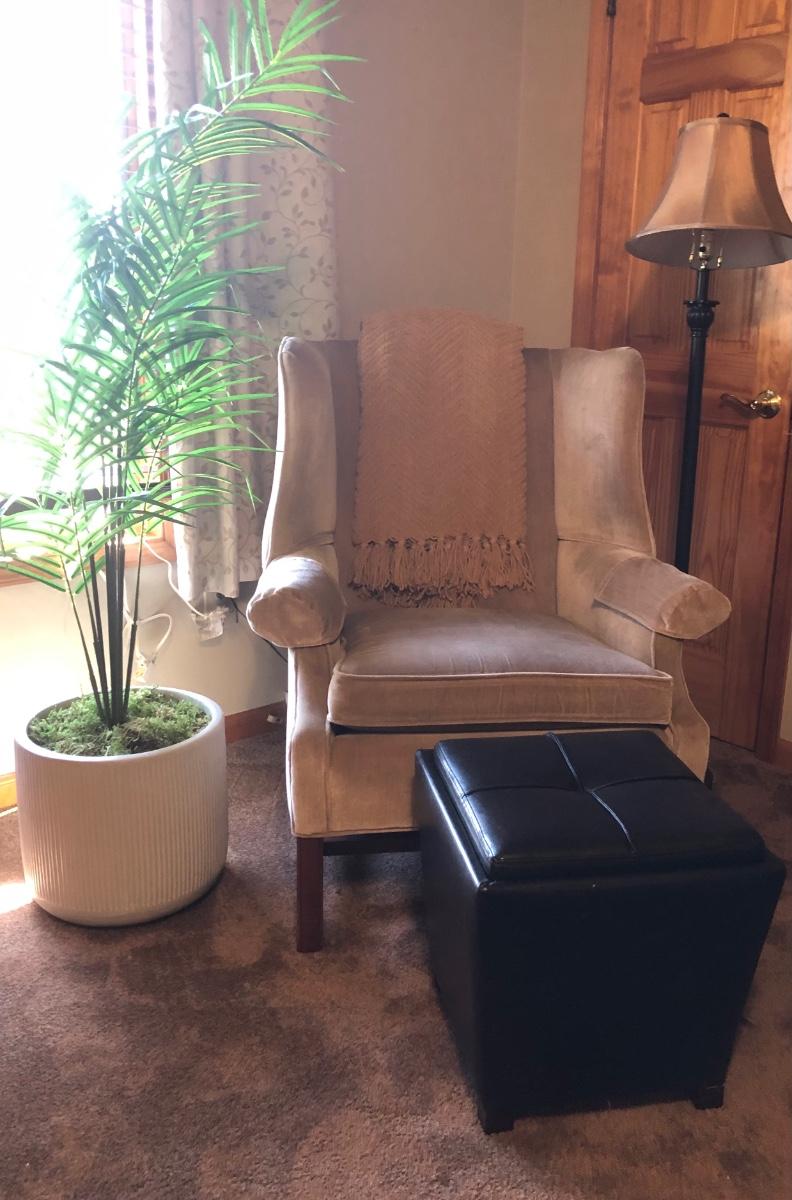 LOT 89L: Choice Seating Gallery Wingback Accent Chair, Metal Floor Lamp, Black Stool w/ Tray & Faux Potted Fern