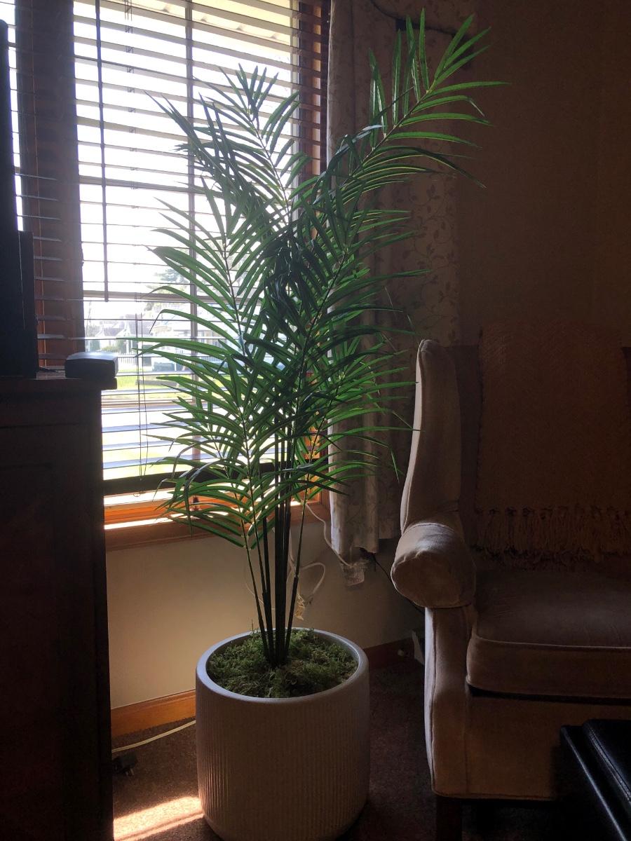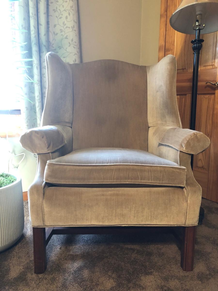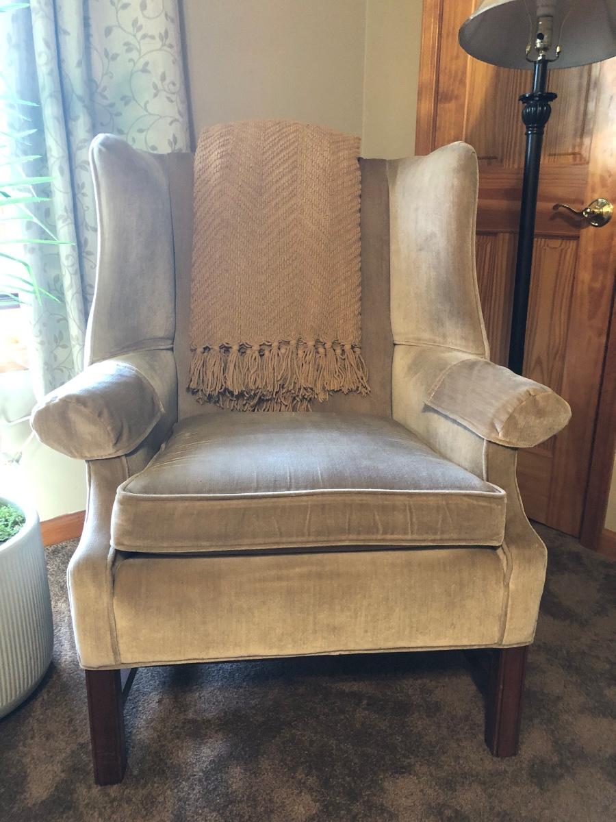 LOT 89L: Choice Seating Gallery Wingback Accent Chair, Metal Floor Lamp, Black Stool w/ Tray & Faux Potted Fern