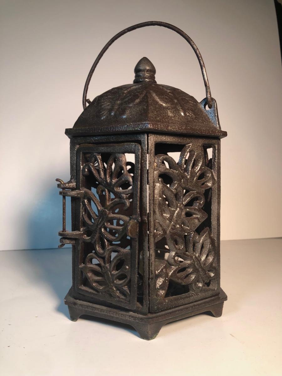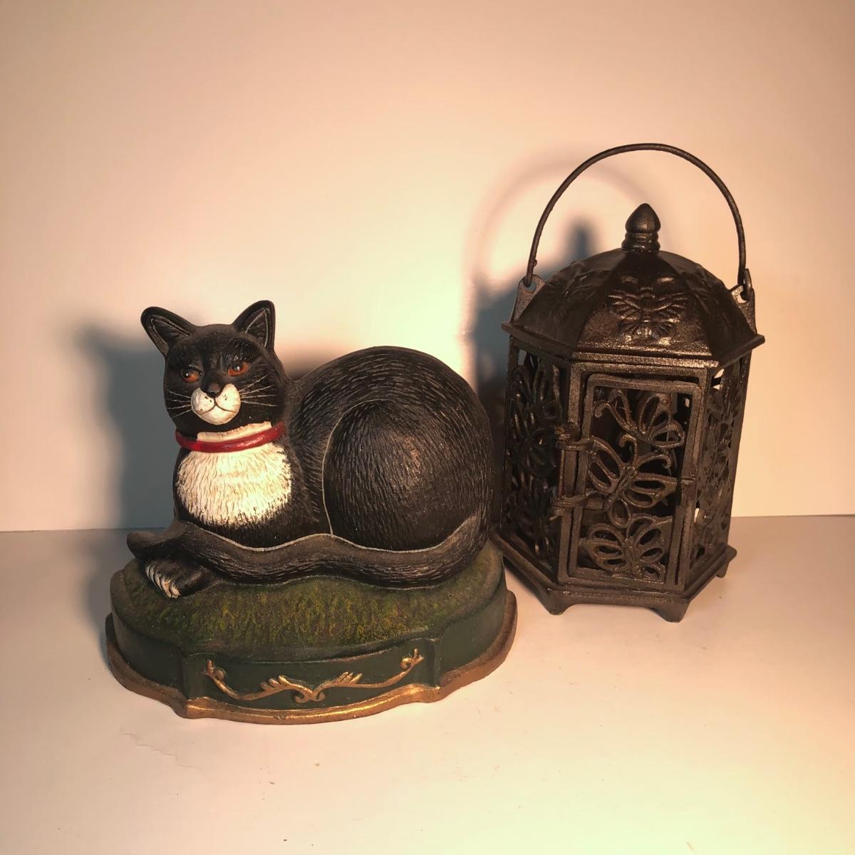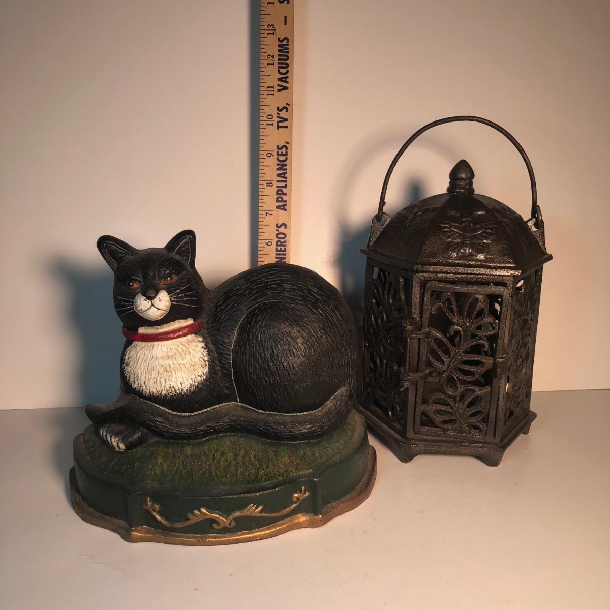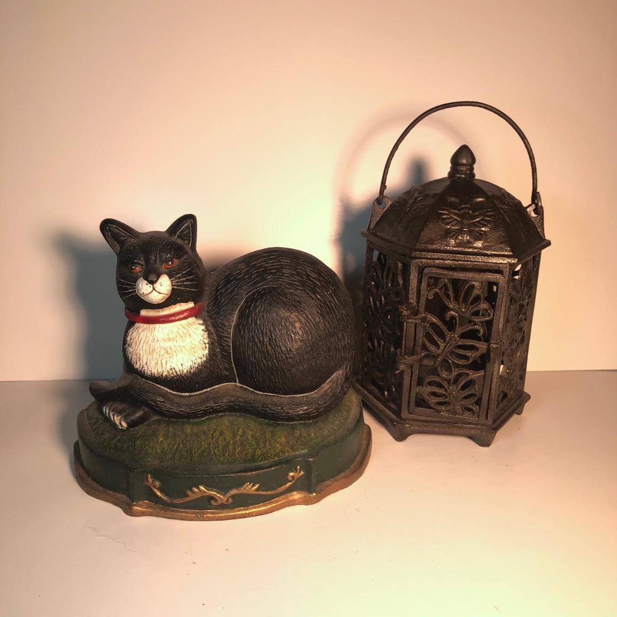 LOT 124L: Vintage Cast Iron Cat Doorstop & Hanging Butterfly Candle Lantern