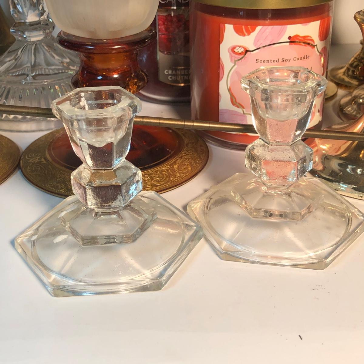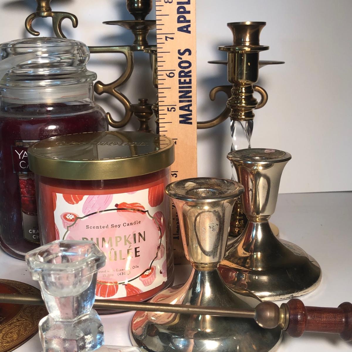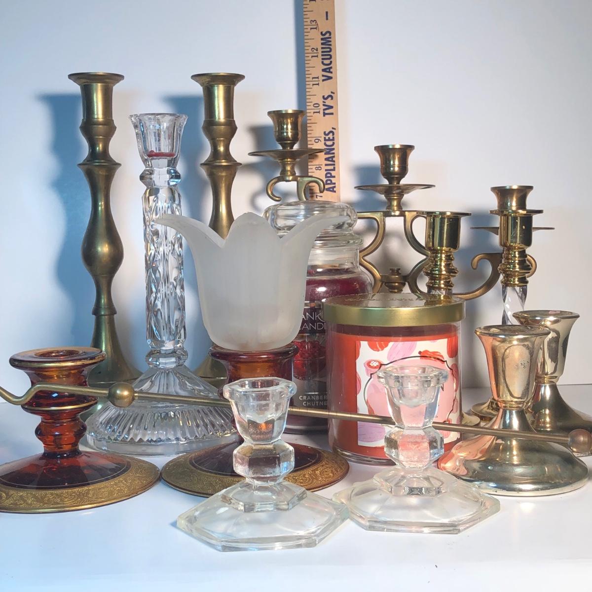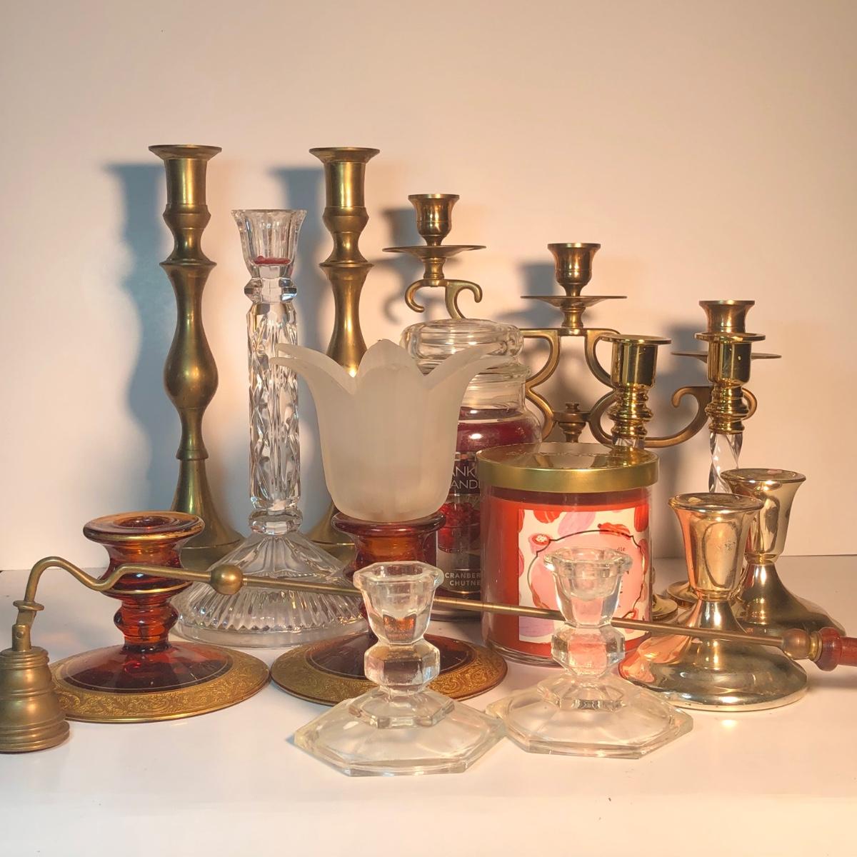 LOT 128L: Candle Collection - Brass Candle Holders, Amber Glass Candlestick Holders, Yankee Candle, Snuffer & More