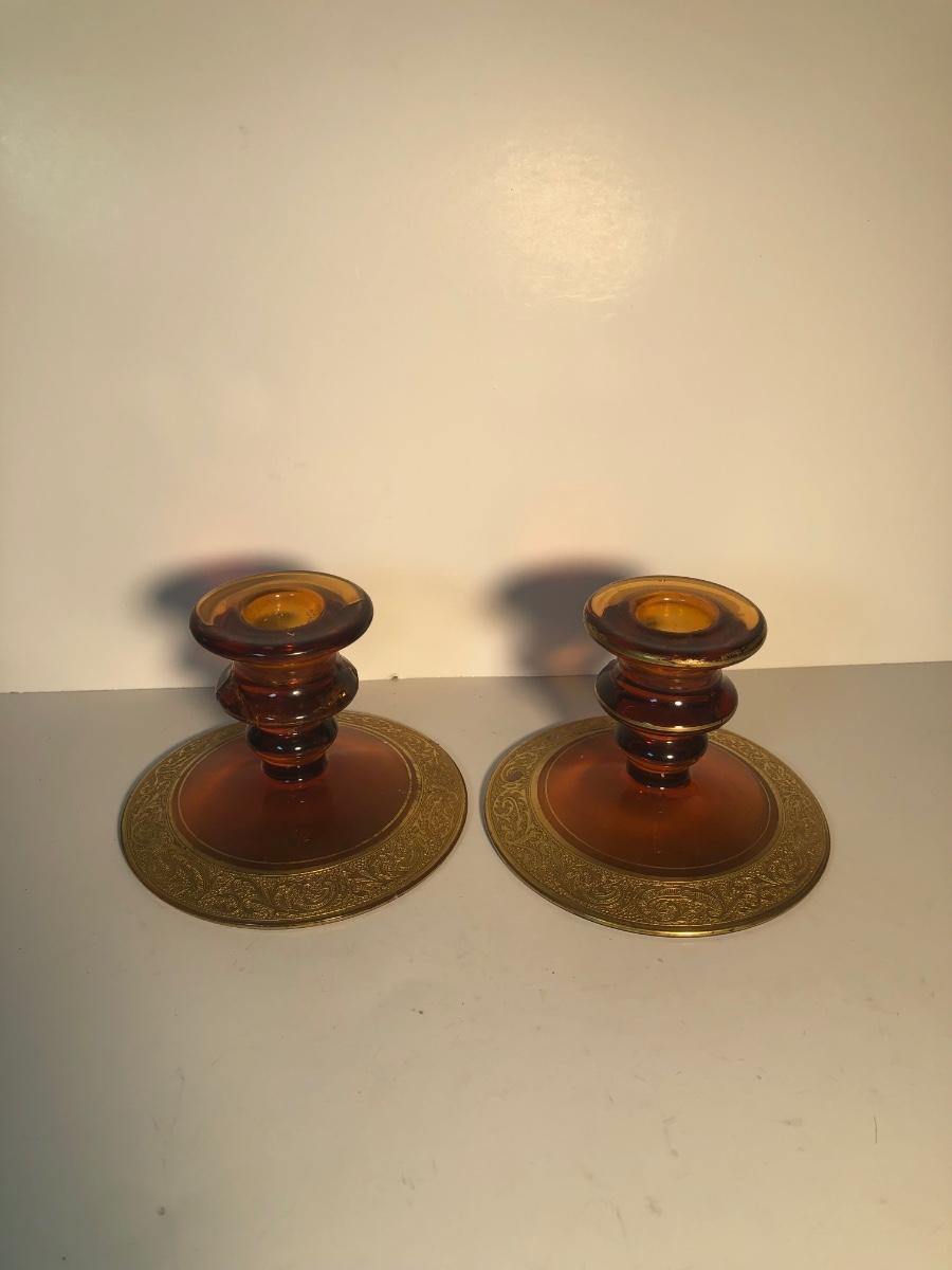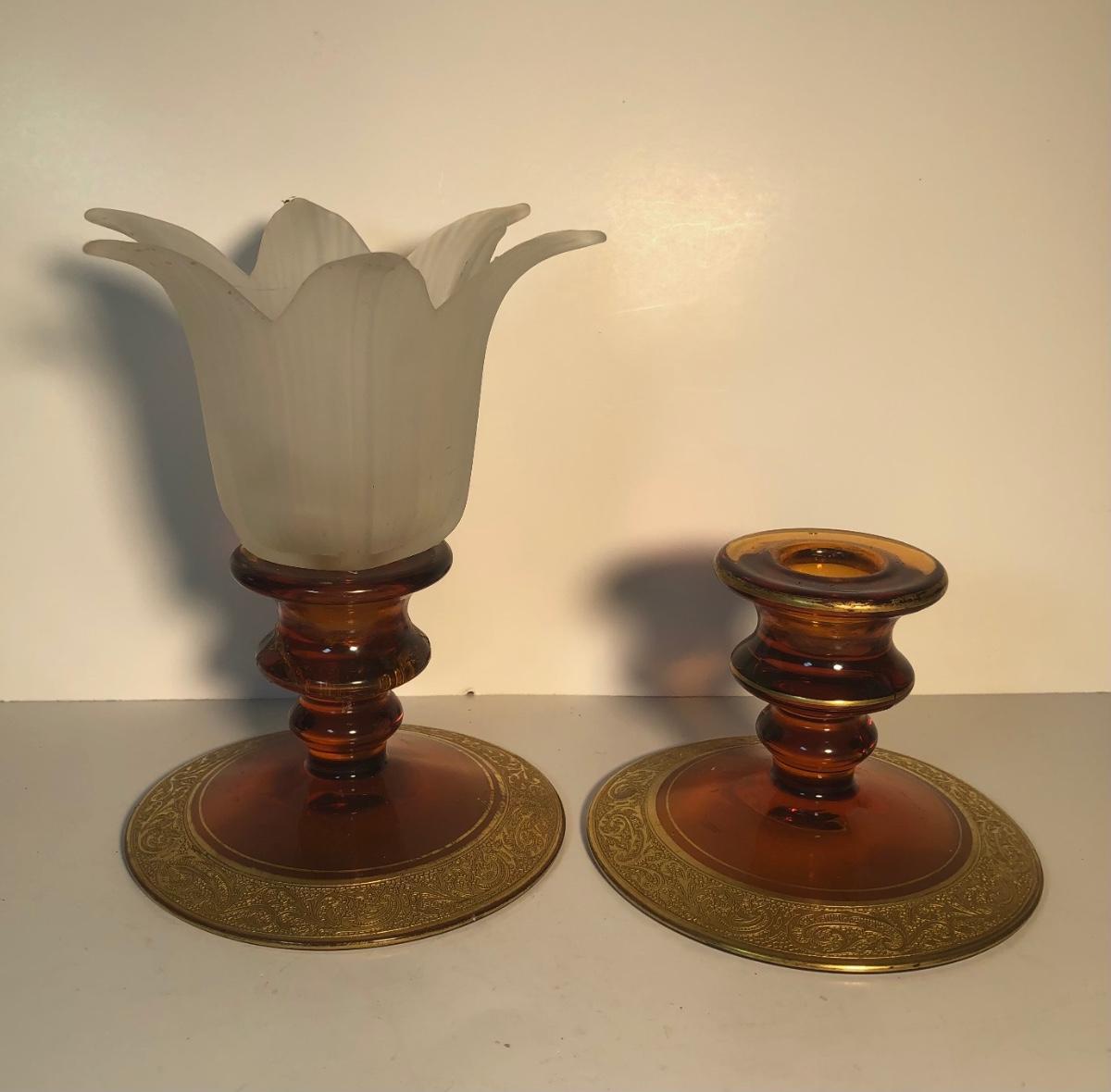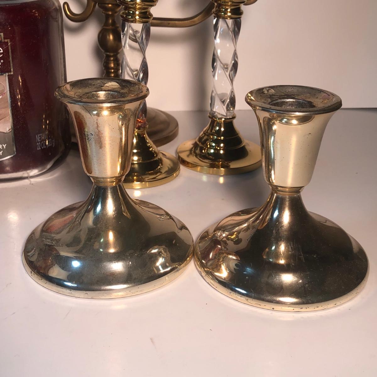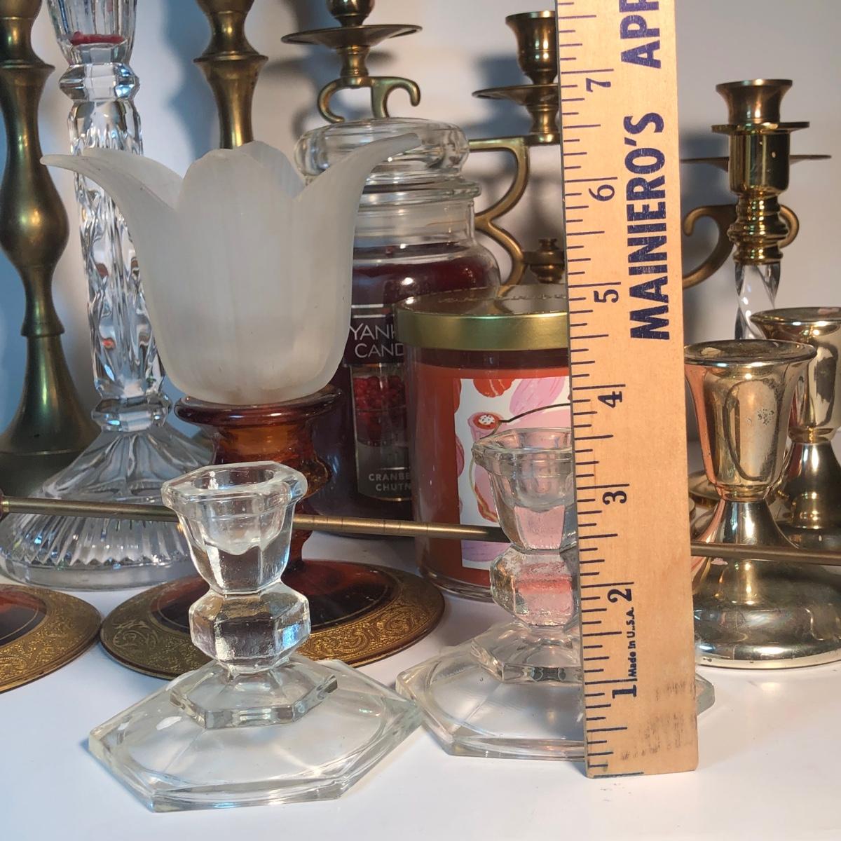 LOT 128L: Candle Collection - Brass Candle Holders, Amber Glass Candlestick Holders, Yankee Candle, Snuffer & More