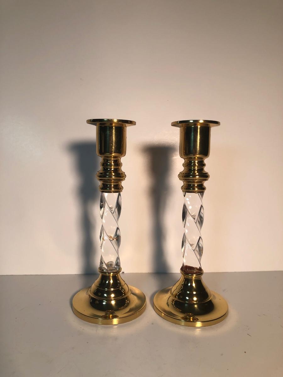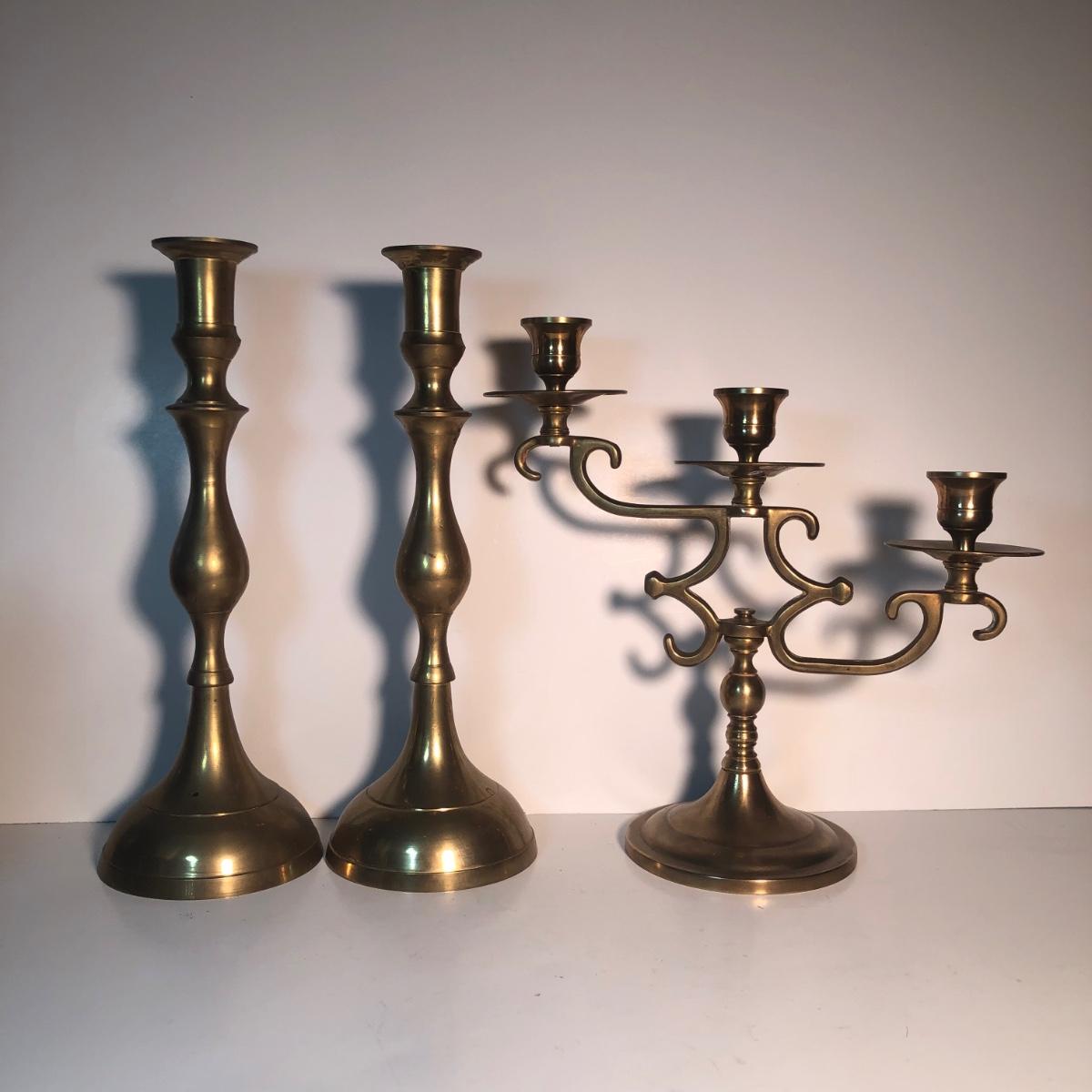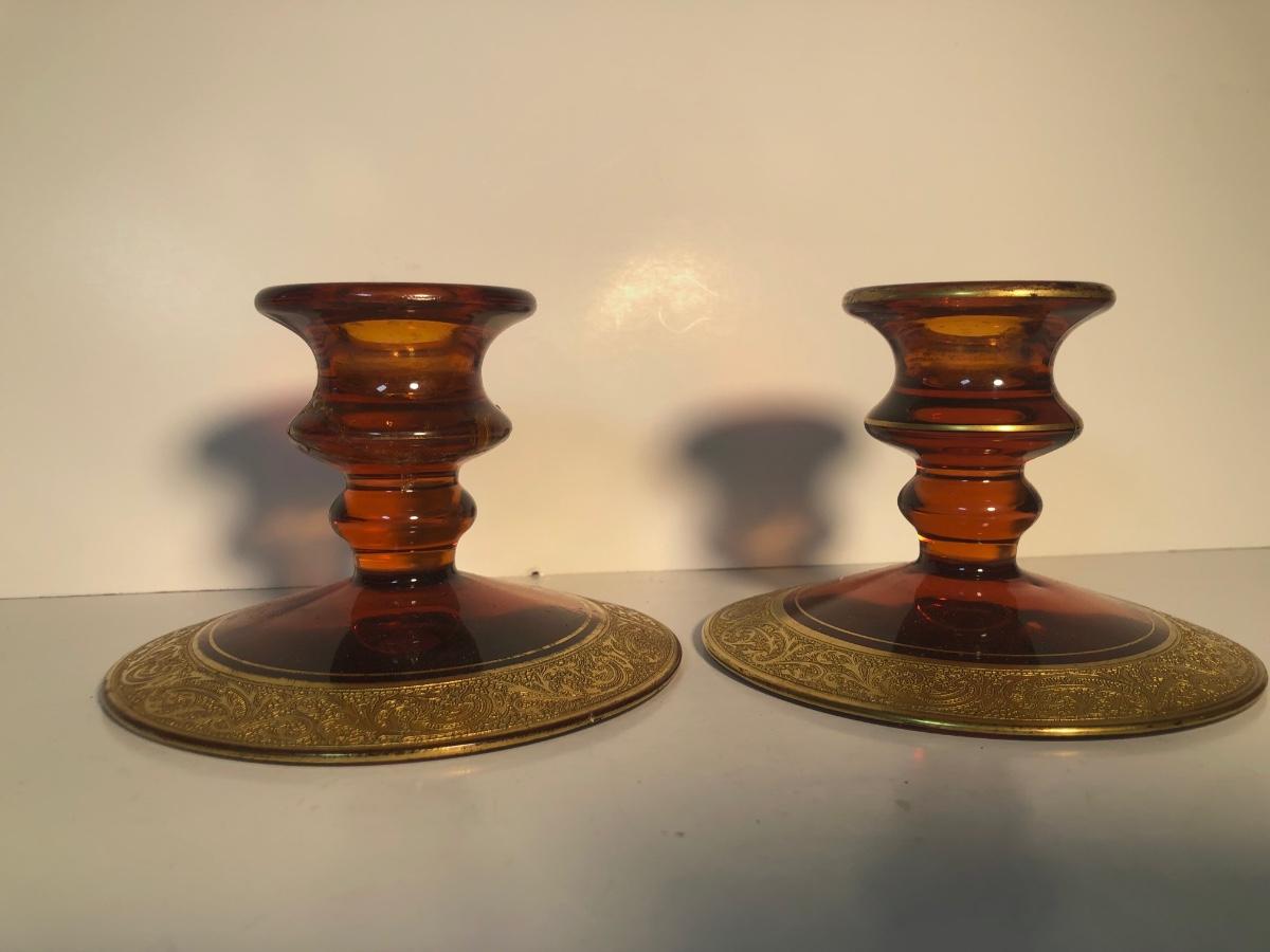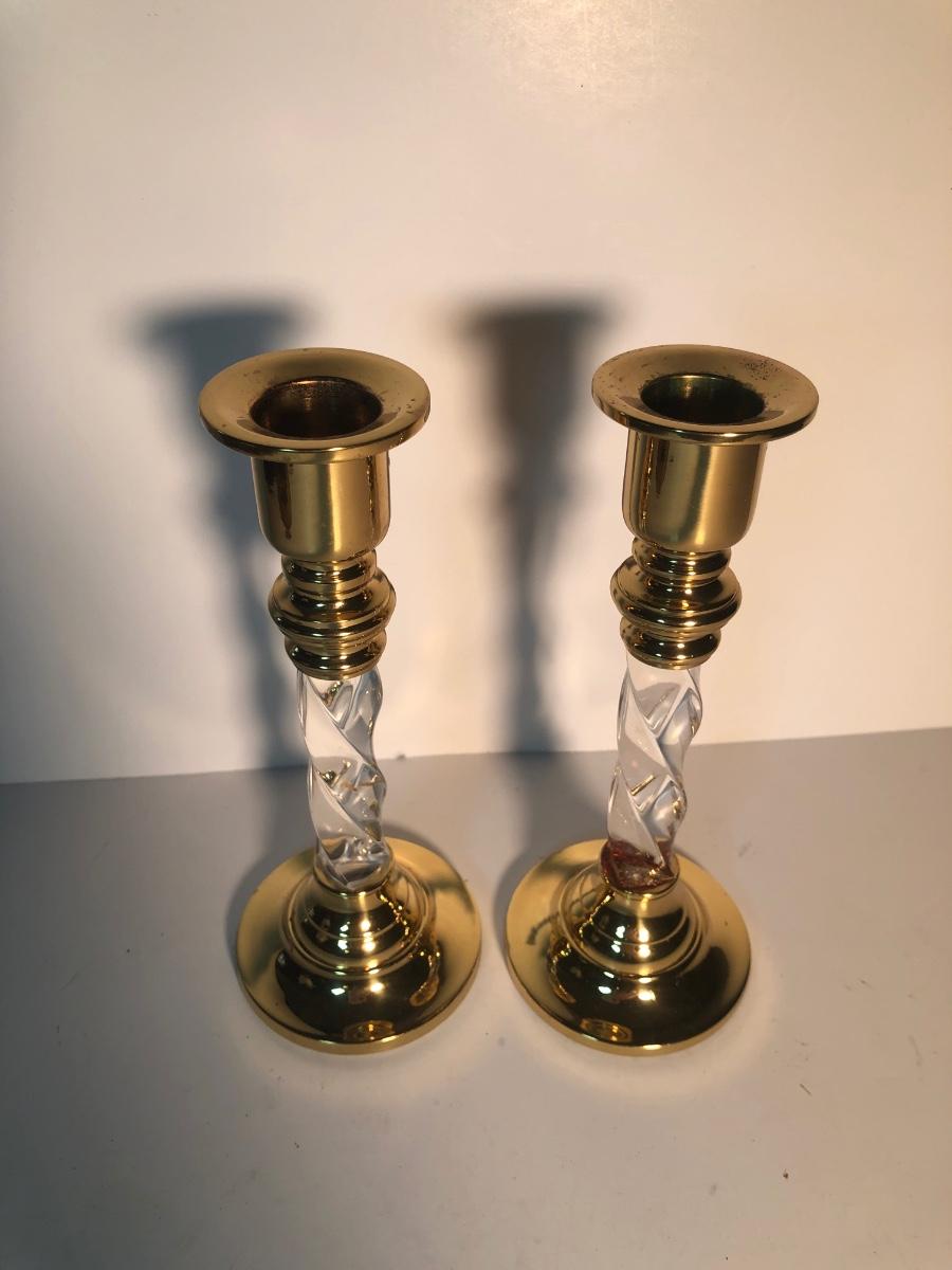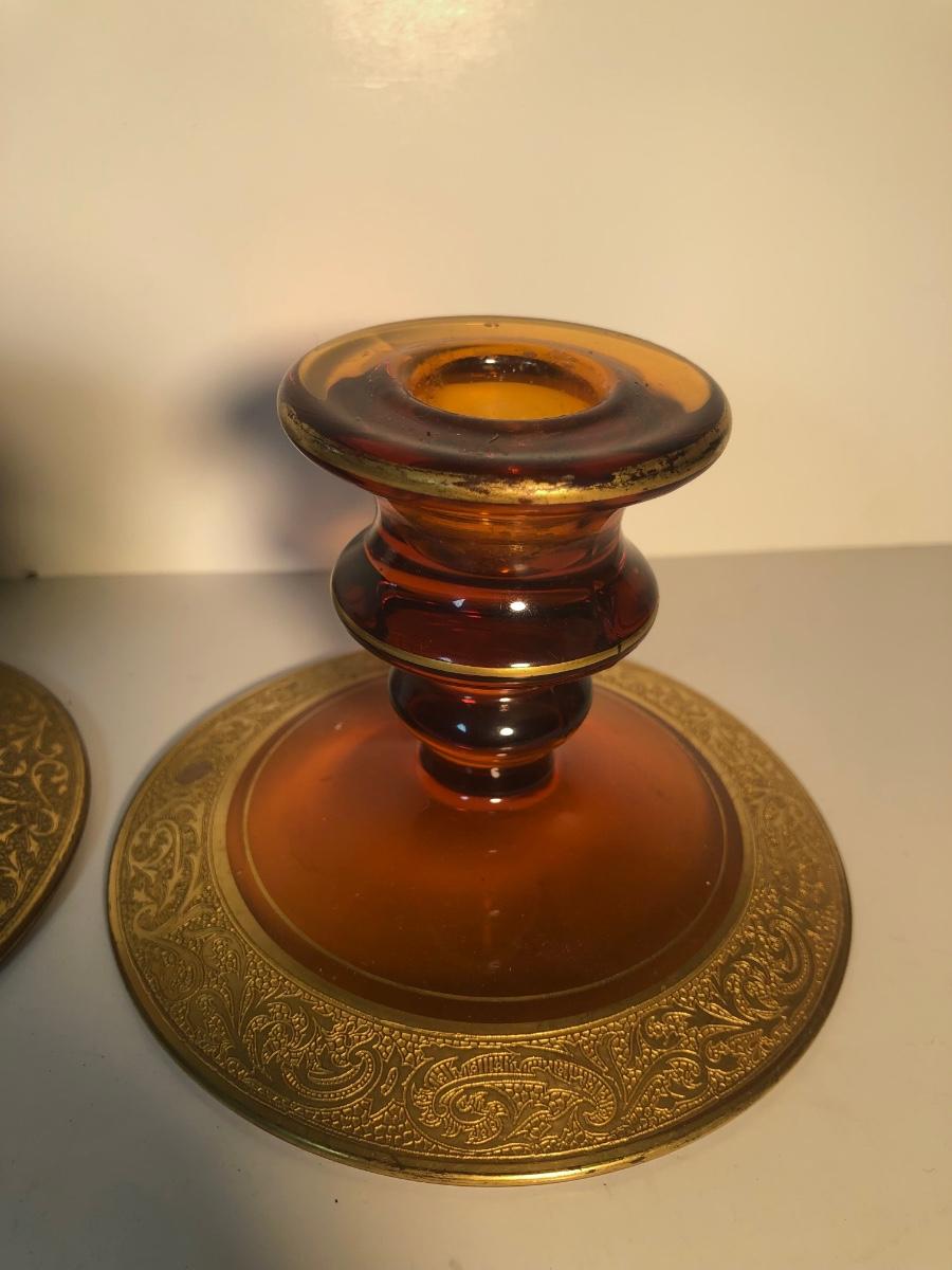 LOT 128L: Candle Collection - Brass Candle Holders, Amber Glass Candlestick Holders, Yankee Candle, Snuffer & More