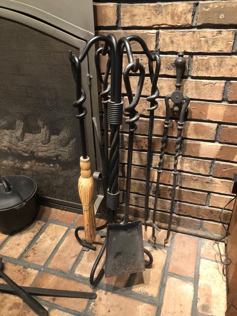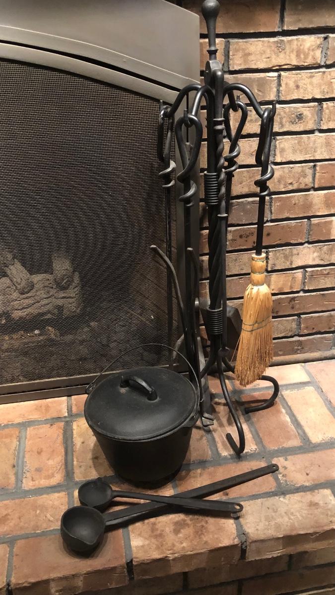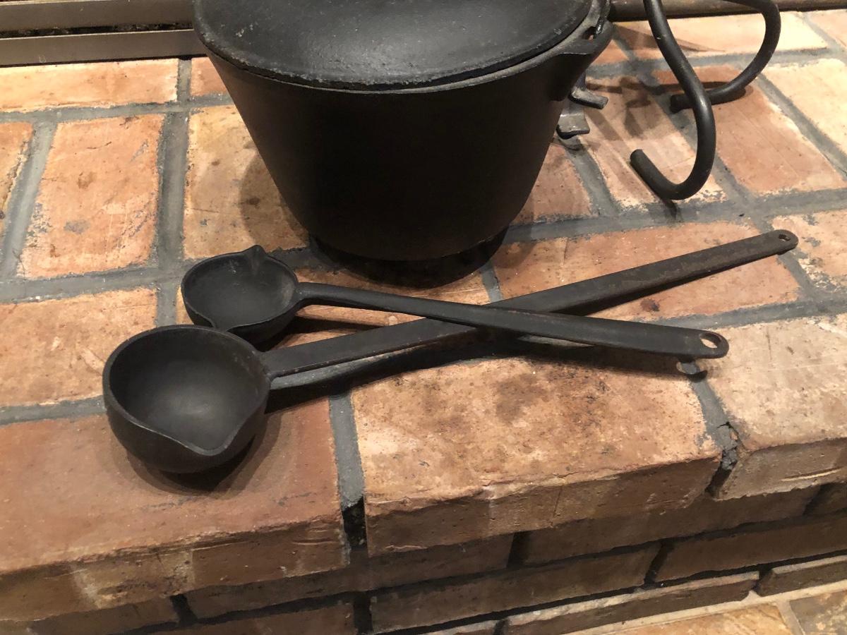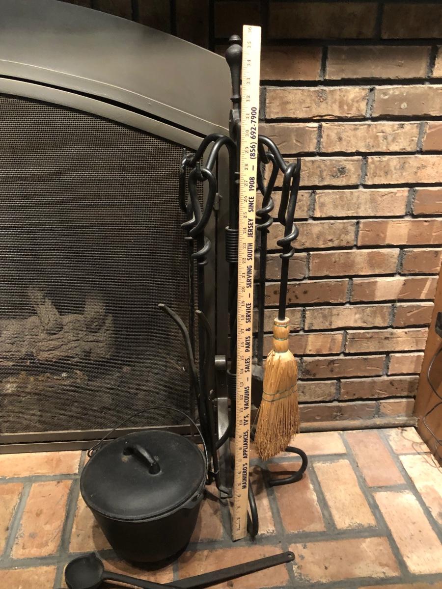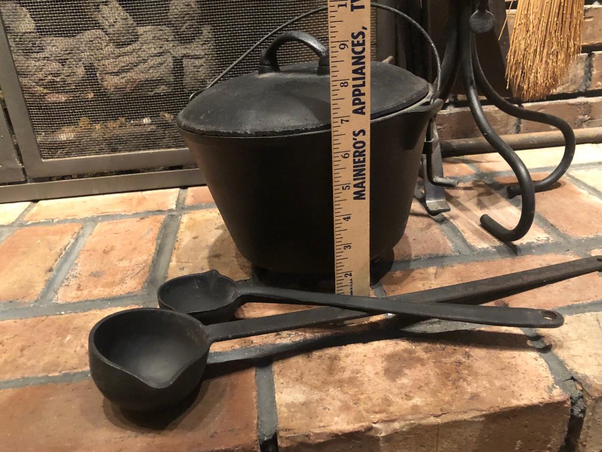 LOT 129L: Vintage Fireplace Tools w/ Rack, Footed Pot & Ladles