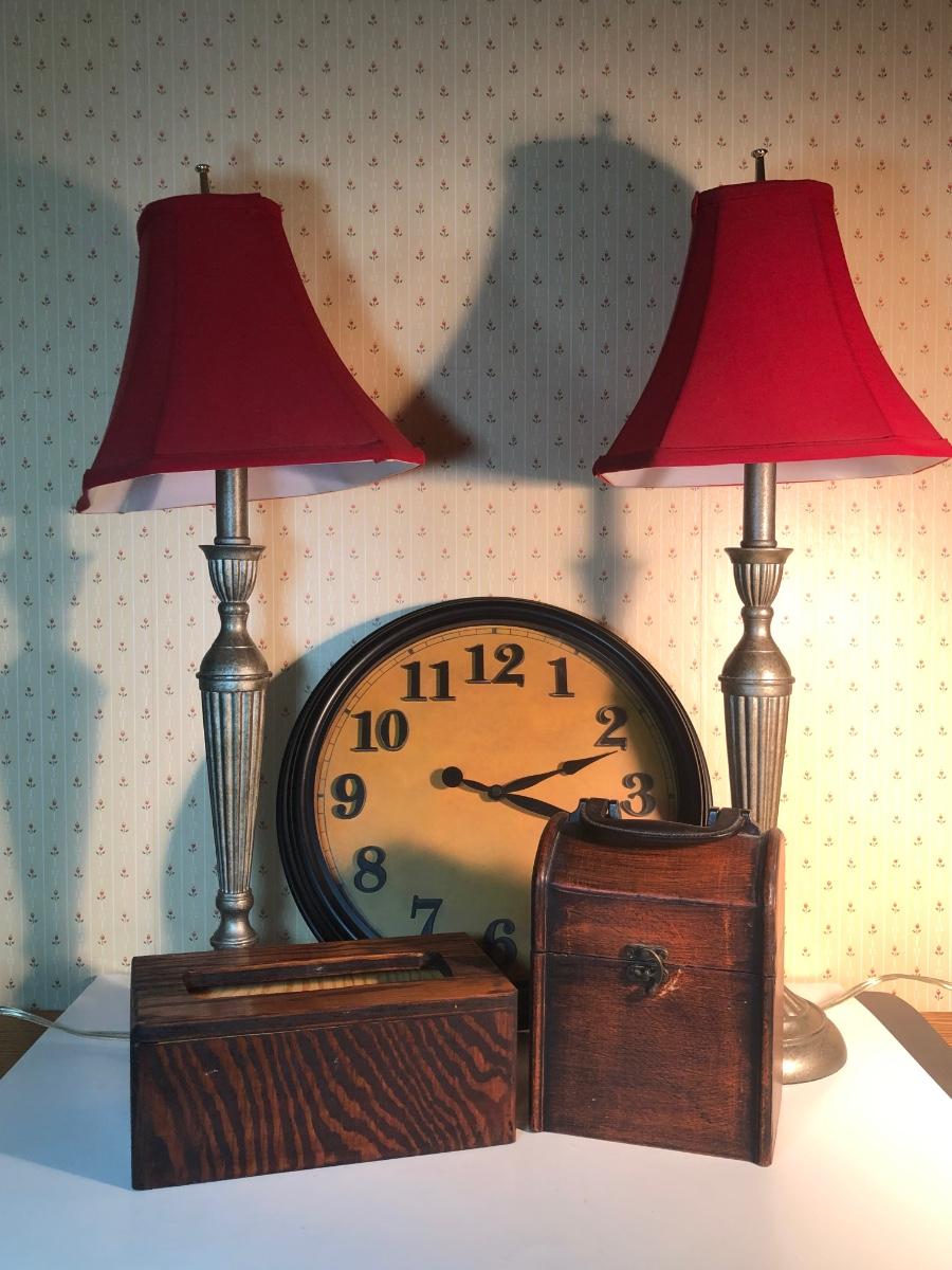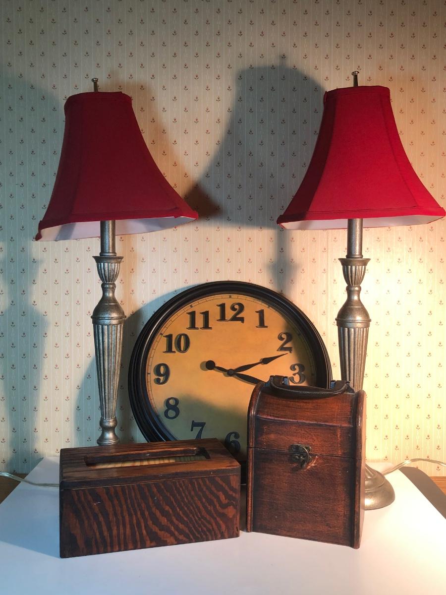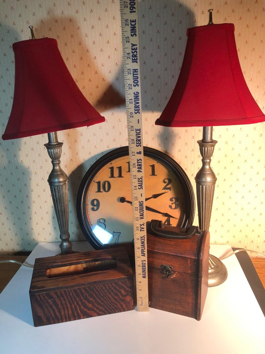 LOT 154M: Home Decor Collection - Red Shade Lamps, Clock, Decorative Wooden Box & Tissue Box Cover