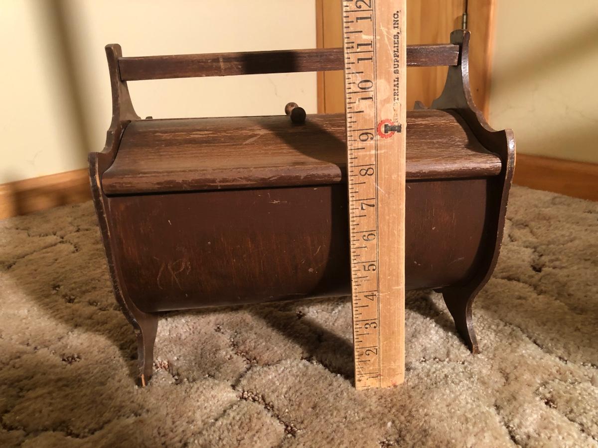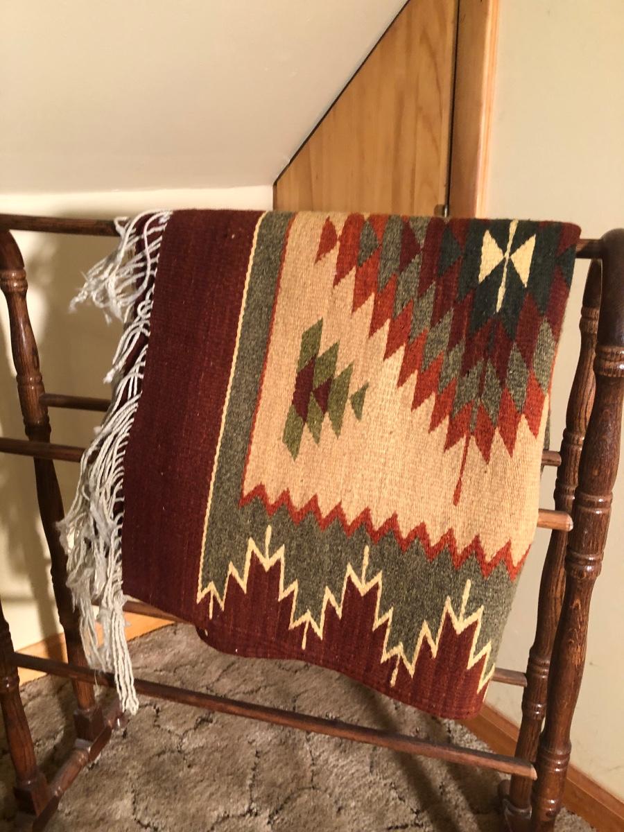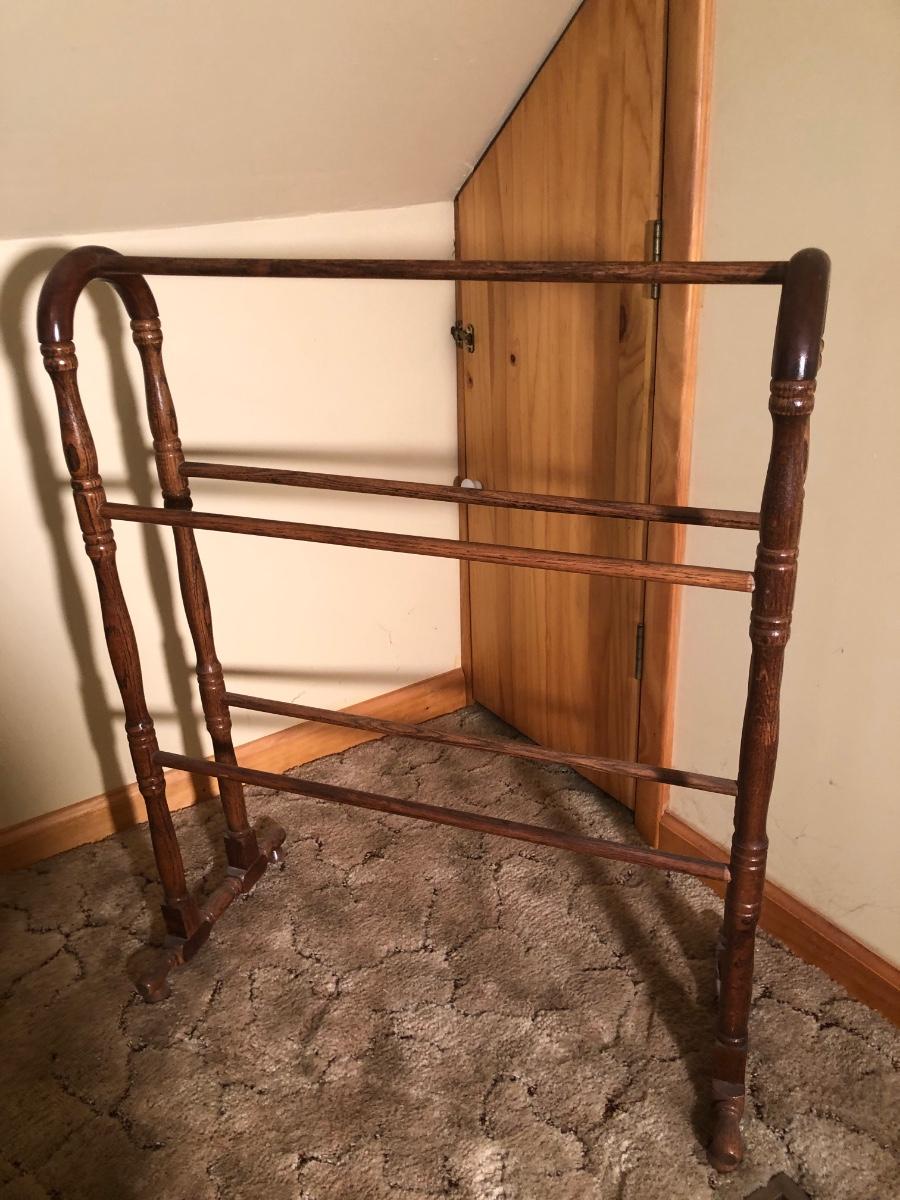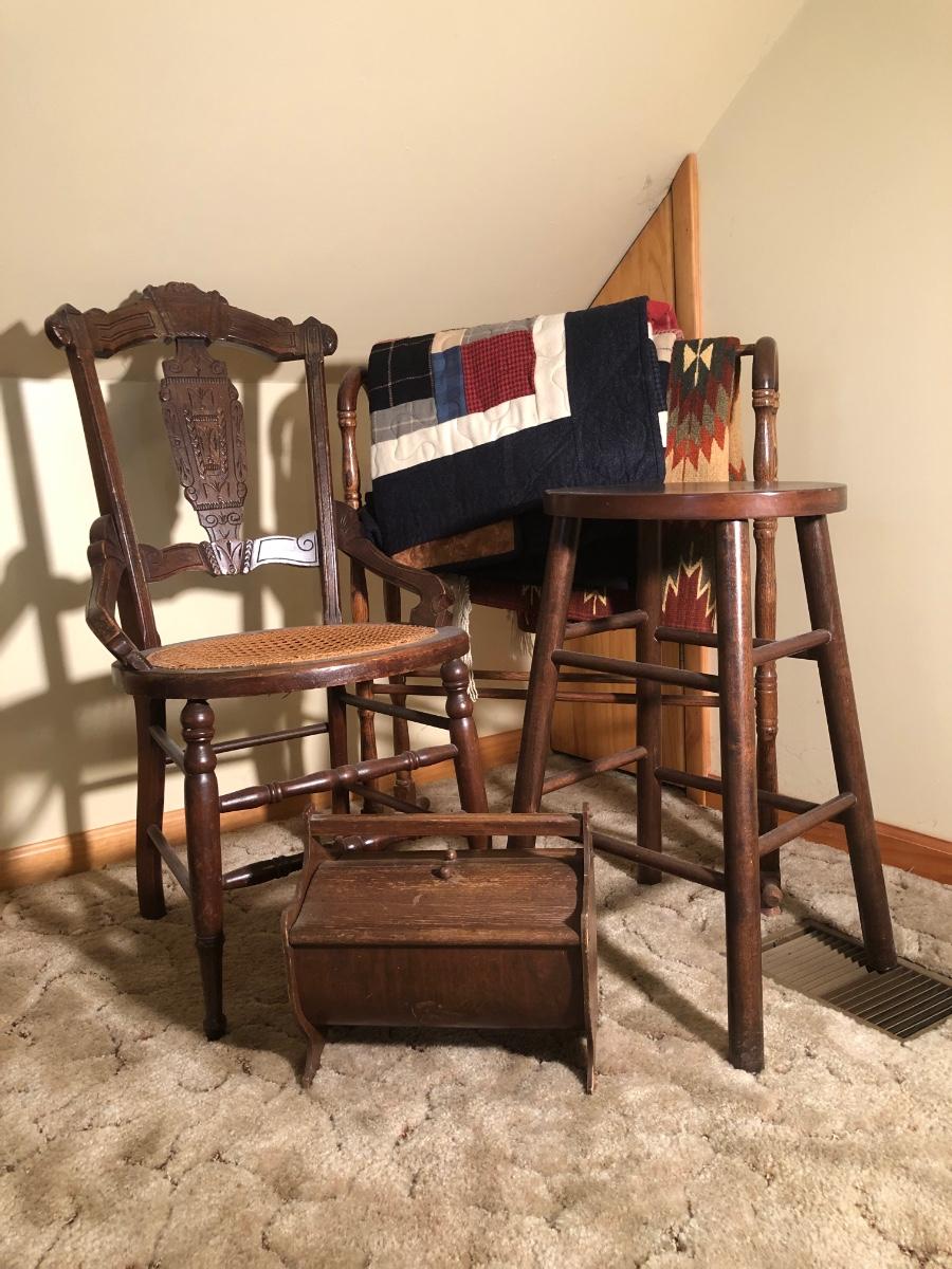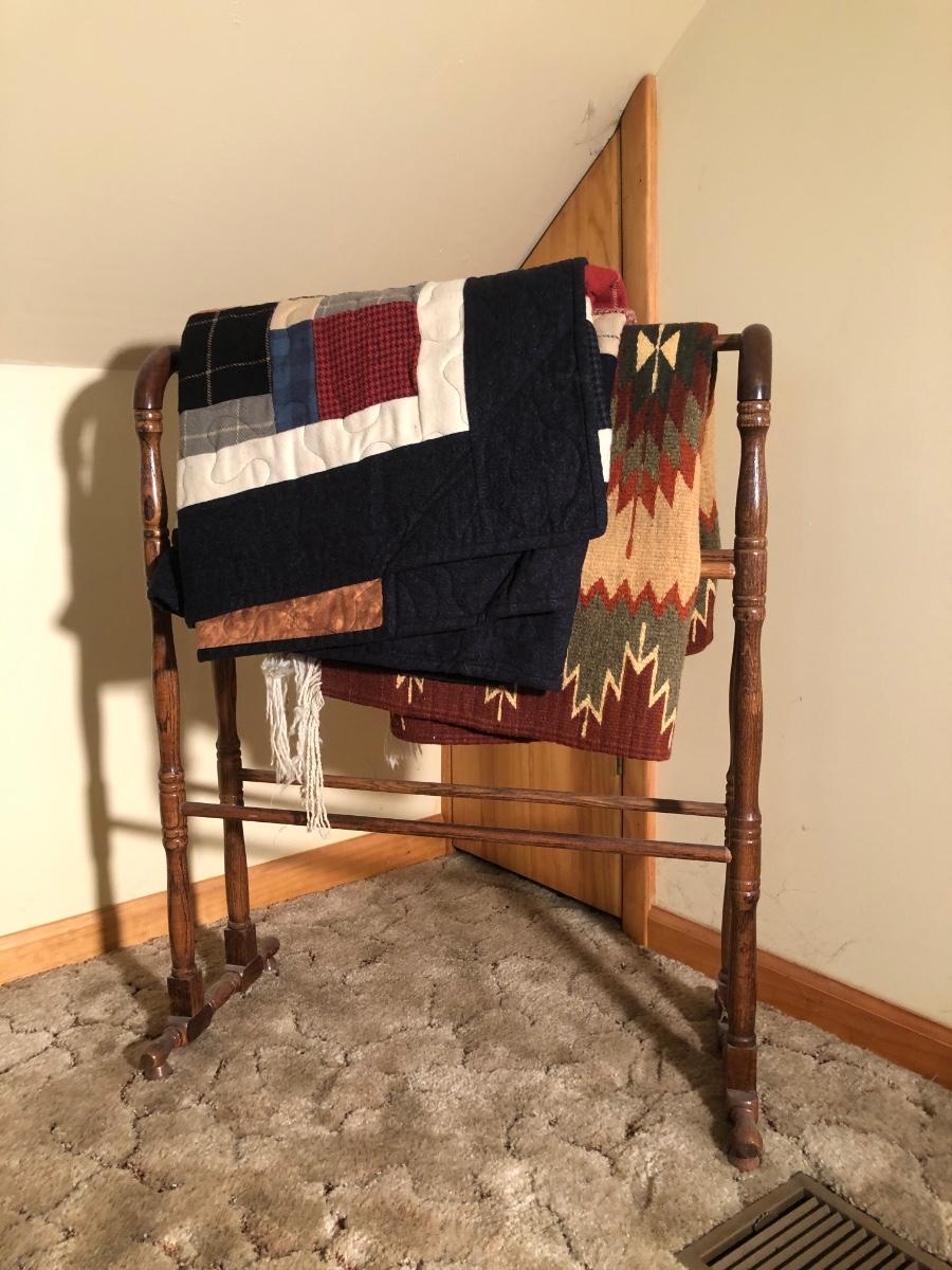 LOT 160U: Vintage Can Seat Carved Chair, Quilt Rack, Stool, Sewing Caddy & Blankets