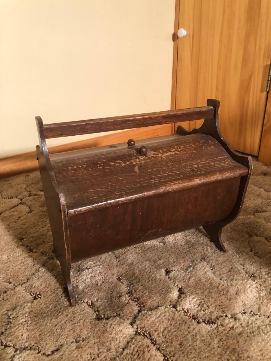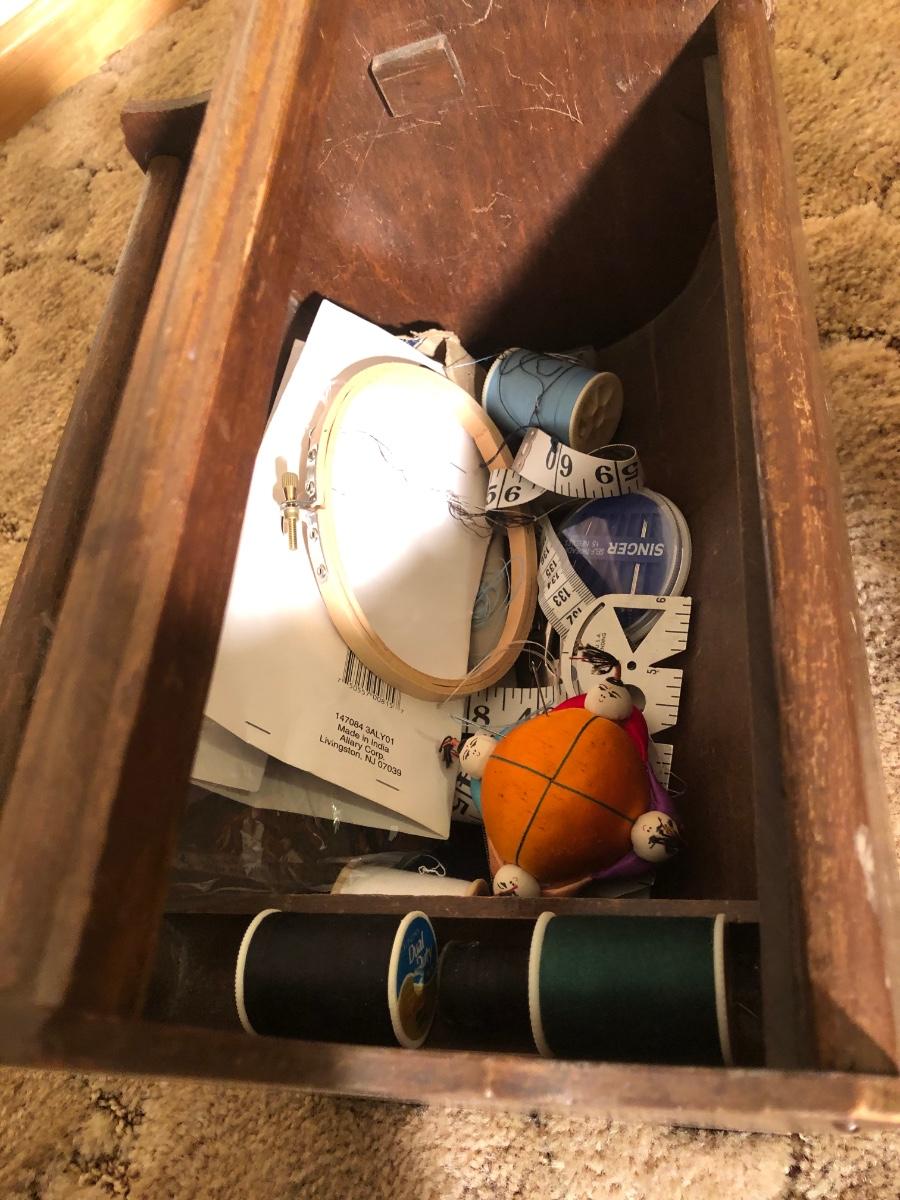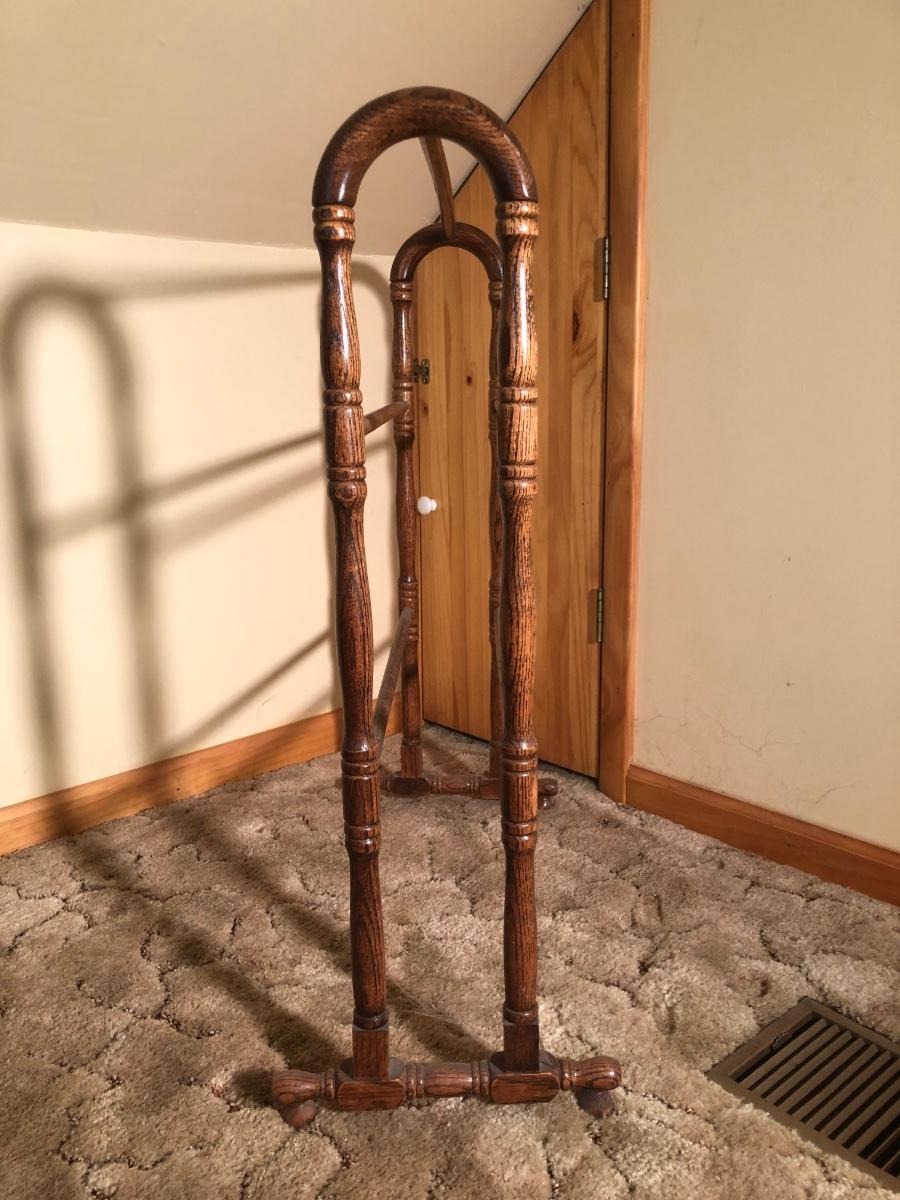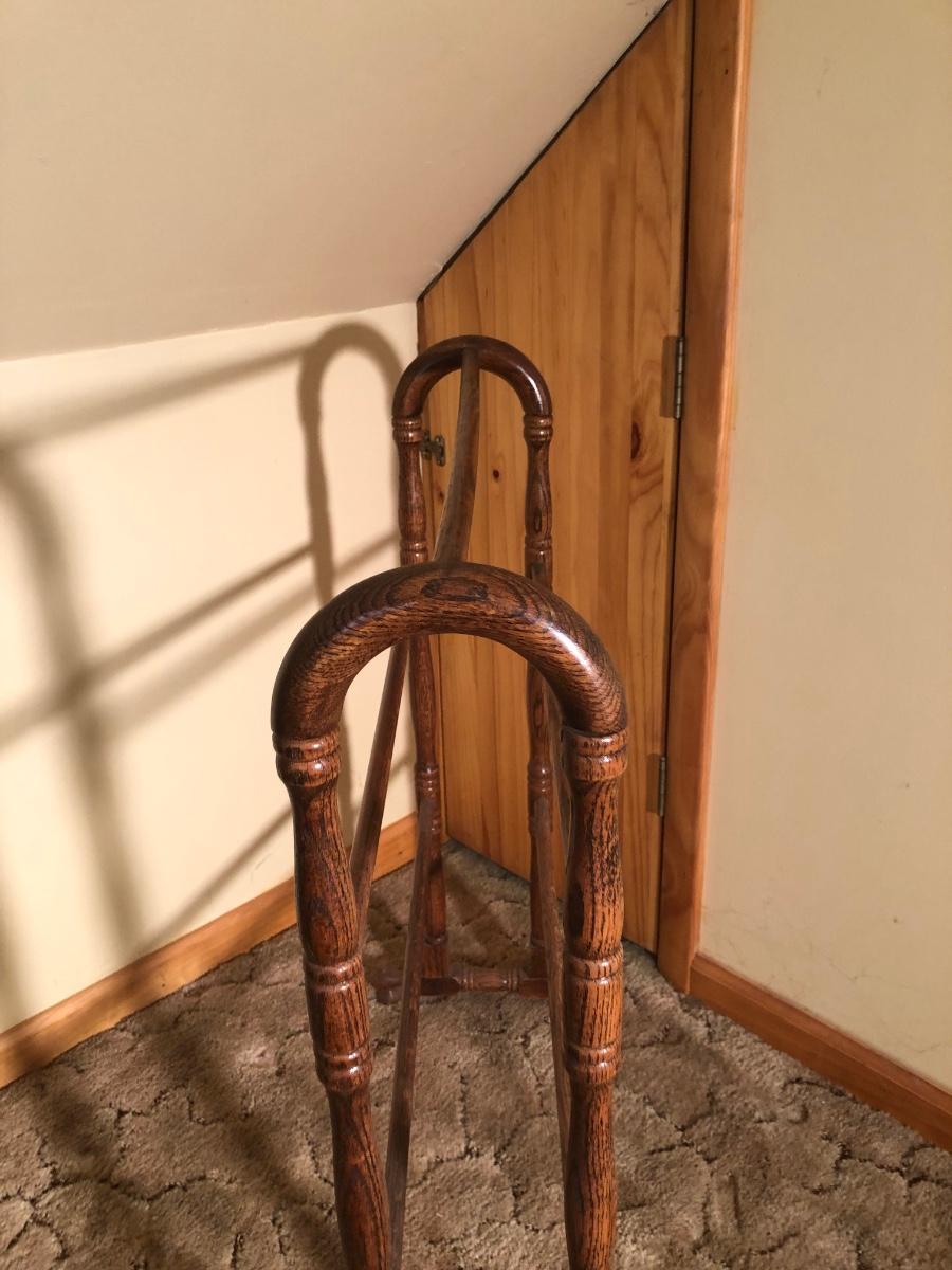 LOT 160U: Vintage Can Seat Carved Chair, Quilt Rack, Stool, Sewing Caddy & Blankets