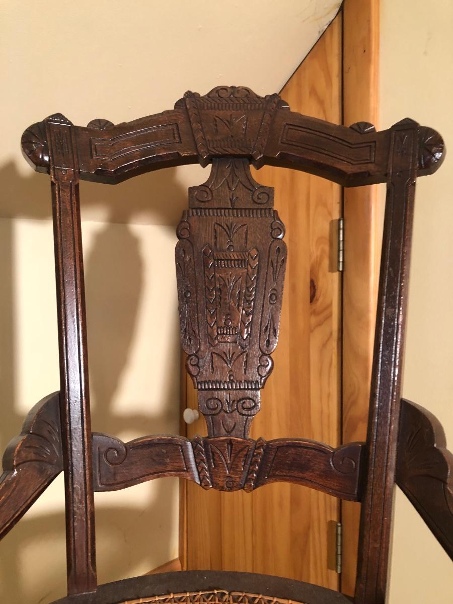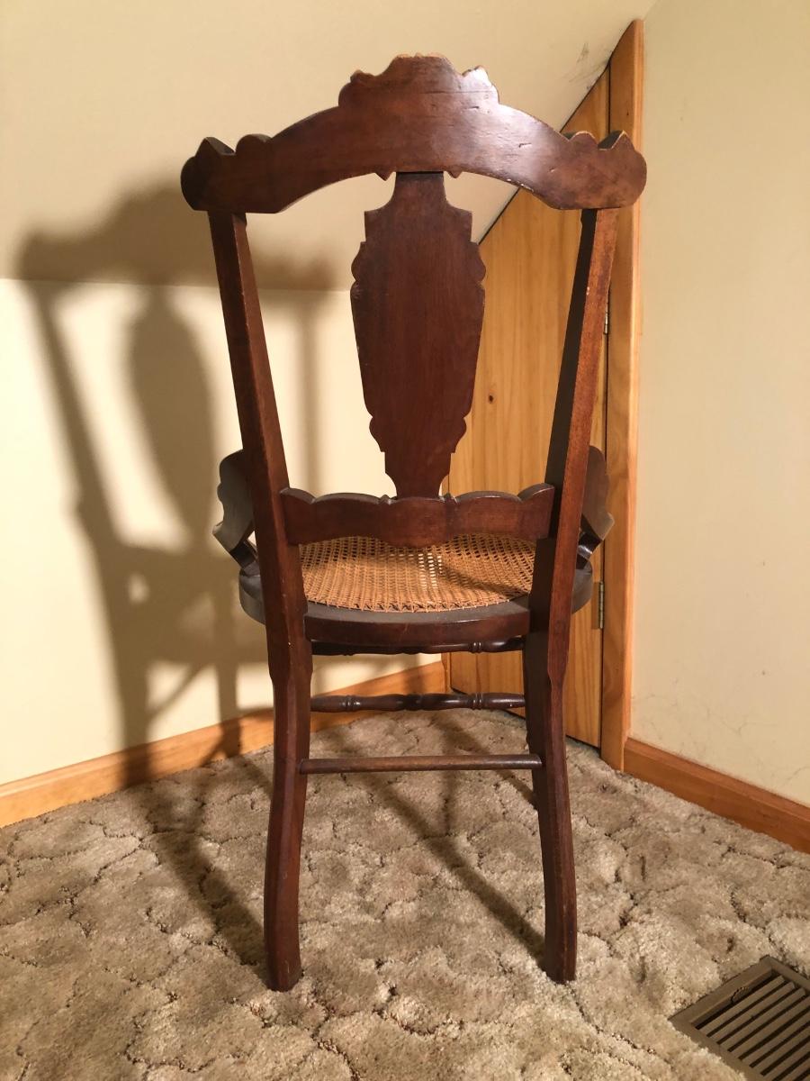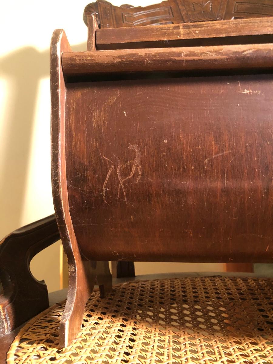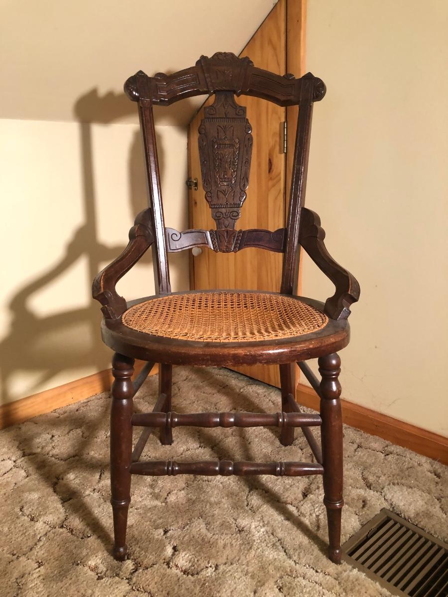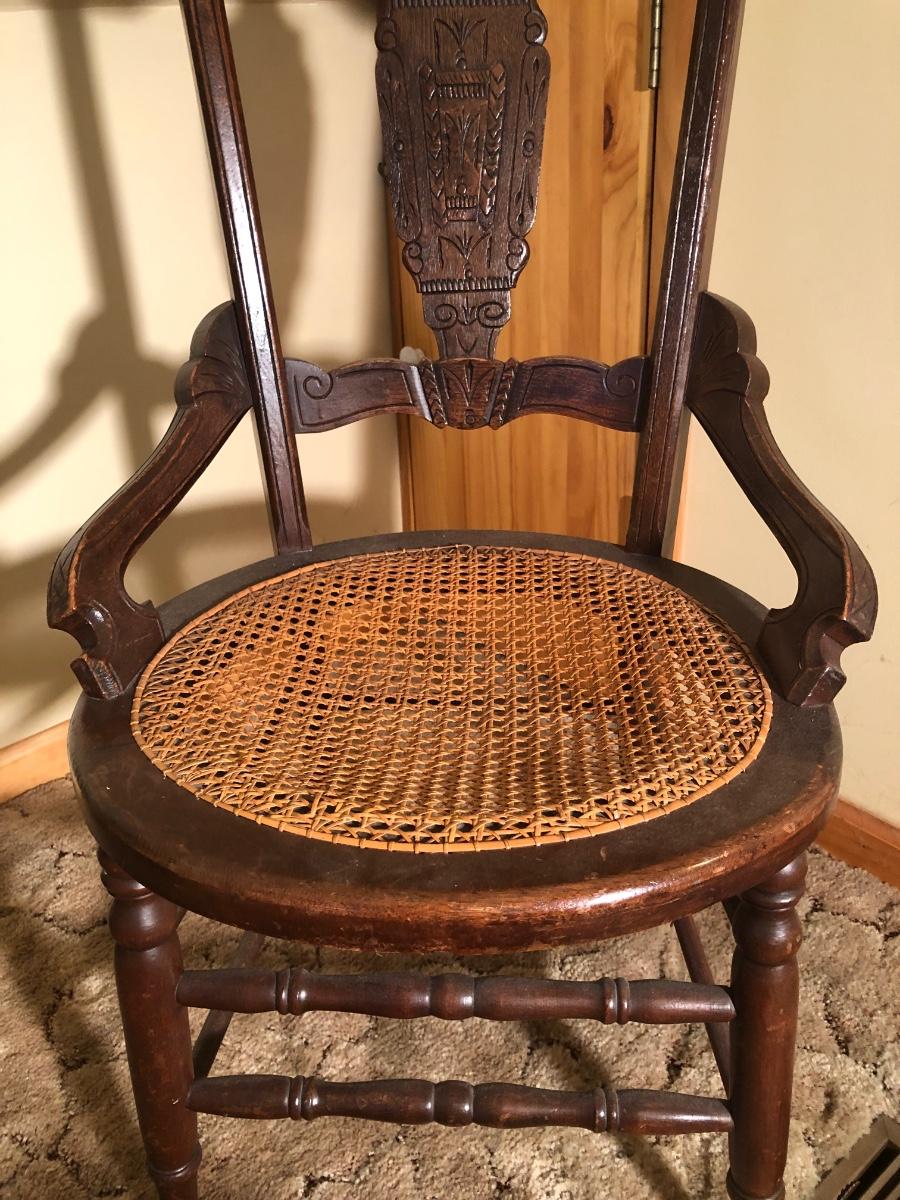 LOT 160U: Vintage Can Seat Carved Chair, Quilt Rack, Stool, Sewing Caddy & Blankets