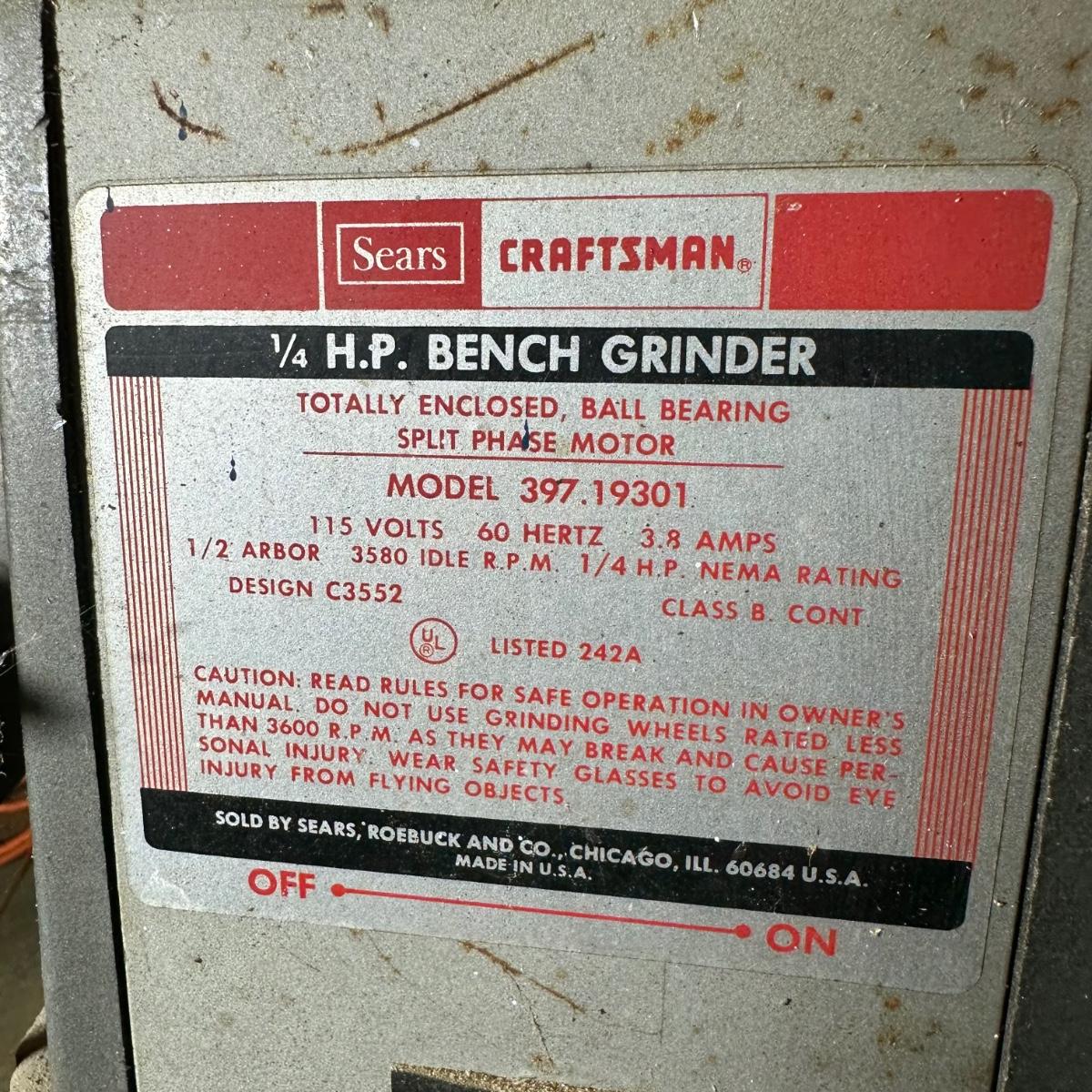 LOT 202G: Craftsman ¼ H.P. BENCH GRINDER Model 397-19301