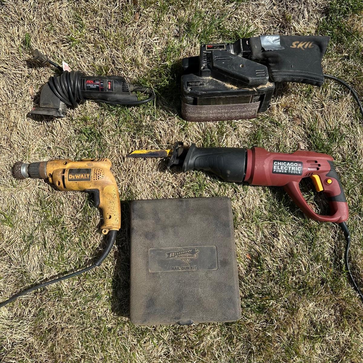 LOT 215G: Power Tools - DeWalt D21008, Skil Belt Sander 7313, Reciprocating Saw & Nail Gun