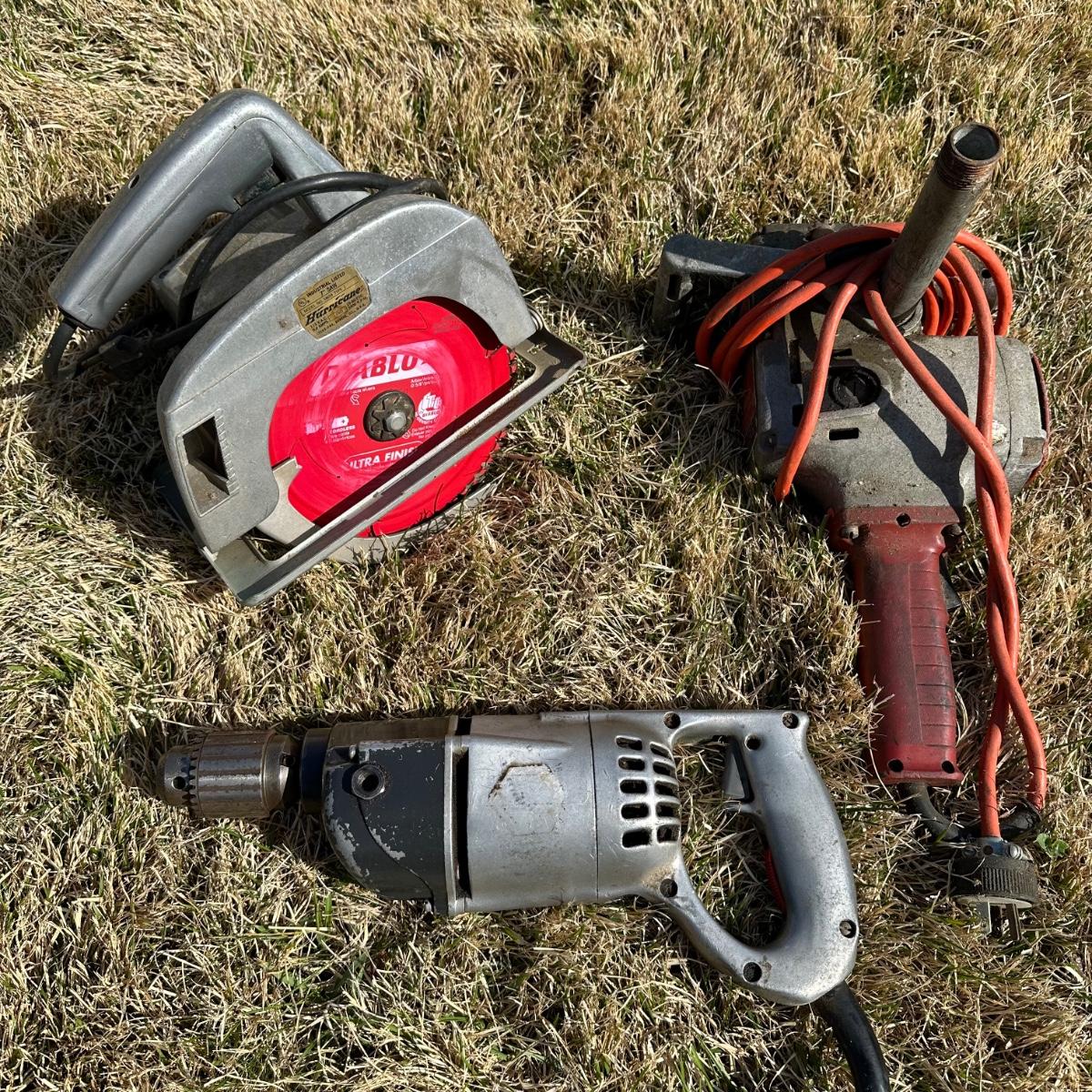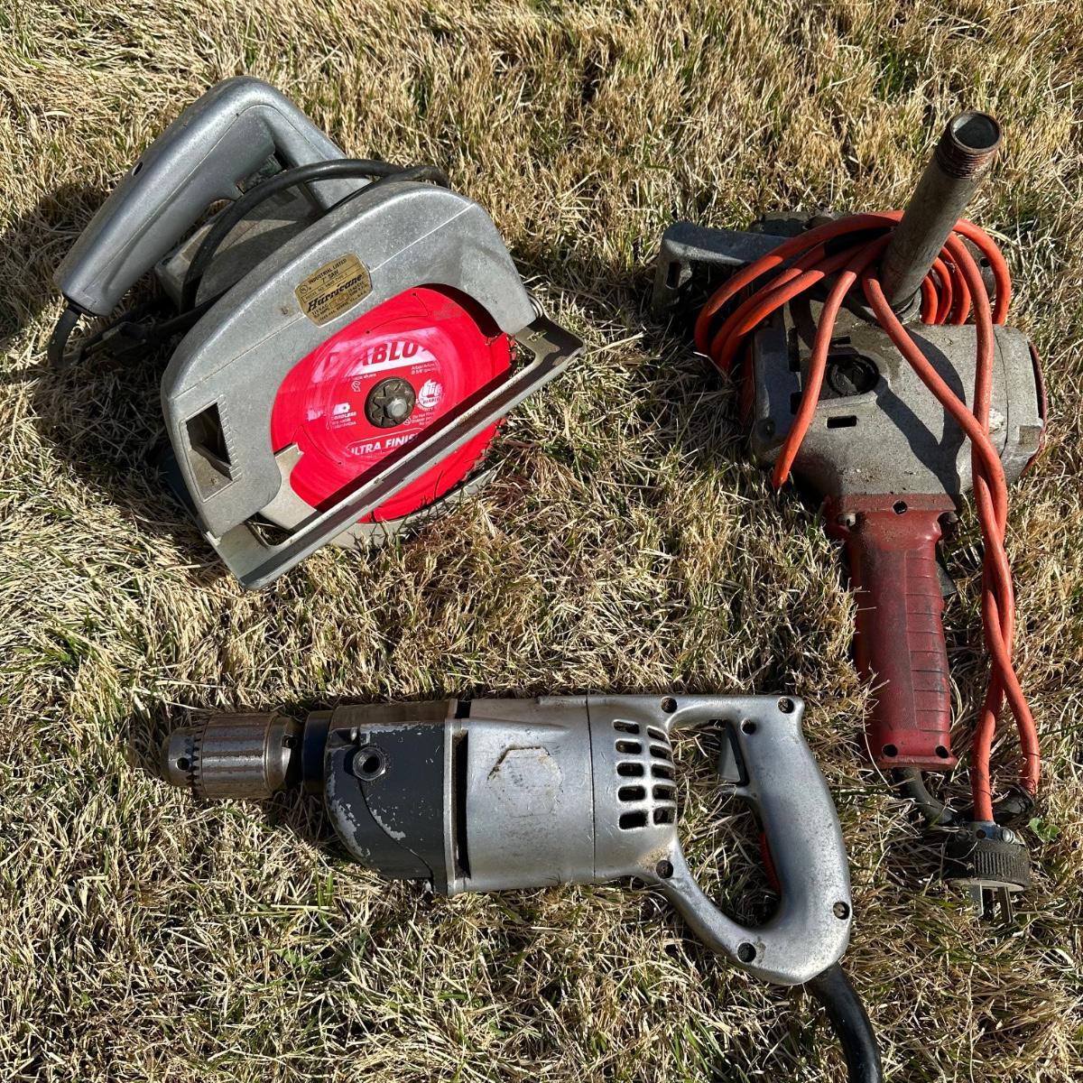 LOT 223G: Milwaukee Hole Hawg, Hurricane 7” Saw & Hammer Drill