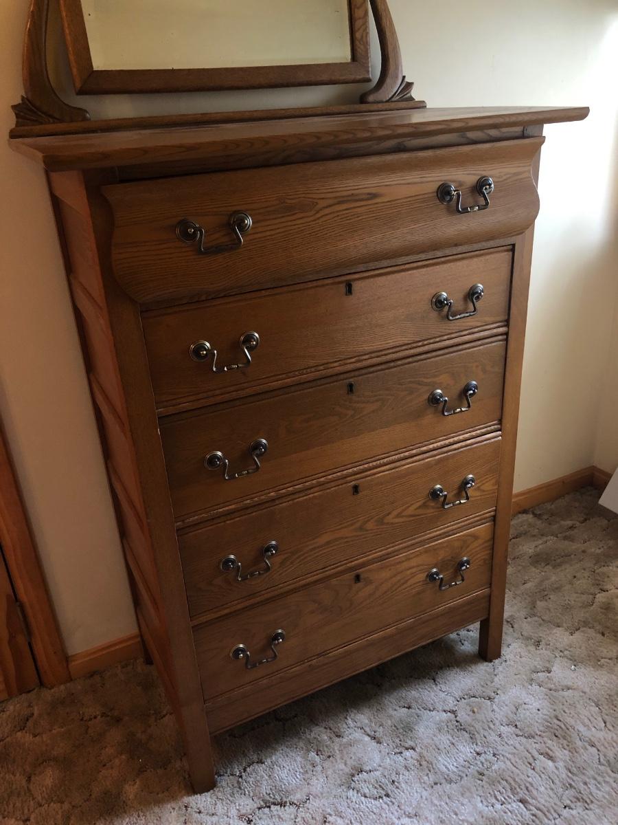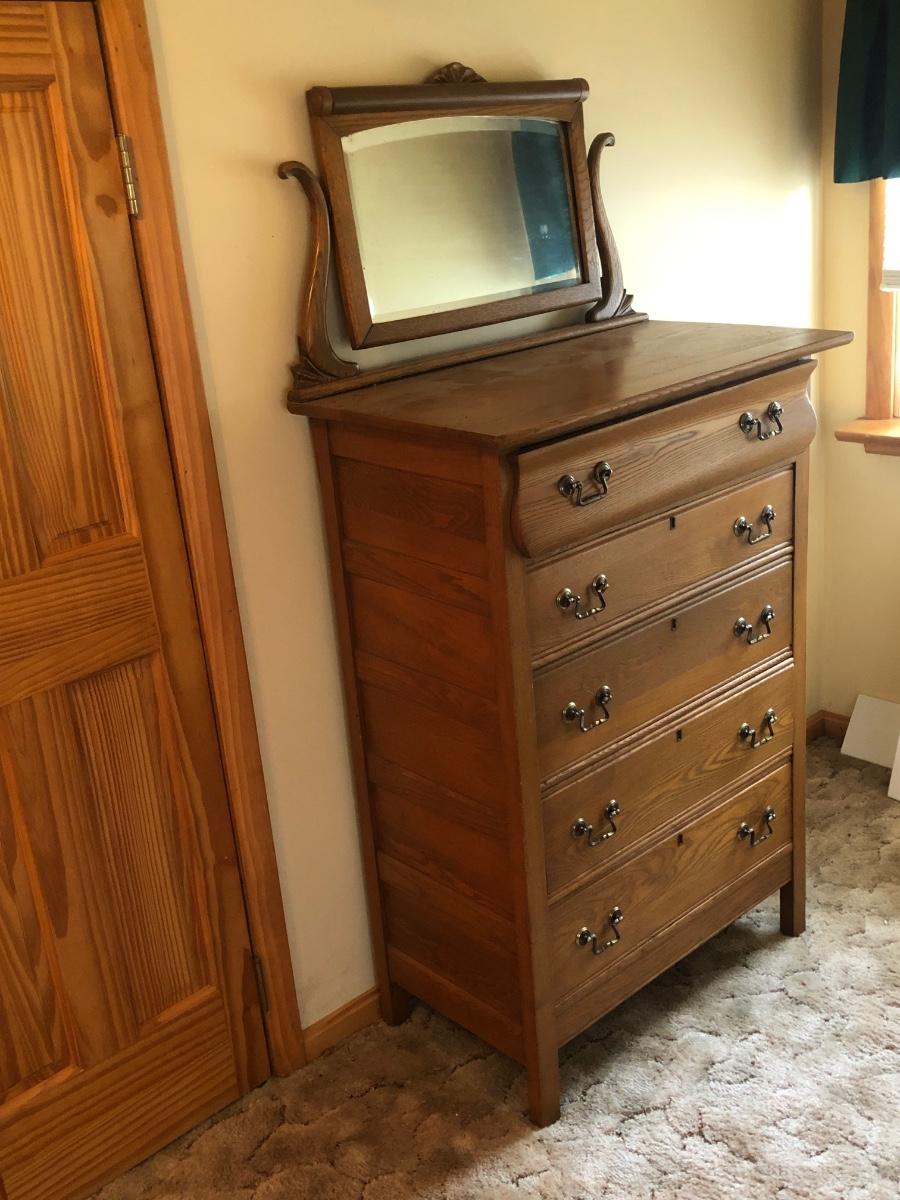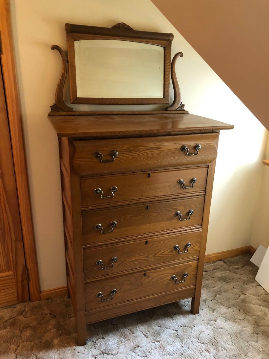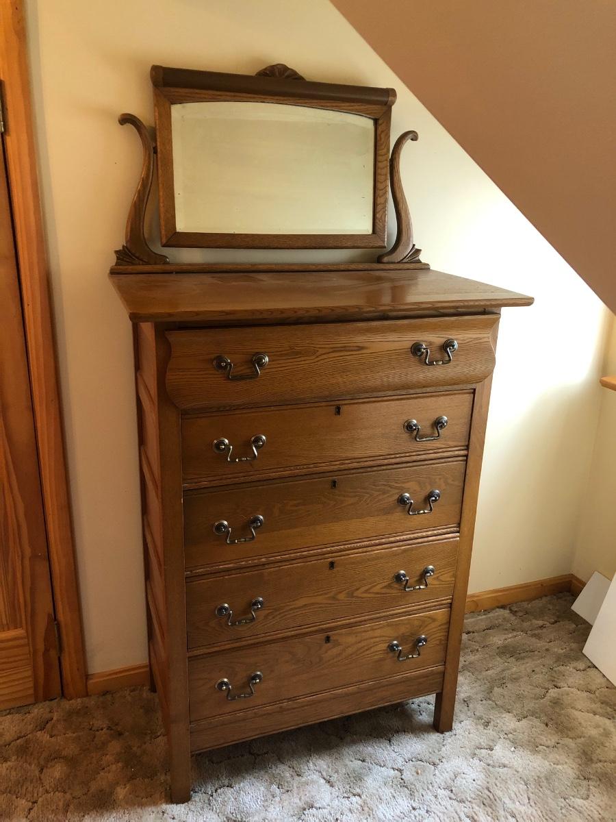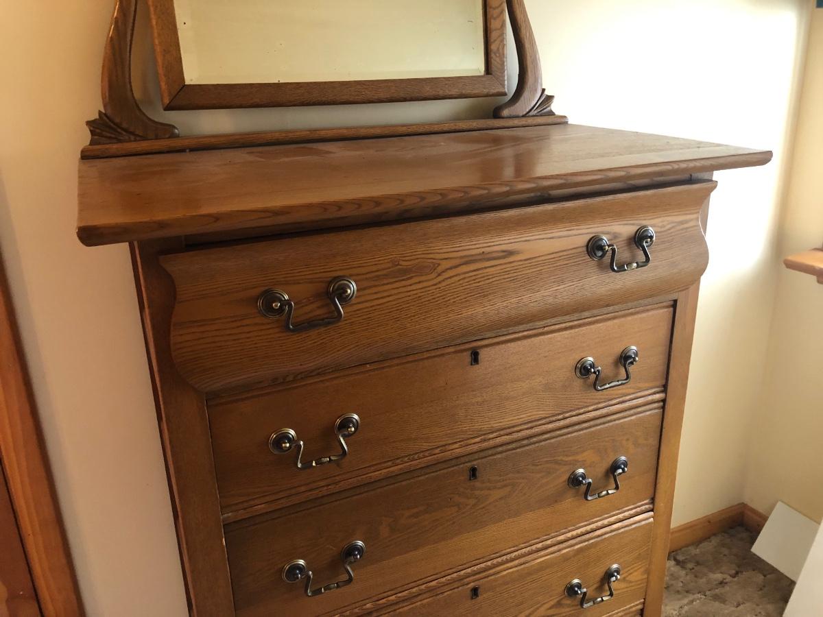 LOT 241U: Vintage 5-Drawer Wooden Dresser w/ Beveled Edge Mirror