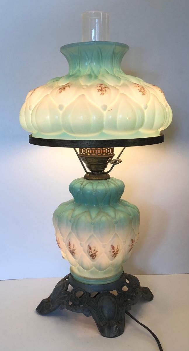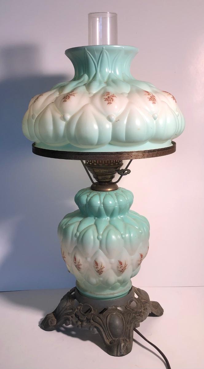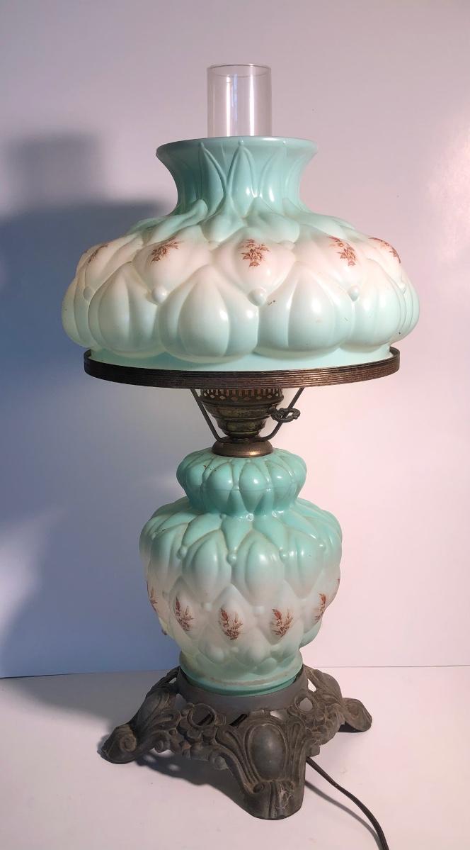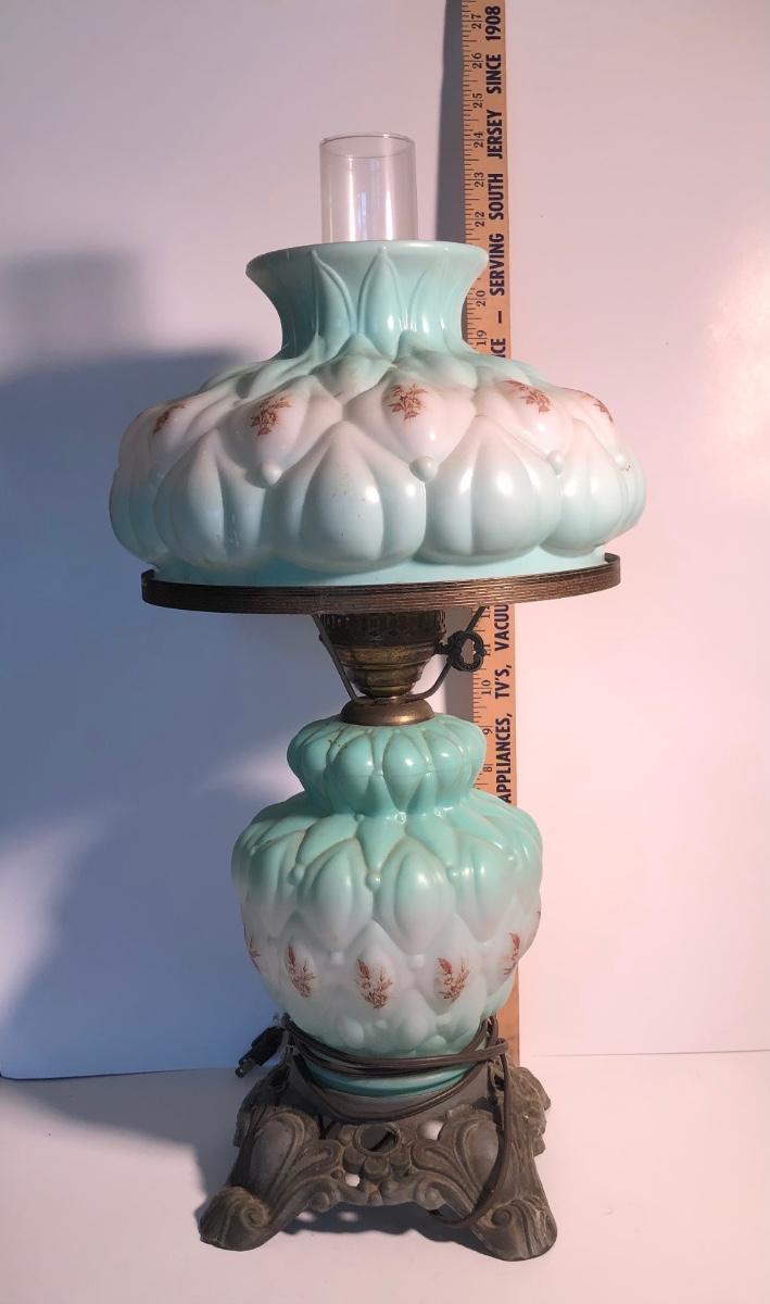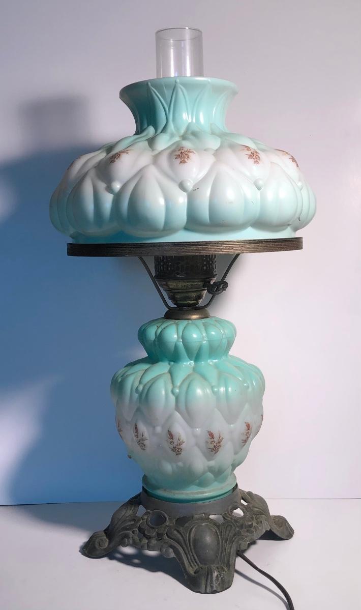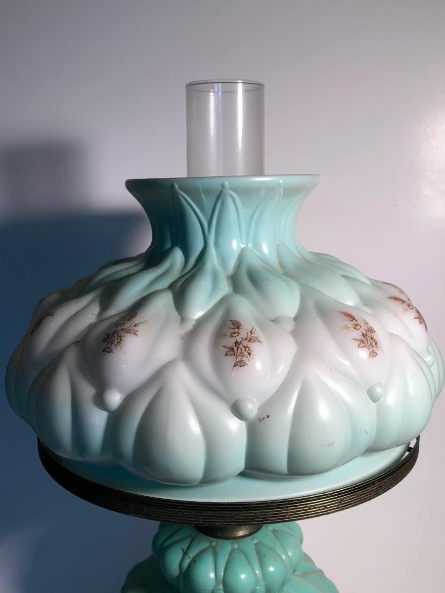 LOT 247U: Vintage Aqua Milk Glass Electric Hurricane Lamp (Works)