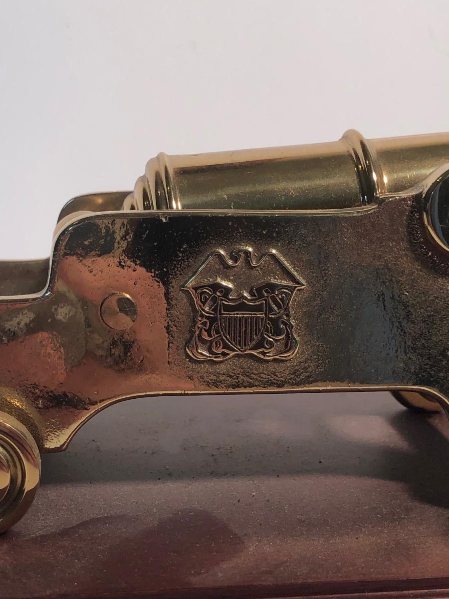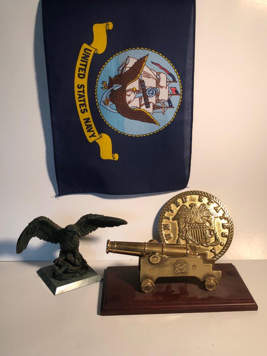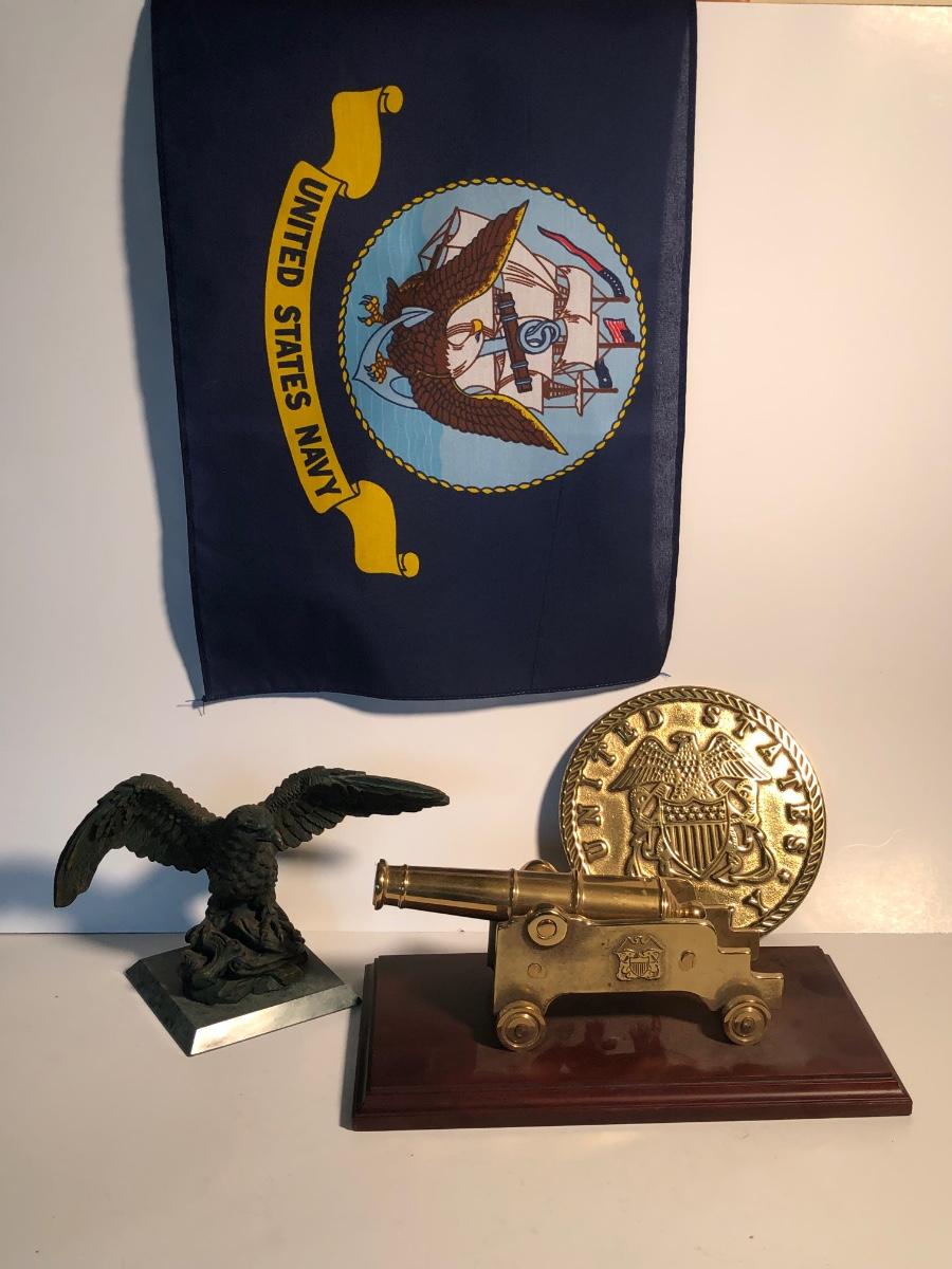 LOT 251U: US Navy Collection - Mid-20th Century Brass Canon, Flag, Trivet & Eagle Statue