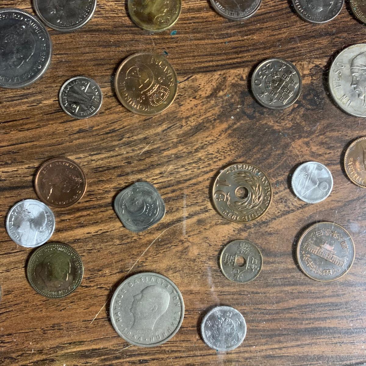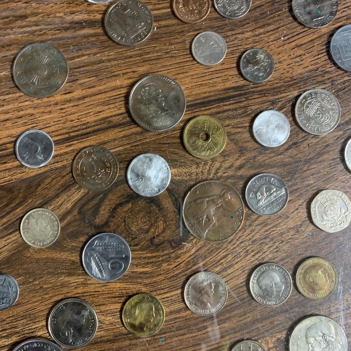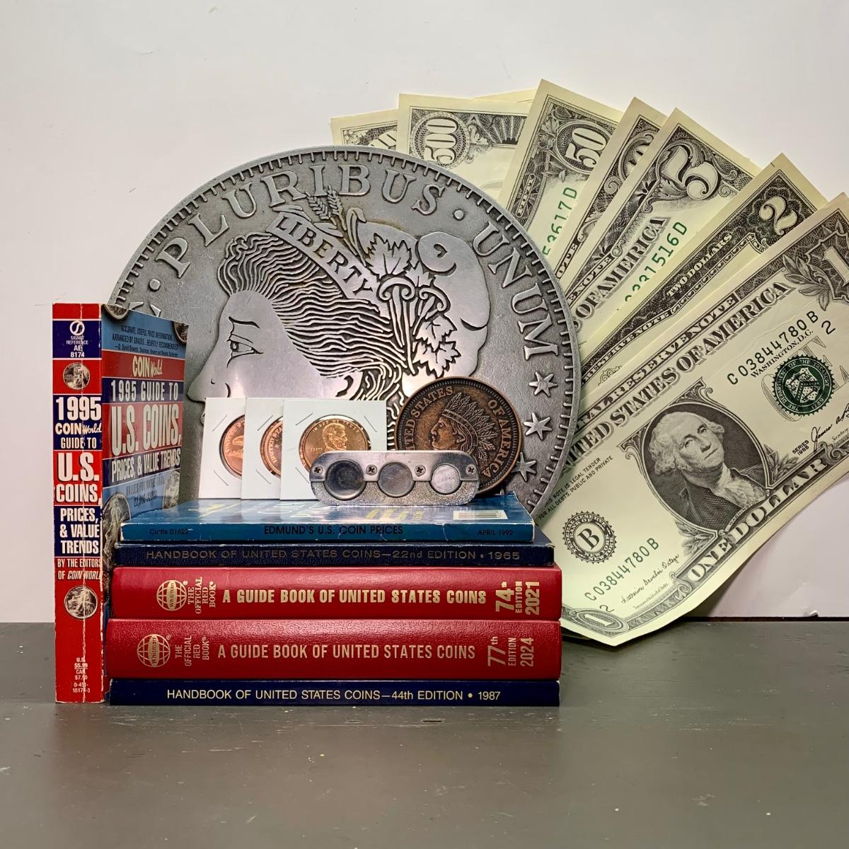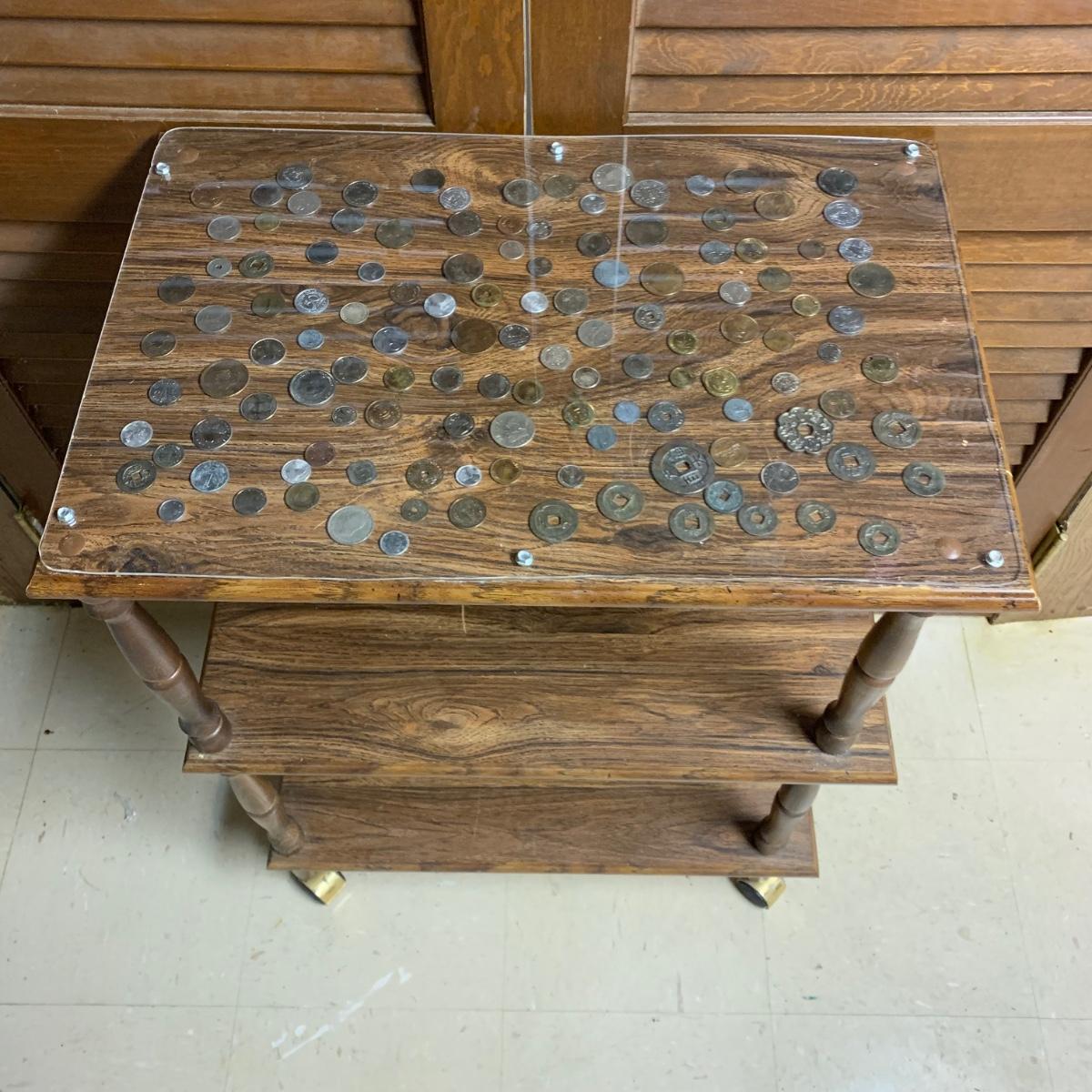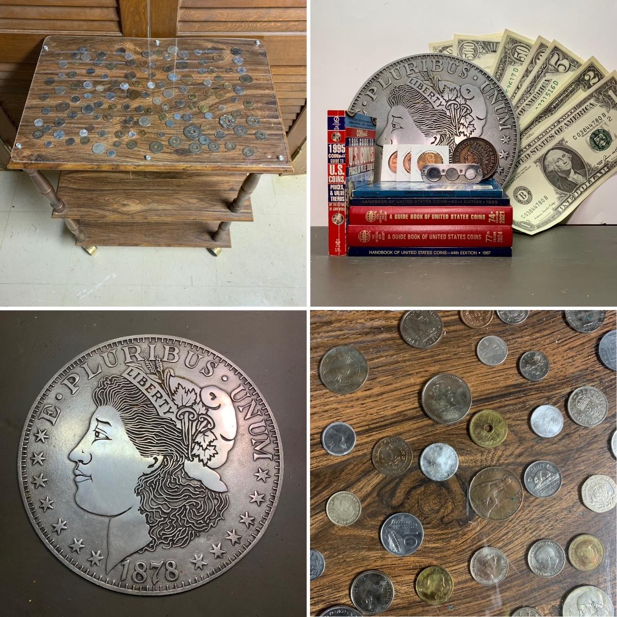 LOT 288 B: Make Money Moves Collection: Rolling Multi Tiered Table W/ International Coins, Coin Collecting Books, & More