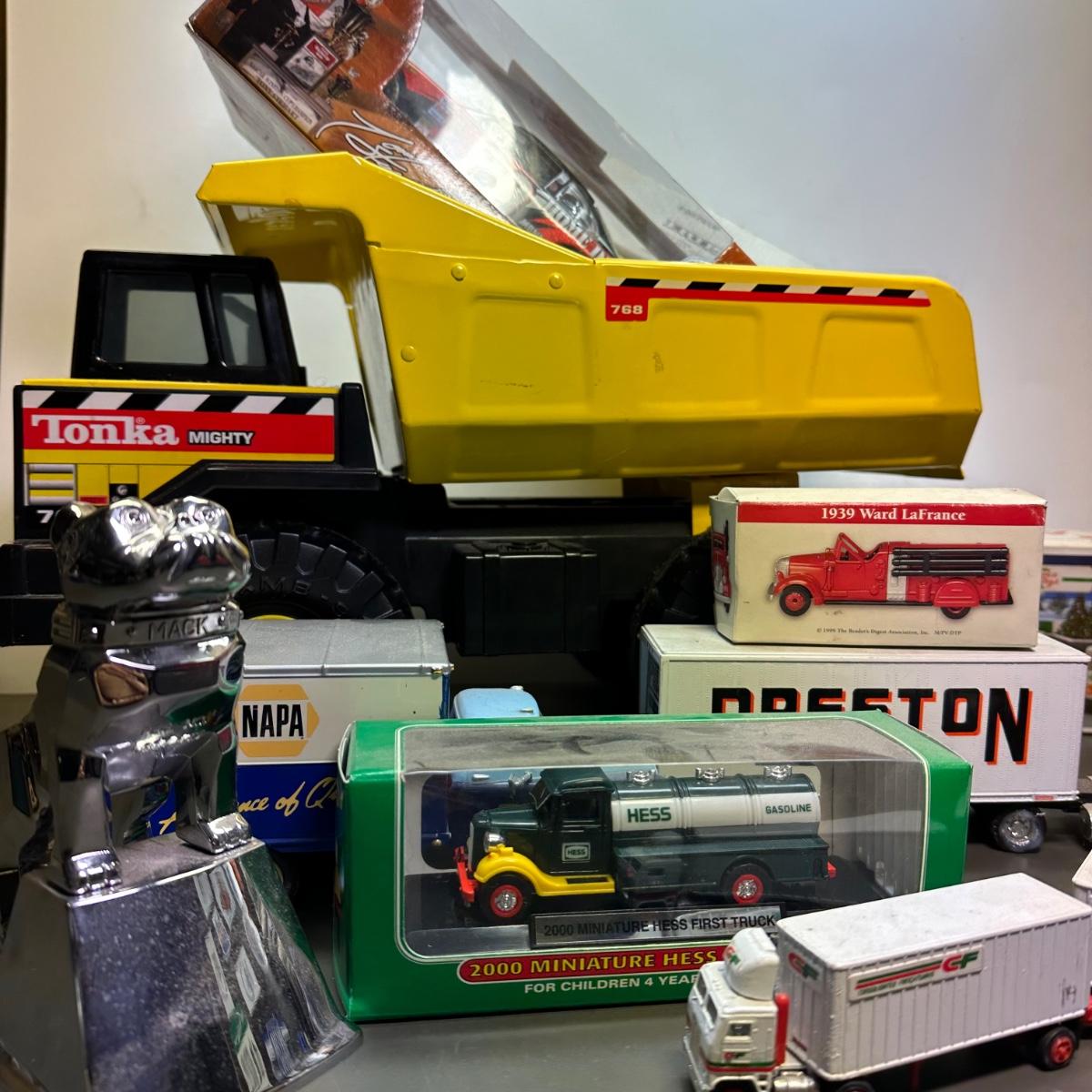 LOT 289B: Vintage Mack Truck Hood Emblem w/ Metal Toy Cars - Tonka, Hess, Napa & More