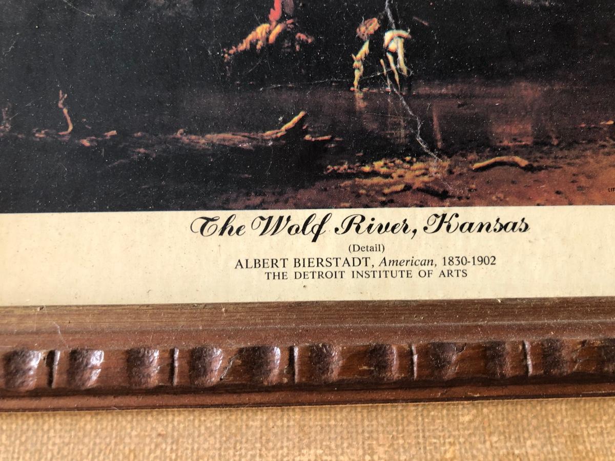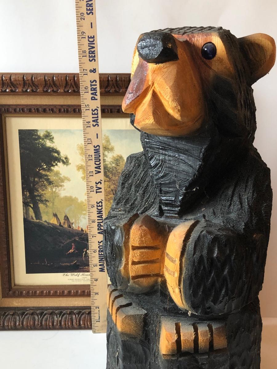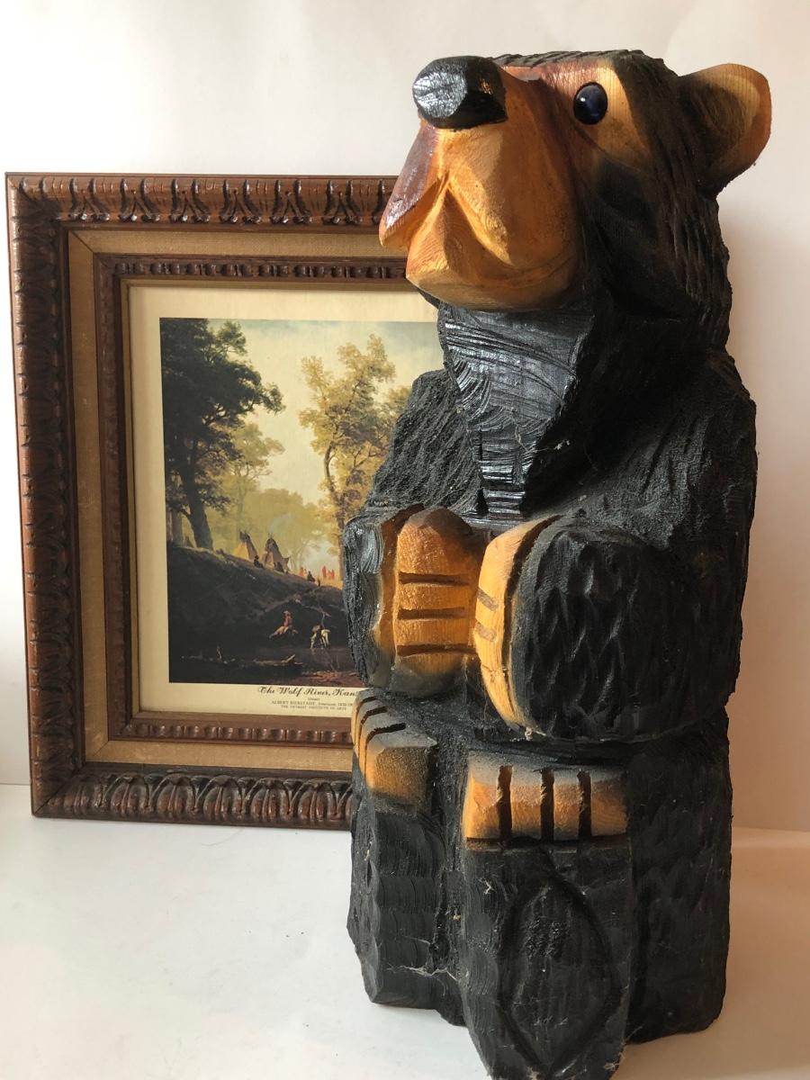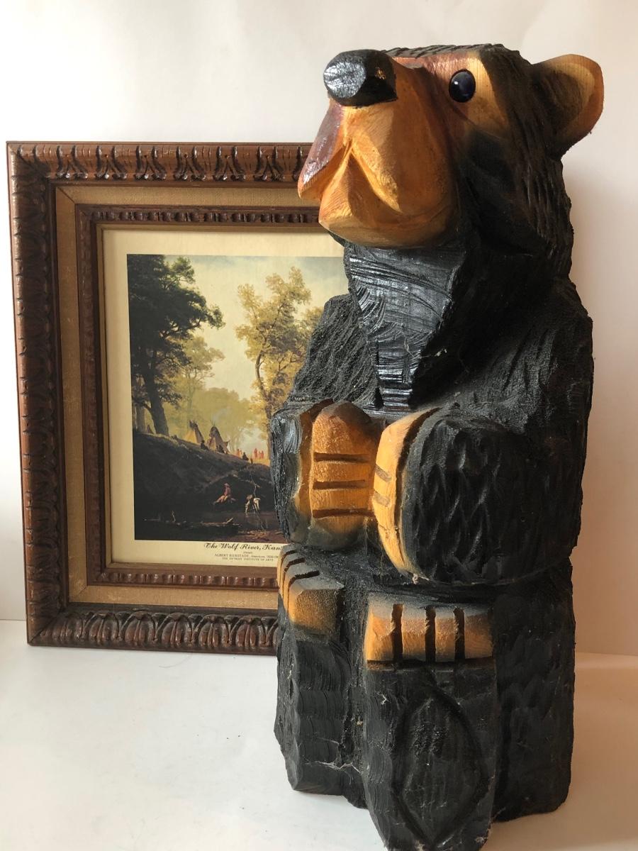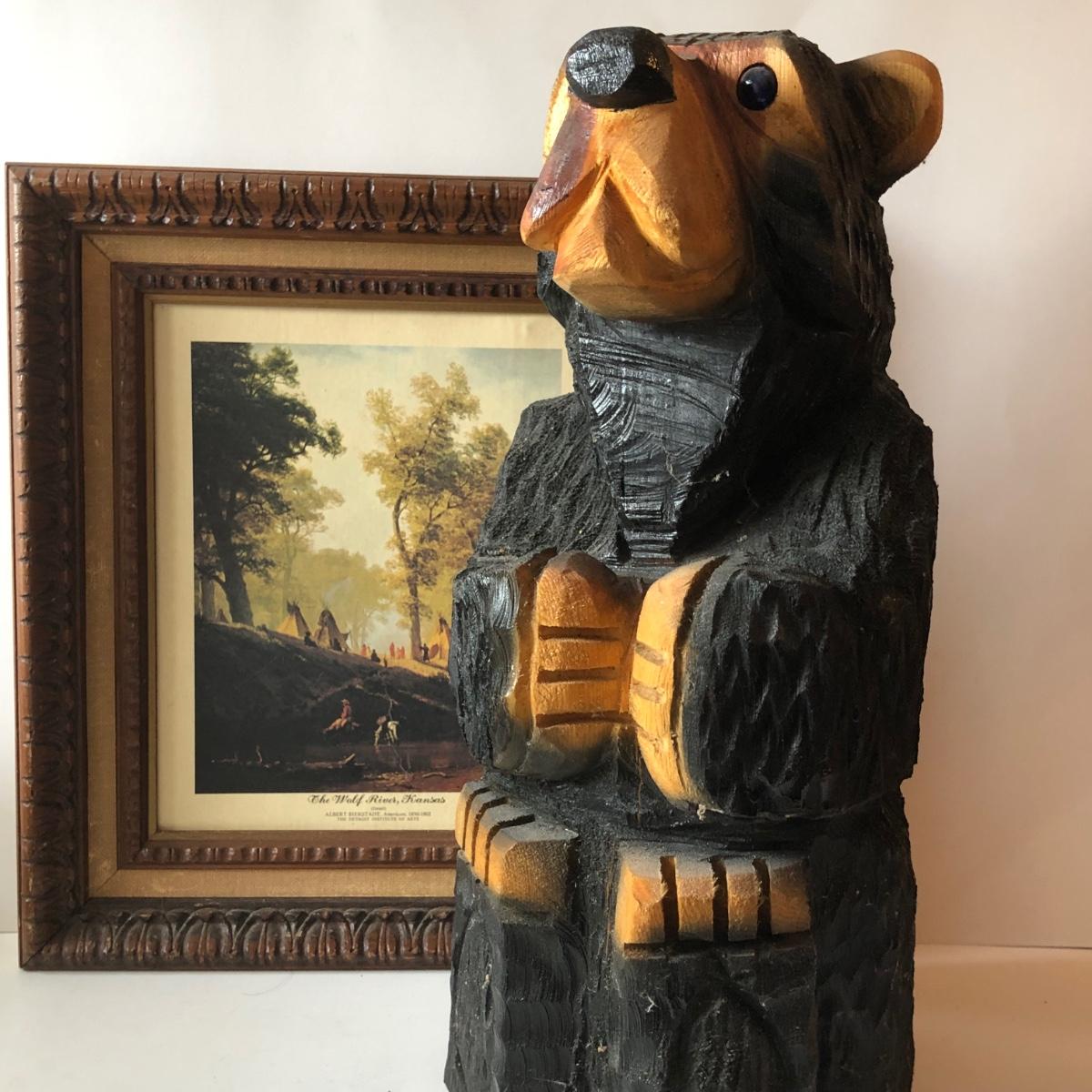 LOT 315U: Carved Wooden Bear w/ Marble Eyes & Framed Albert Bierstadt (American, 1830-1902) The Wolf River Print