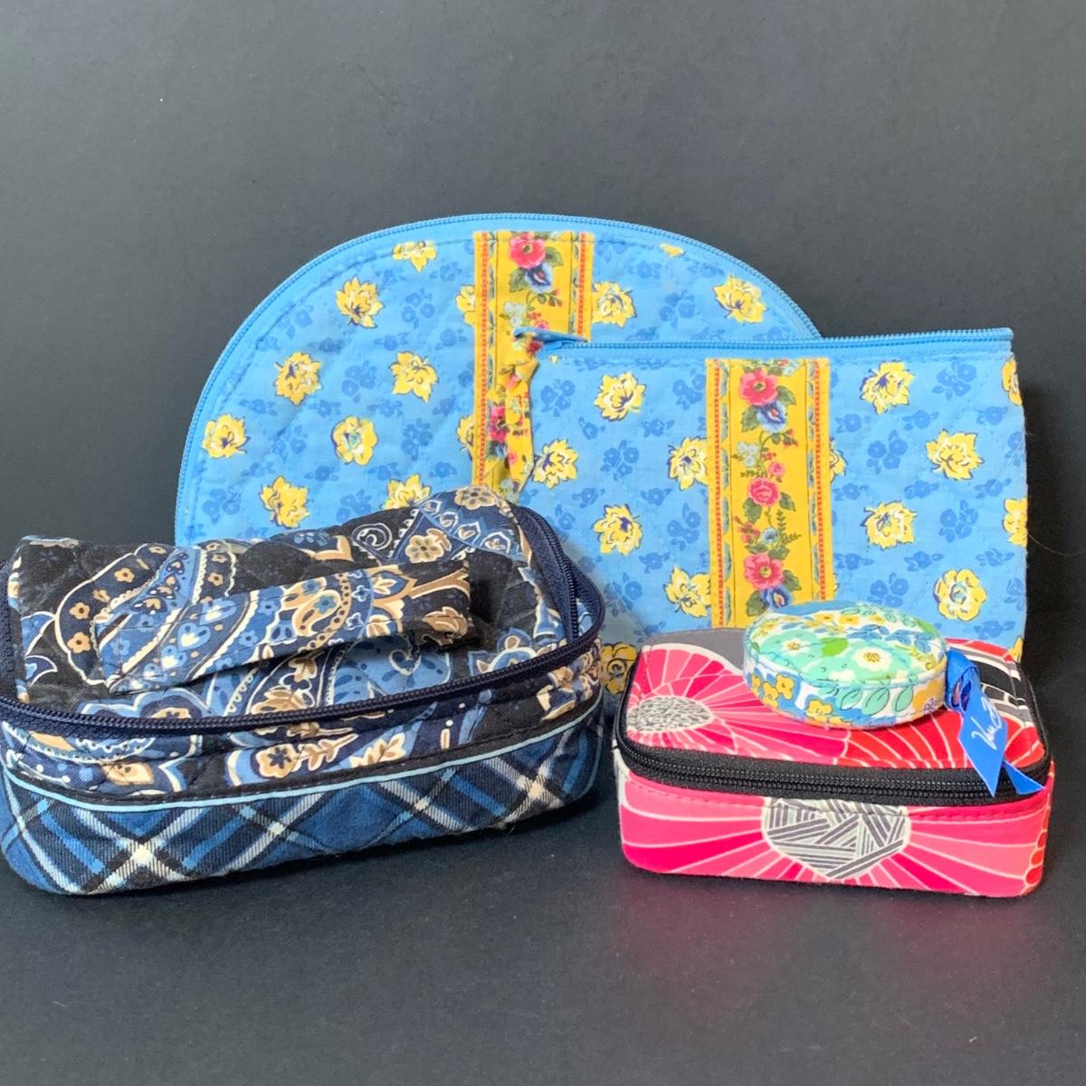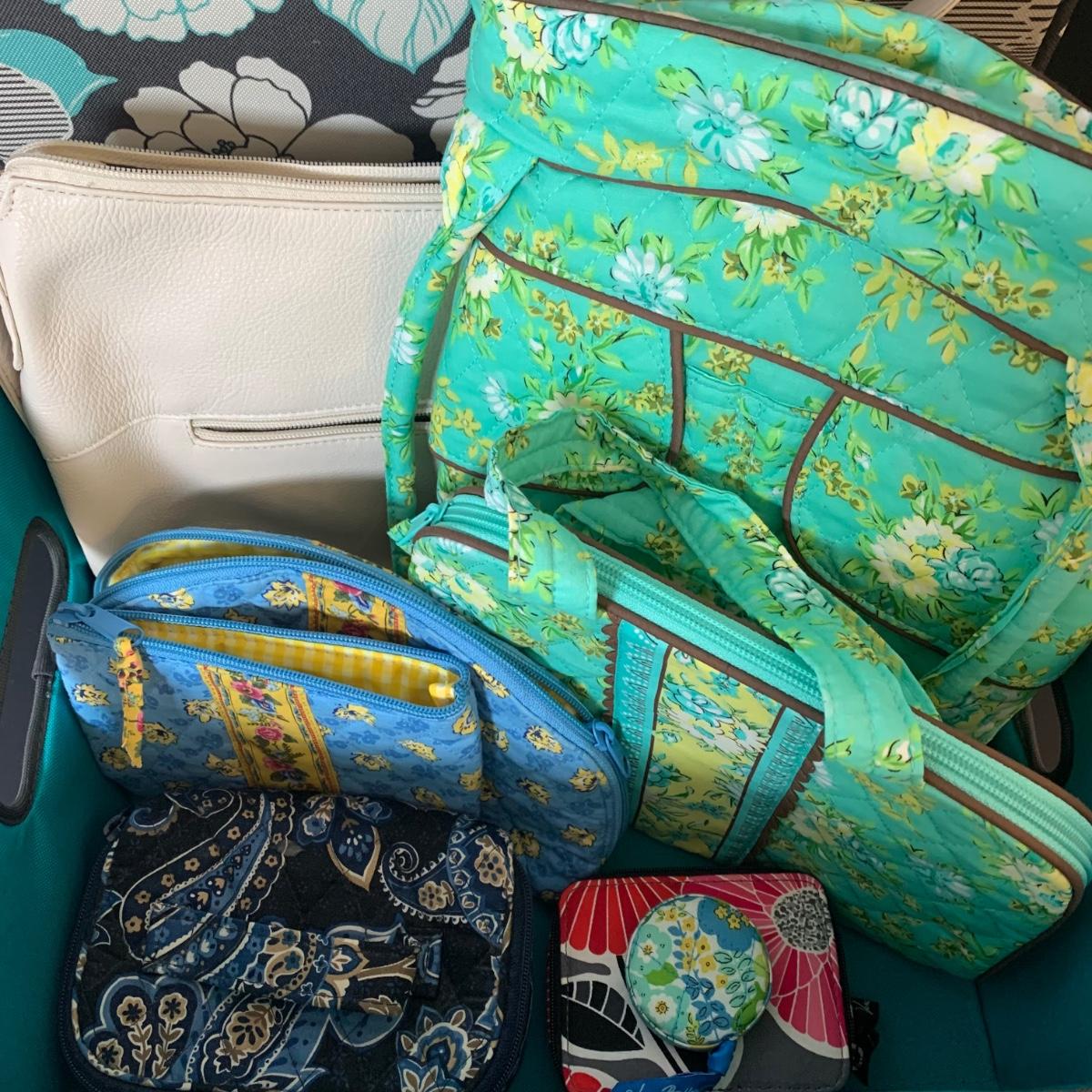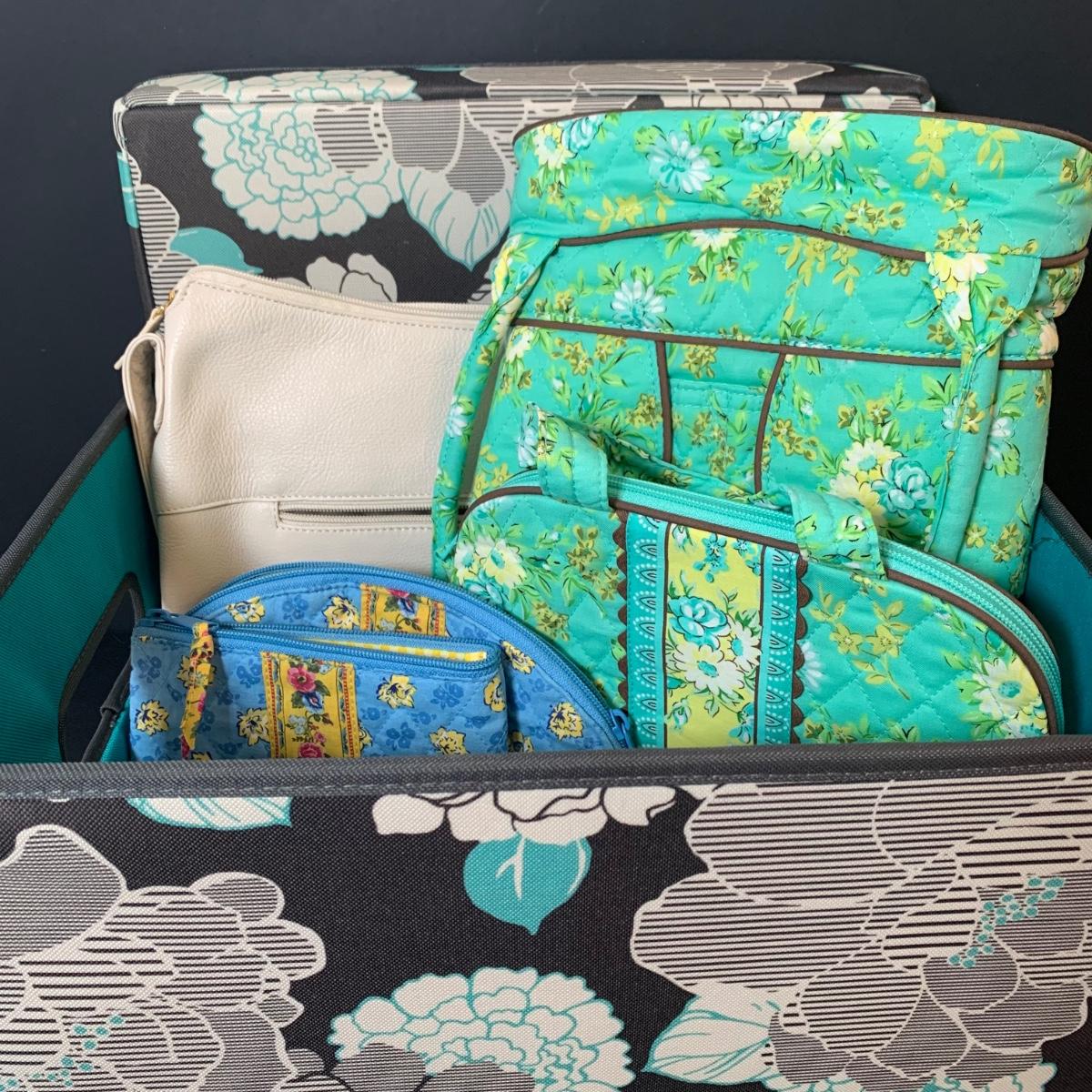 LOT 11: Floral Storage Tote with a Stone Mountain Leather Handbag, Cosmetic Bags & an Overnight Bag
