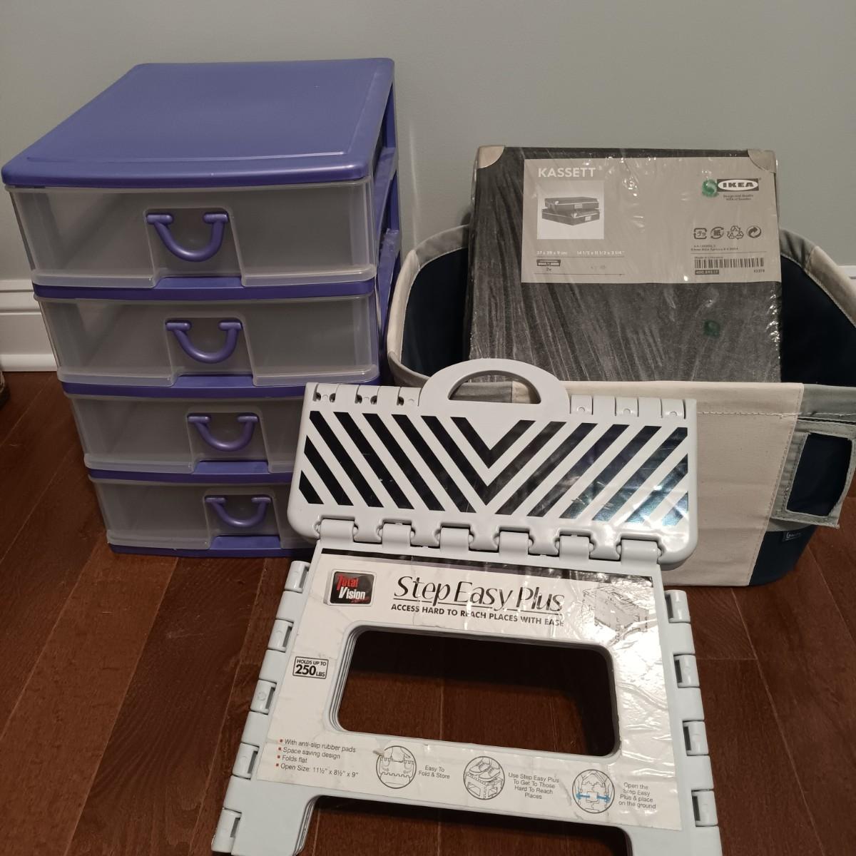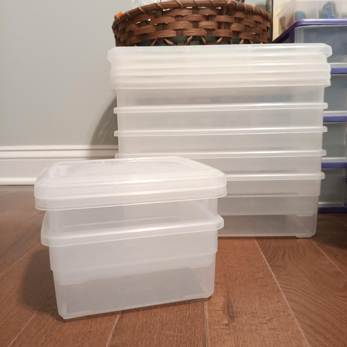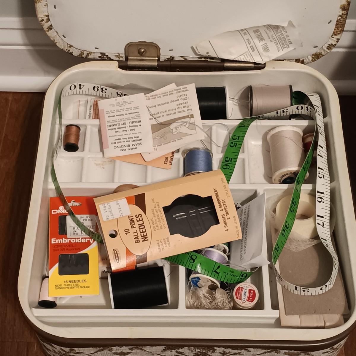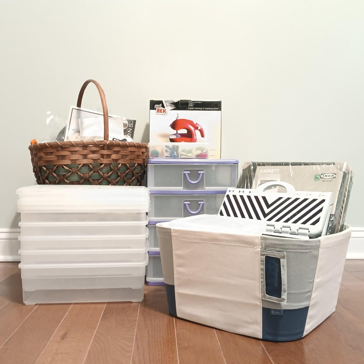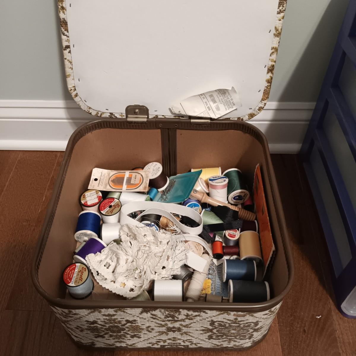 LOT 49: Crafty Lot- Sewing Supplies, Vintage Redmon Sewing Storage Box, Container Store Storage Bins & More
