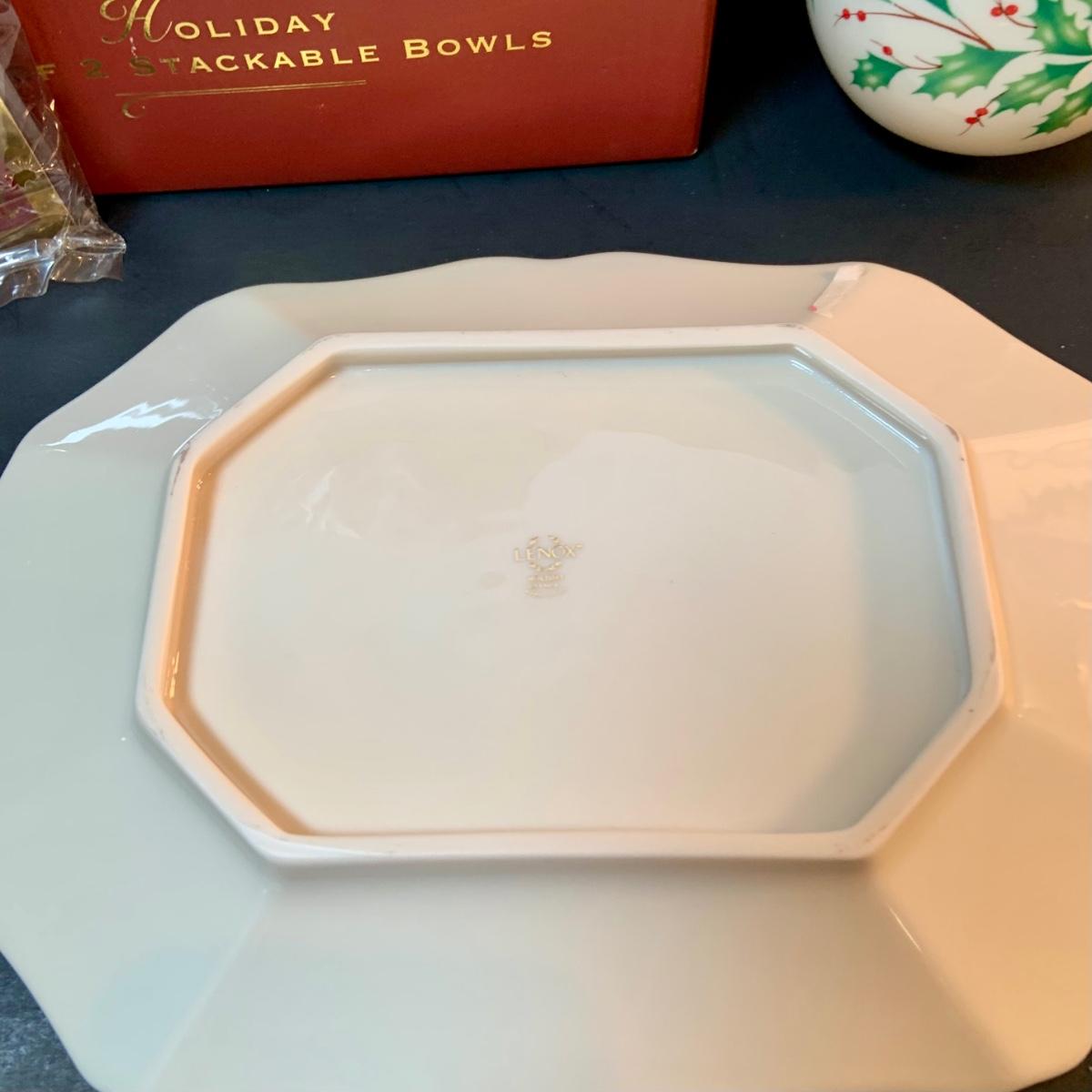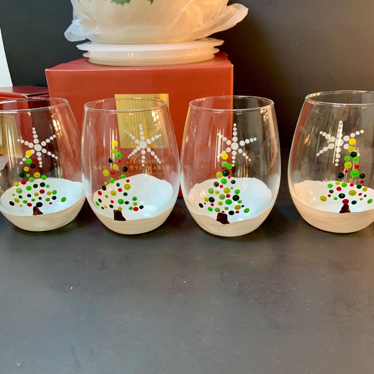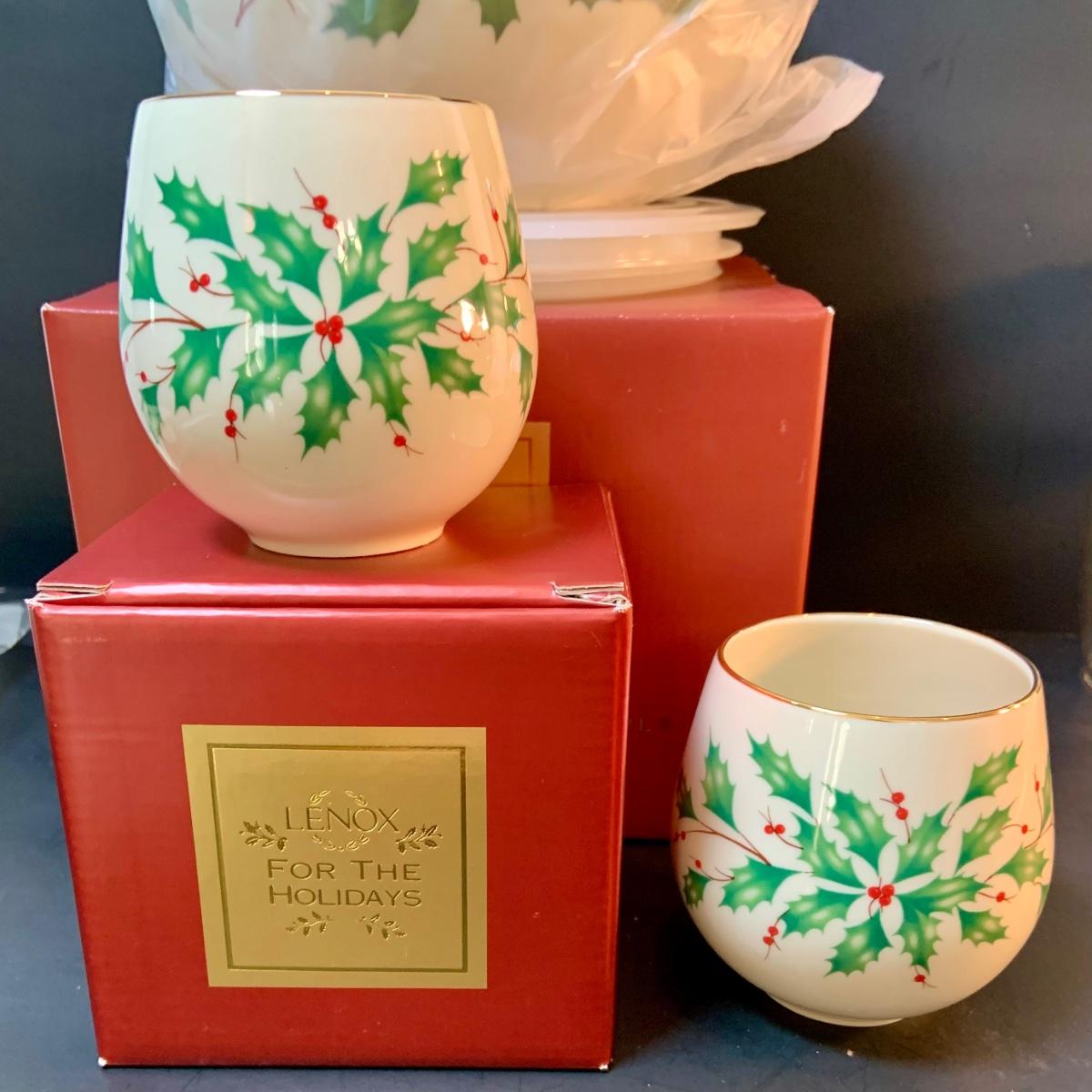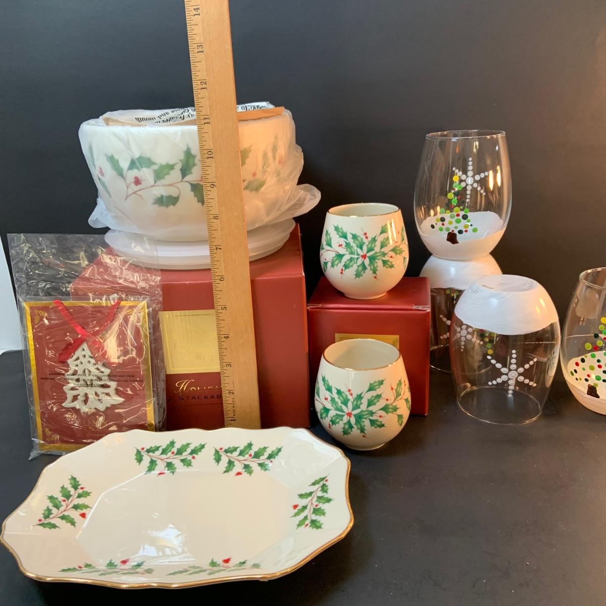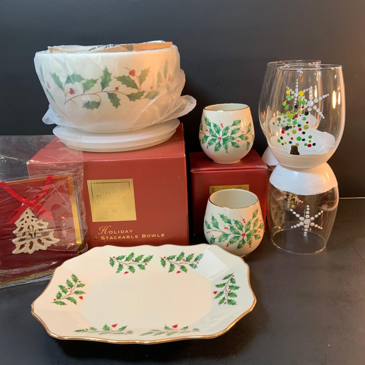 LOT:69: Collection of Lenox Holiday Dishware, Ornament and a Set of Handpainted Wine Glasses