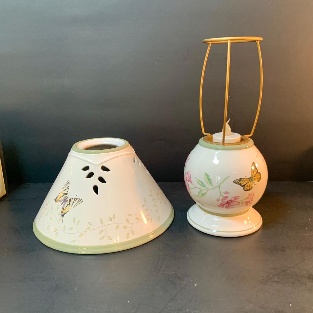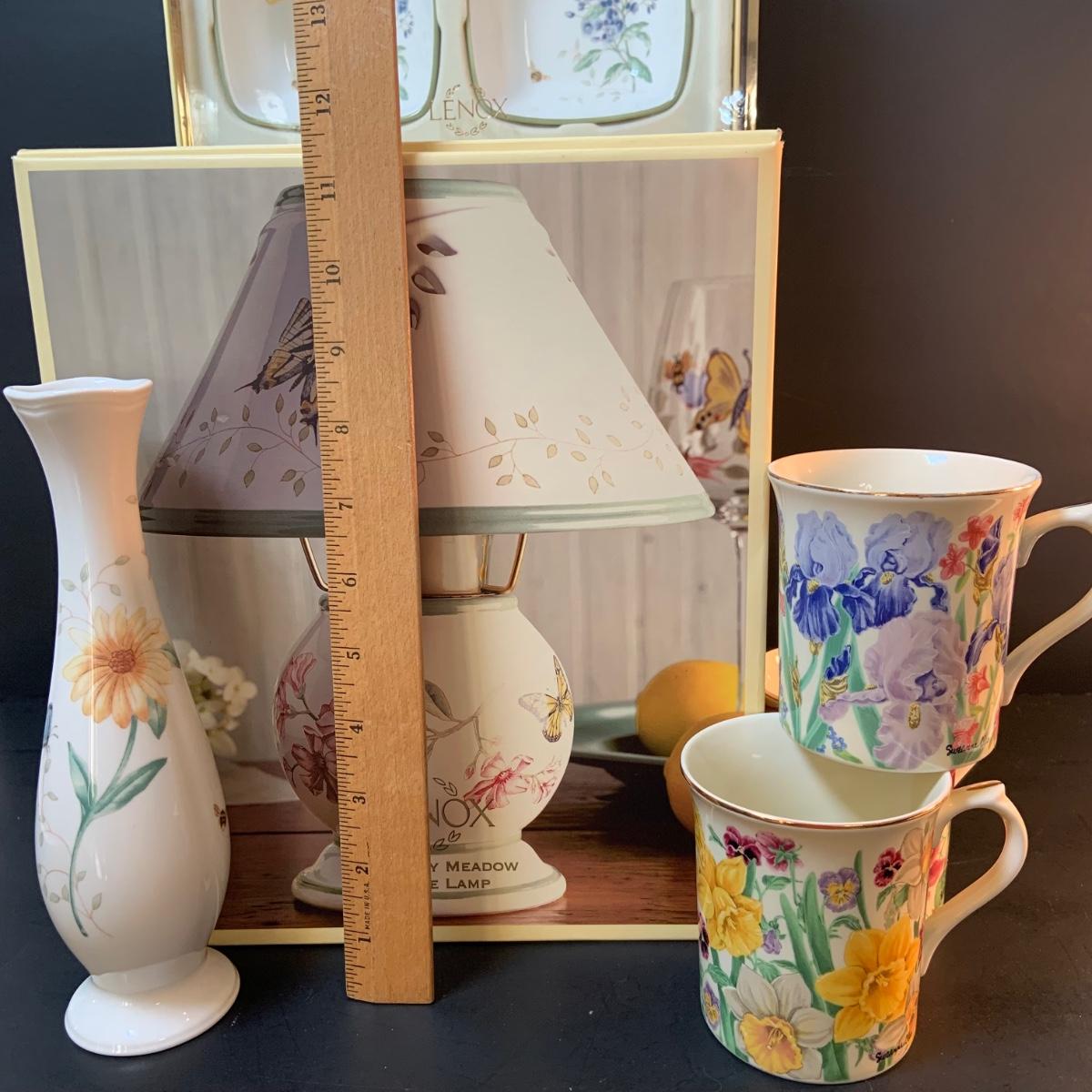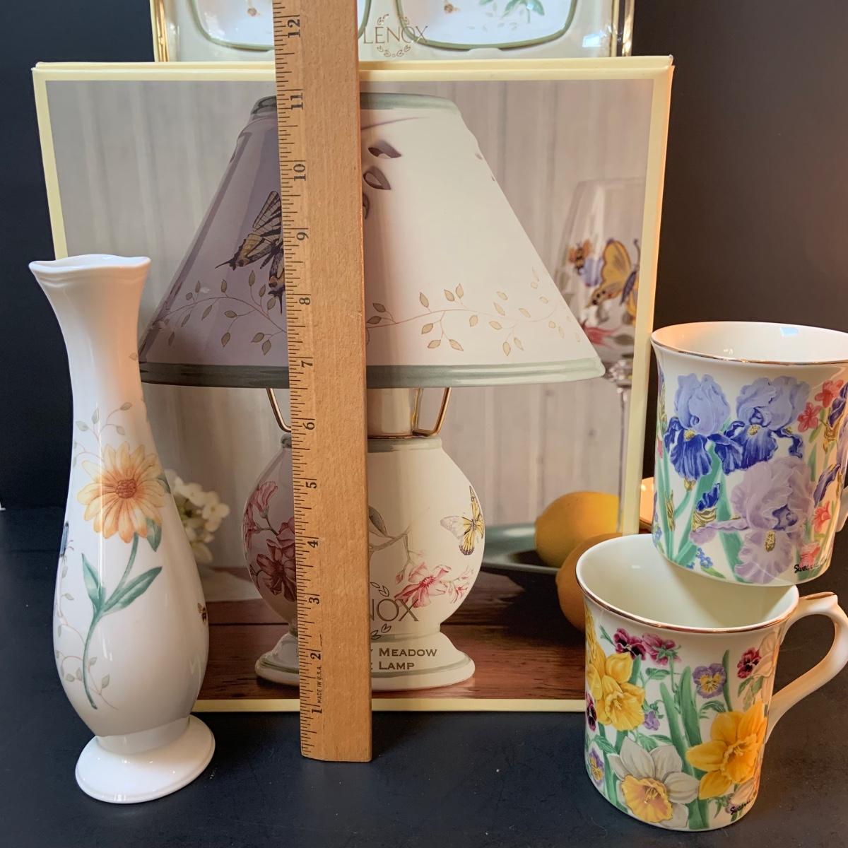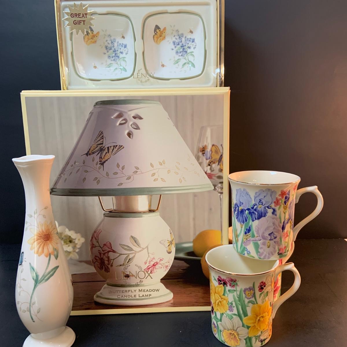 LOT:70: Lenox Spring Themed Collection - Butterfly Meadow Candle Lamp, Bud Vase, Dipping Bowls and Flower Blossom Mugs